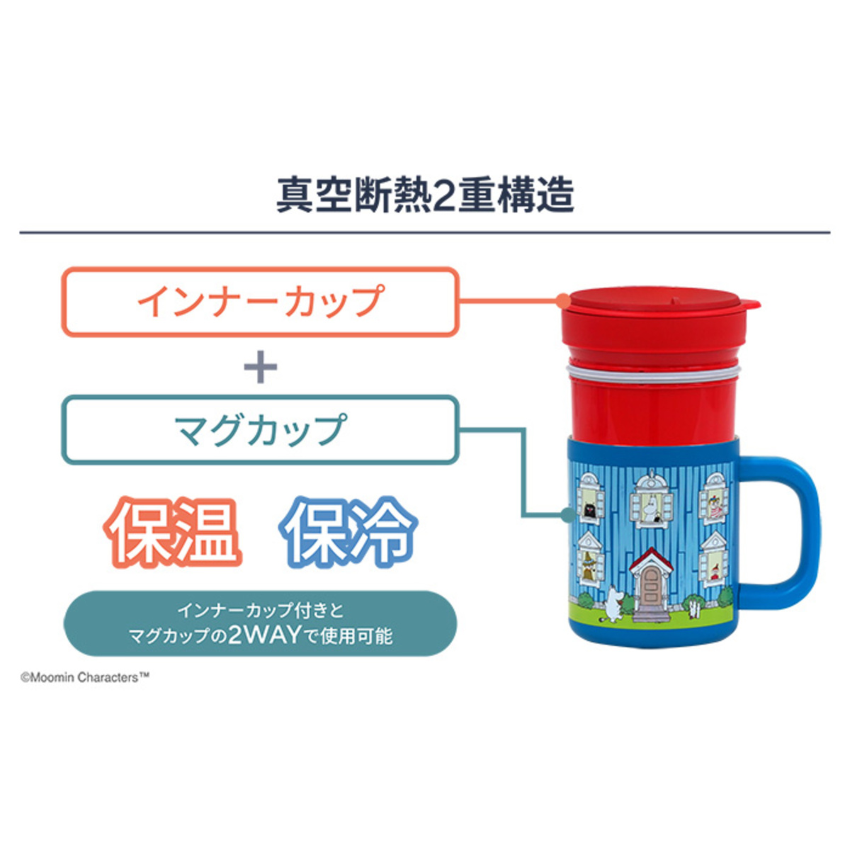 キュートなデザインのマグカップです。真空断熱2重構造のマグカップにインナーカップが付属。インナーカップは、本体から取り出して、温かい飲み物が冷めても電子レンジで手軽に温め直すことができます*
