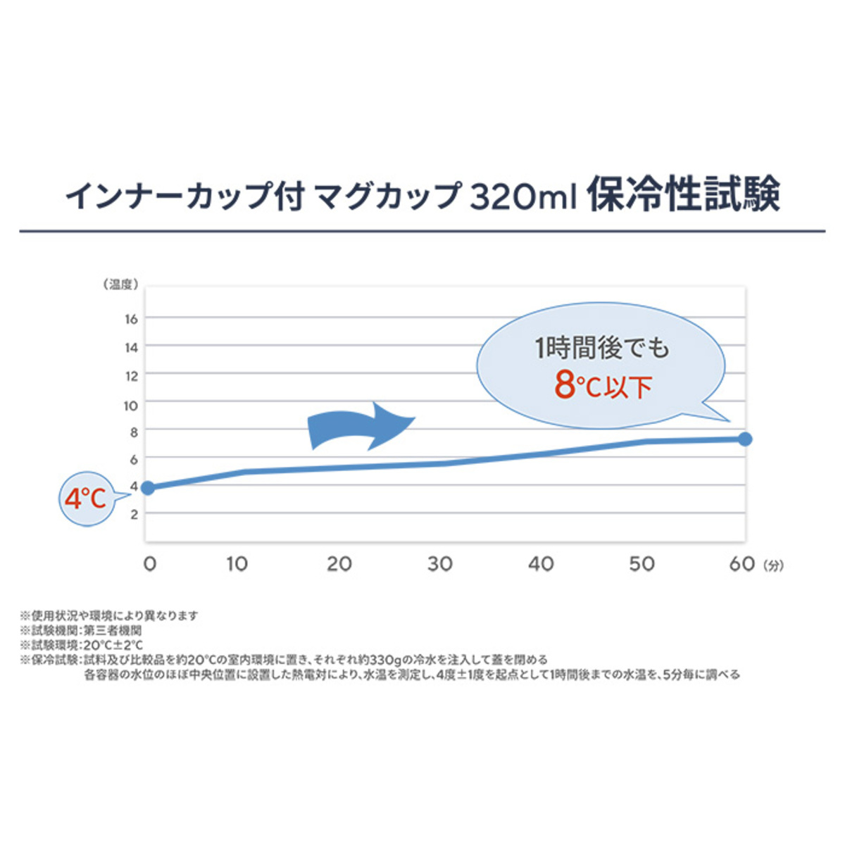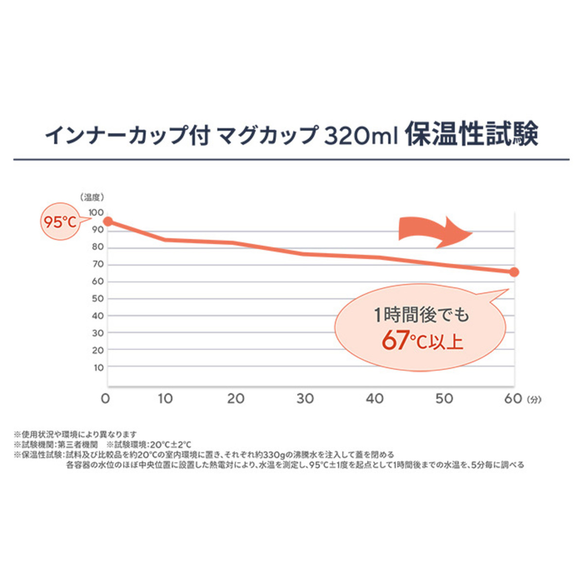 [サイズ] 直径8.4×12.4×12cm [重量] 本体:210g インナーカップ:90g [容量] インナーカップ付き:約320ml マグカップのみ:約330ml [材質] 本体内側・本体外側:ステンレス鋼 ハンドル・フタ・インナーカップ:ポリプロピレン スライドフタ:PBT パッキン:シリコーンゴム 底板:熱可塑性エラストマー [使用方法] ・飲みものの量はフタの下までにして下さい。入れすぎると、こぼれやあふれの原因となり危険です ※本体に少量の冷水(熱湯)を入れ、1分程度予冷(予熱)すると効果的です。インナーカップをマグカップにセットする際は、マグカップを手で固定し、インナーカップを回しながら取り付けて下さい [お手入れ] ・ご使用ごとに柔らかいスポンジできれいに洗い、充分乾燥させて下さい(アルカリ性洗剤、オレンジオイル系洗剤は使用しないで下さい) ・ステンレスを使用していますが、内側に、水質や不純物などにより、サビのような赤い斑点ができることがあります。このような場合は10%ほどのお酢を加えたお湯を入れ約30分後、柔らかいスポンジできれいに洗った後、充分にゆすいで下さい ・保管するときは、汚れを落として充分に乾燥させて下さい <パッキンの取り付け方> ・パッキンは突起のあるほうが外側になるように取り付けて下さい ※パッキンは正しく取り付けて下さい。作動不良、水漏れの原因になります ※フタパッキンとインナーカップパッキンは同じサイズです ■取り扱い説明を充分にご確認の上、ご使用下さい 【中国製】 [注意事項] ※使用可能:電子レンジ(インナーカップ) ※使用不可:漂白剤、食器洗い機、オーブンレンジ ※インナーカップは、本体から取り出して電子レンジや食器洗い乾燥機で使用できます ※飲み物の保冷、保温以外に使用しないで下さい ※火のそばに置かないで下さい ※オーブン、直火では使用できません ※倒したり、ぶつけたりして強い衝撃を与えないで下さい ※飲み物の量はフタ下端の位置までにして下さい ※使用前にフタ、フタパッキンが正しく装着されているかご確認下さい ※熱い飲み物を飲む時は急に傾けずにゆっくり飲んで下さい ※熱い飲み物を入れた場合は、飲み口が熱くなる場合があります。やけどに注意して下さい ※ドライアイスは入れないで下さい ※冷凍庫には入れないで下さい ※電子レンジで加熱する時はインナーカップのみを加熱して下さい(スパークして危険です) ※フタは完全密閉ではありません。飲み物を入れた状態で横にしないで下さい ※携帯電話、デジタルカメラ、パソコンなどの精密機器と一緒に持ち運ばないで下さい ※走行中は車内や衣類を汚したり、やけどの原因になり危険ですので、運転しながらの使用はしないで下さい ※フタを持って持ち運ばないで下さい ※ワレ、かけ、ひび等が見つかった場合は、ただちに使用を中止して下さい ※インナーカップに飲み物を入れた状態で、本体へ取り付けたり本体から取り外す場合は、飲み物がこぼれないように十分に注意して下さい ※インナーカップ以外は自動食器洗浄機、食器乾燥機は使用しないで下さい ※煮沸しないで下さい ※本体のつけ置き洗いはしないで下さい ※洗浄する場合は食器用中性洗剤を柔らかいスポンジにつけて洗って下さい ※たわし、研磨剤入りのスポンジ、みがき粉などは使用しないで下さい ※直射日光のあたる場所に長時間放置しないで下さい ※プリント部分に油が付いた状態で高温下に放置するとプリントが剥がれることがありますのでご注意下さい。また油分を含んだ湯水の中につけないで下さい ※アルカリ性洗剤又はオレンジオイル系洗剤は図柄剥離や変色することがありますので使用しないで下さい ※幼児の手の届くところには置かないで下さい。また、いたずらには充分注意して下さい ※誤った使用方法に起因する損害は一切補償いたしません <電子レンジでの注意> ※電子レンジ使用の際はフタ、本体を外して下さい ※空炊きはしないで下さい ※電子レンジ加熱後は容器が熱くなっておりますので、やけどに注意して下さい ※高周波加熱専用であるため、直火、オーブン及びグリルでの使用をしないで下さい ※容器、電子レンジの表示及び取扱い説明書を充分に確認の上、ご使用下さい ※飲み物が少量の場合は、1回の加熱時間を短くし、数回に分けて加熱して下さい ※オート加熱、おまかせ加熱では使用しないで下さい ※連続加熱はしないで下さい。温度が上がり過ぎて変形の恐れがあります <食器洗い乾燥機使用時> ※本品を重ね置きしないで下さい。変形する恐れがあります ※食器洗い乾燥機の表示及び取扱い説明書を充分に確認の上、ご使用下さい ※本品を食器洗い乾燥機のヒーター部分に落とさないで下さい