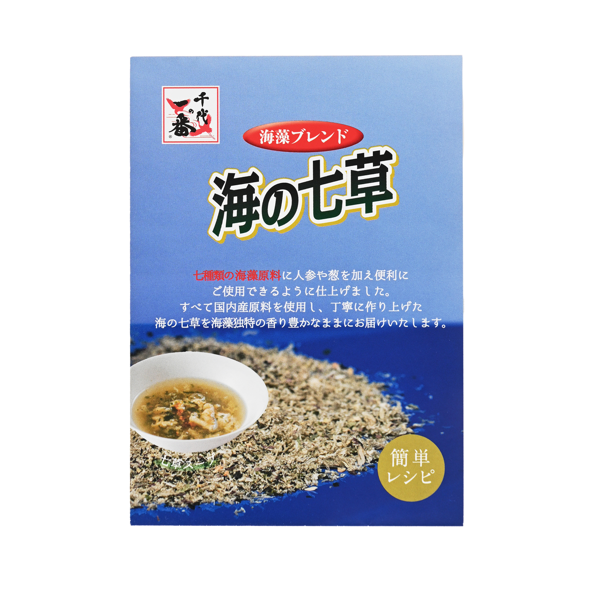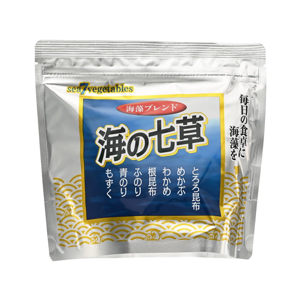 [アレルギー物質特定原材料8品目] なし [セット内容] ・海の七草70g×2袋 ・海の七草レシピ×1枚 [保存方法] 開封前:高温多湿・直射日光を避け、常温で保存してください 開封後:開封後はチャックを閉めて冷蔵庫にて保存し、お早目にお召し上がりください [お召し上がり方] 味付けをしたスープの中にお好みの分量の七草を入れてお召し上がりください。溶き卵を入れると玉子スープが出来上がります。固めに茹でたそうめんを味付けしたスープに入れて七草・ごま油を加えると油そうめんが出来上がります [注意事項] ※特定原材料のうち、卵、乳成分、小麦、えび、かにを使用した設備で製造しています [原料原産地] とろろ昆布(昆布、根昆布、醸造酢、米酢)(国内製造) [原産国] 日本 [原材料] とろろ昆布(昆布、根昆布、醸造酢、米酢)(国内製造)、乾燥めかぶ、乾燥人参、乾燥わかめ、乾燥ふのり、乾燥ねぎ、青のり粉、乾燥もずく