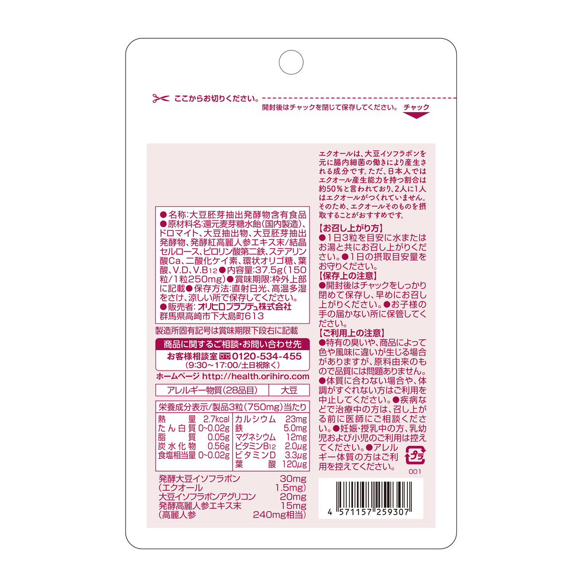 [アレルギー物質特定原材料8品目] なし [内容量] 150粒 [目安量] 1日3粒 [保存方法] 直射日光、高温多湿をさけ、涼しい所で保存してください [栄養成分表示] 3粒(750mg)当たり 熱量 2.7kcal たん白質 0〜0.02g 脂質 0.05g 炭水化物 0.56g 食塩相当量 0〜0.02g [お召し上がり方] 1日3粒を目安に水またはお湯と共にお召し上がりください [注意事項] ※特有の臭いや、商品によって色や風味に違いが生じる場合もありますが、原料由来のもので品質には問題ありません ※体質に合わない場合や、体調がすぐれない方はご利用を中止してください ※疾病などで治療中の方は、召し上がる前に医師にご相談ください ※妊娠・授乳中の方、乳幼児および小児のご利用は控えてください ※アレルギー体質の方はご利用を控えてください ※開封後はチャックをしっかり閉めて保存し、早めにお召し上がりください ※お子様の手の届かない所に保管してください ※食生活は、主食、主菜、副菜を基本に、食事のバランスを [原料原産地] 還元麦芽糖水飴(国内製造) [原産国] 日本 [原材料] 還元麦芽糖水飴(国内製造)、ドロマイト、大豆抽出物、大豆胚芽抽出発酵物、発酵紅高麗人参エキス末/結晶セルロース、ピロリン酸第二鉄、ステアリン酸 Ca、二酸化ケイ素、環状オリゴ糖、葉酸、V.D、V.B12