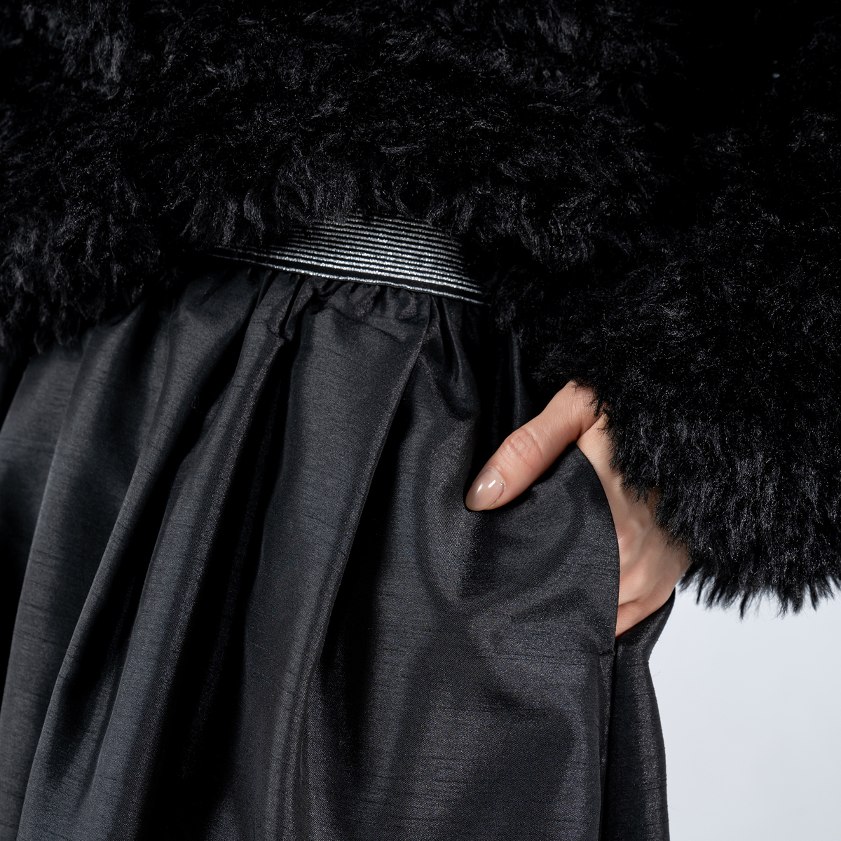 張り感のあるシャンタン素材を使用した、バルーンシルエットのスカート。軽やかな質感を活かし、裏地で吊ったボリュームが丸みのあるフォルムを生み出します。ウエストにはラメ入りの平ゴムを採用し、細部までこだわった仕上がり。華やかさと存在感を兼ね備えた一着で、着こなしに新鮮なアクセントをプラスします
