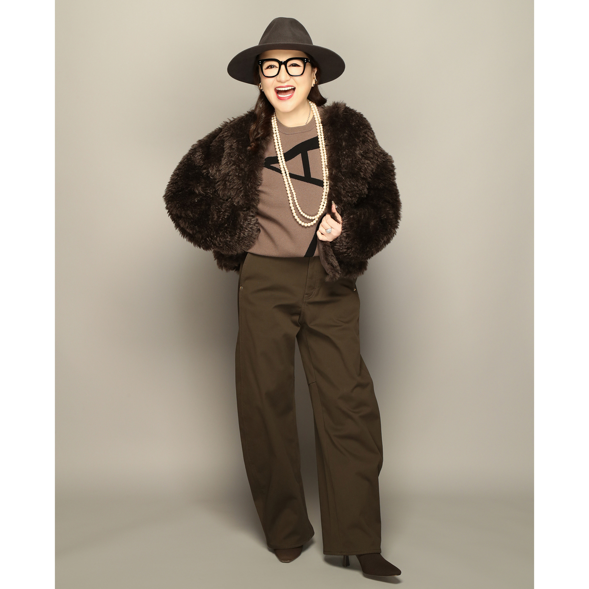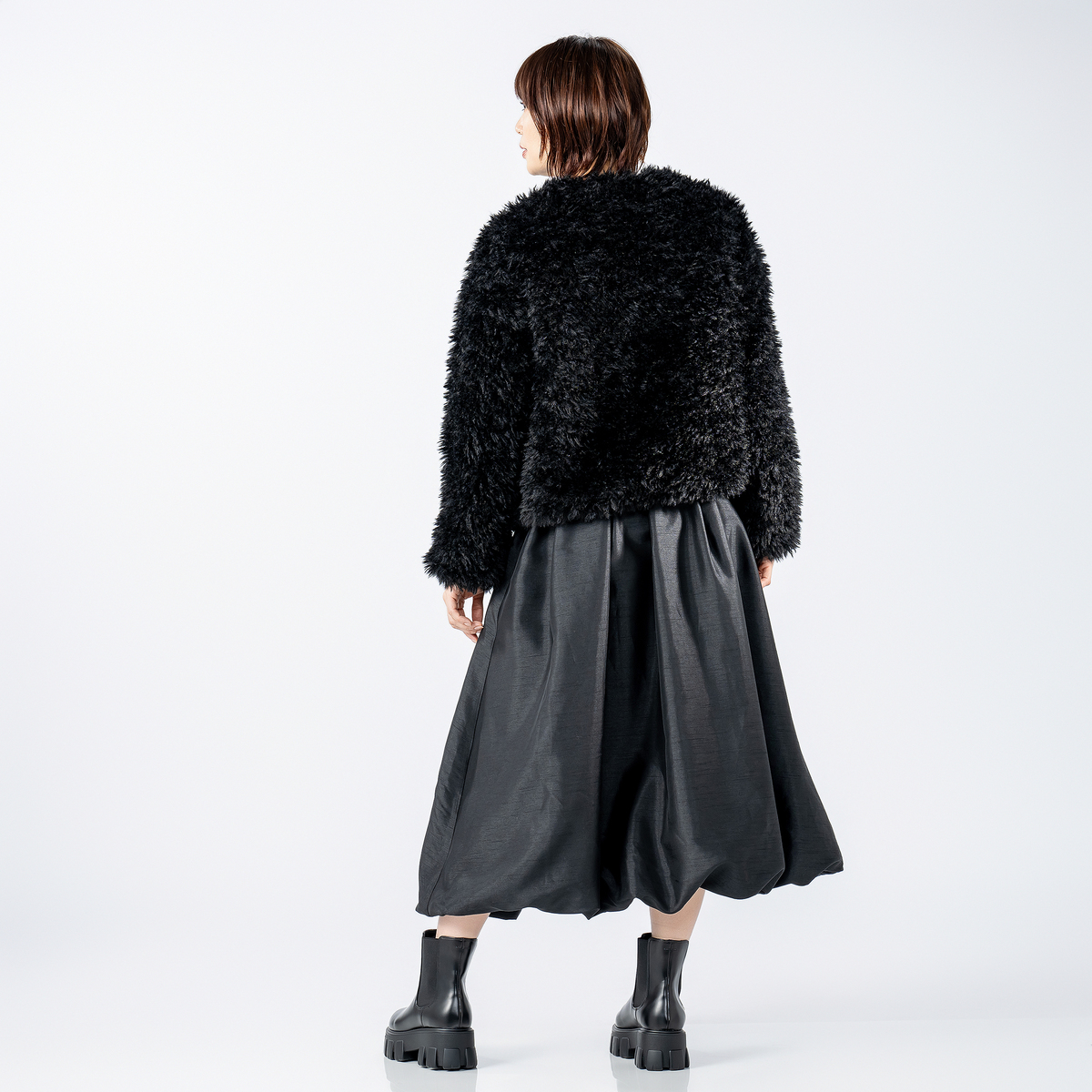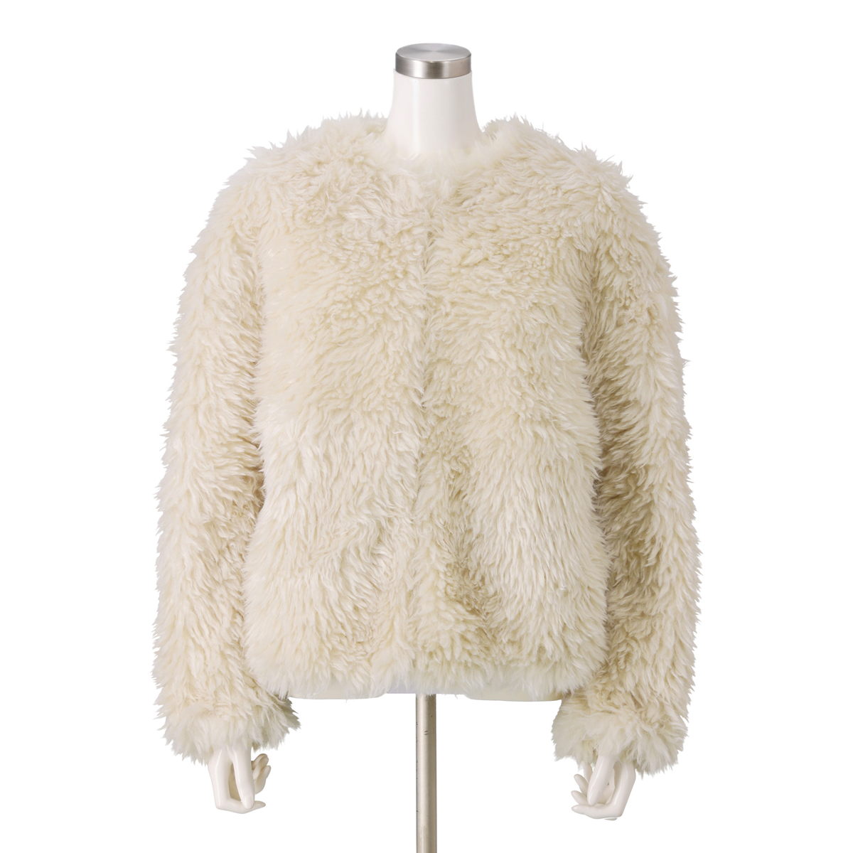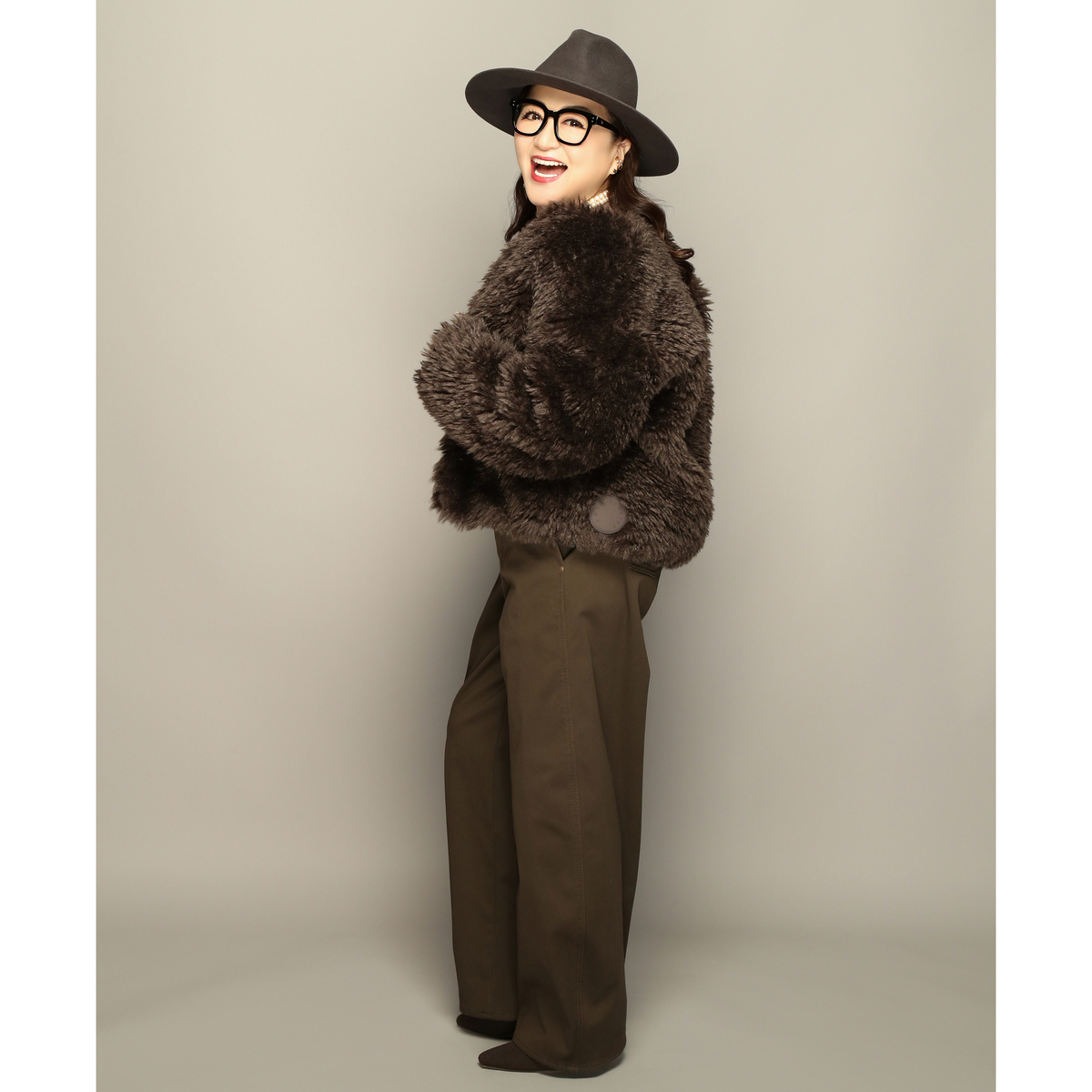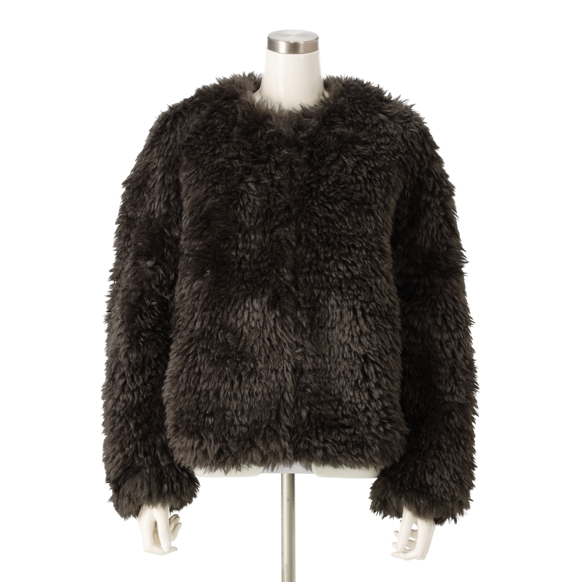 ラムファー風のカールした生地で仕立てた中綿入りのノーカラーブルゾン。さっと羽織るだけでコーデを華やかに演出します