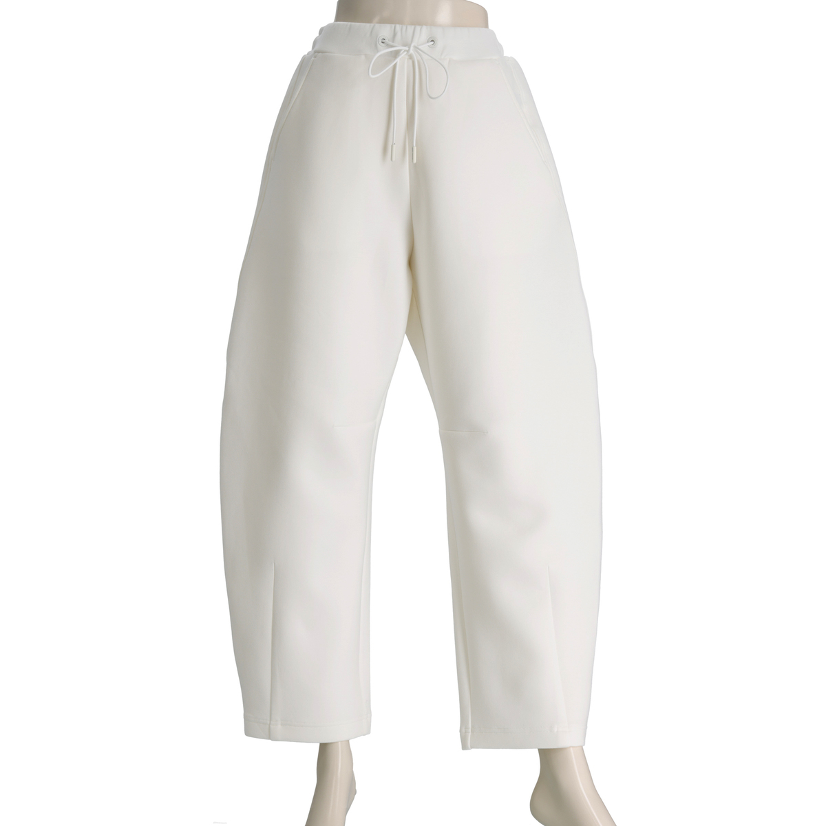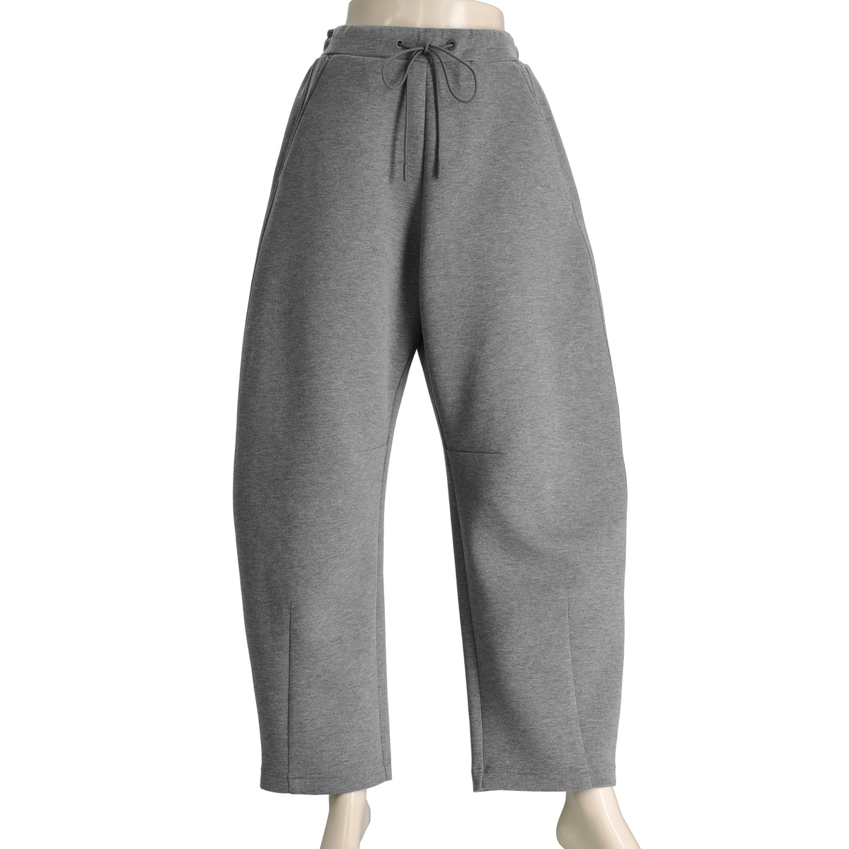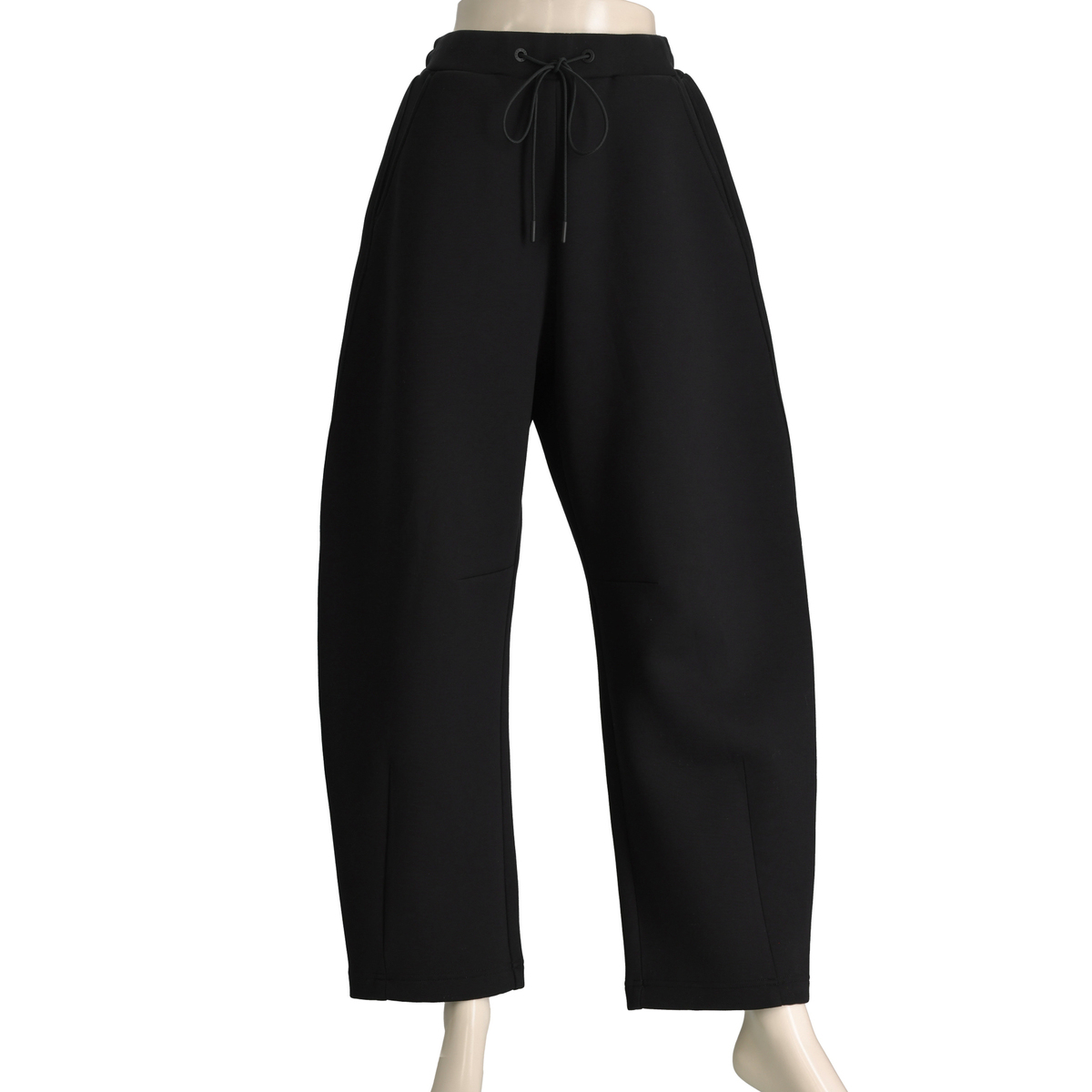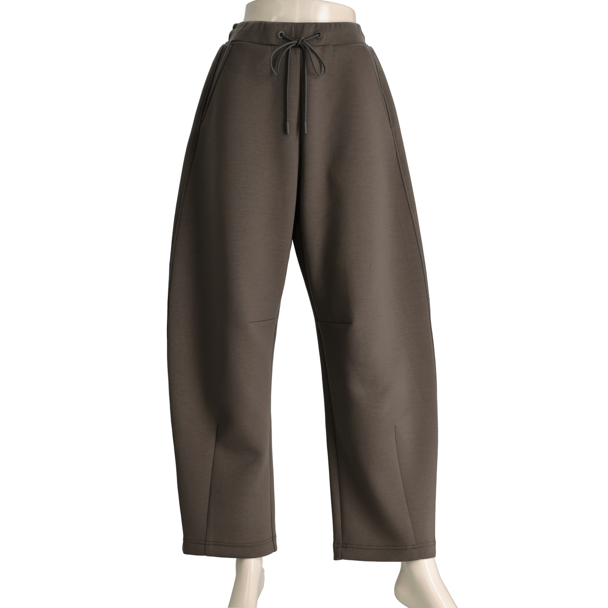 伸びの良いダンボールニットを使ったバレルパンツ。総ゴムウエストに同色スピンドルを通し、ロゴ入りハトメやチップ型ループエンドで細部までこだわりました。快適な穿き心地と丸みのあるシルエットで、スタイルに新鮮さをプラスします