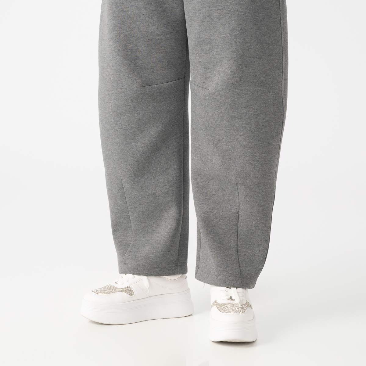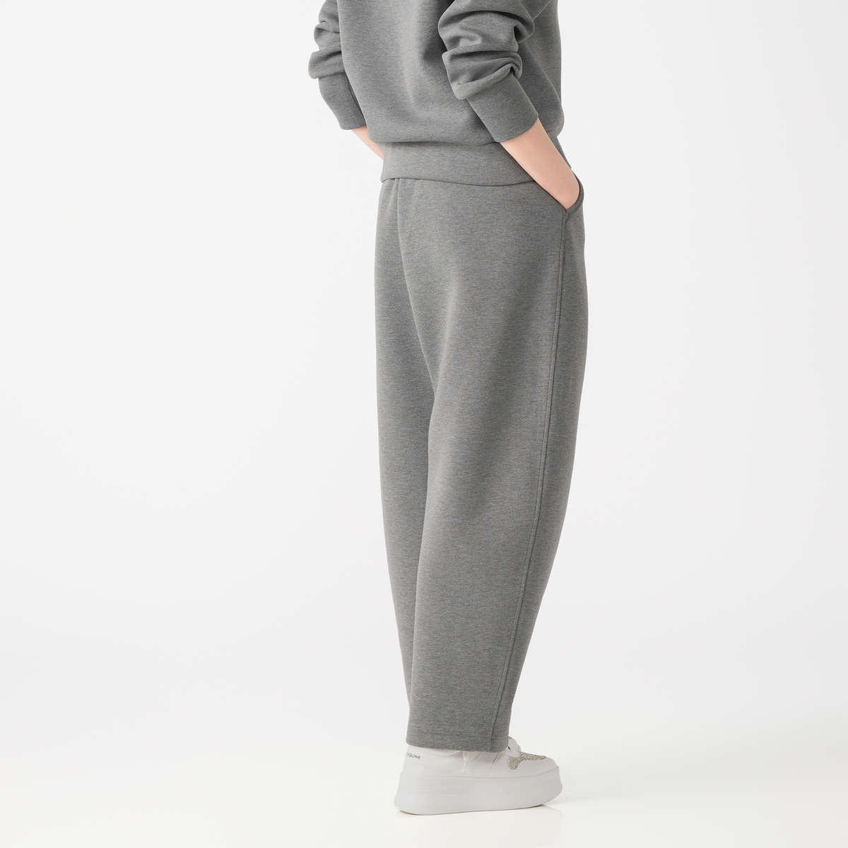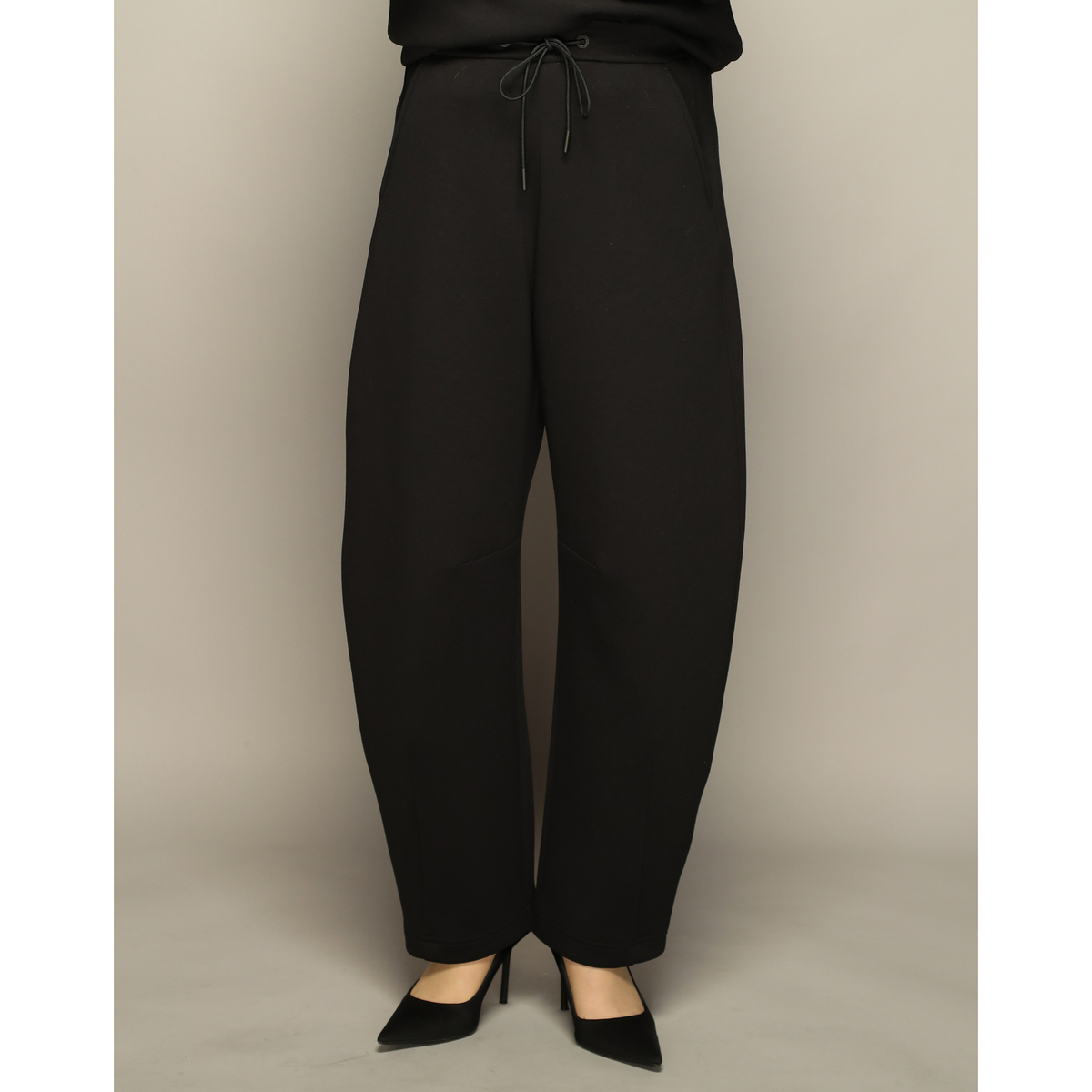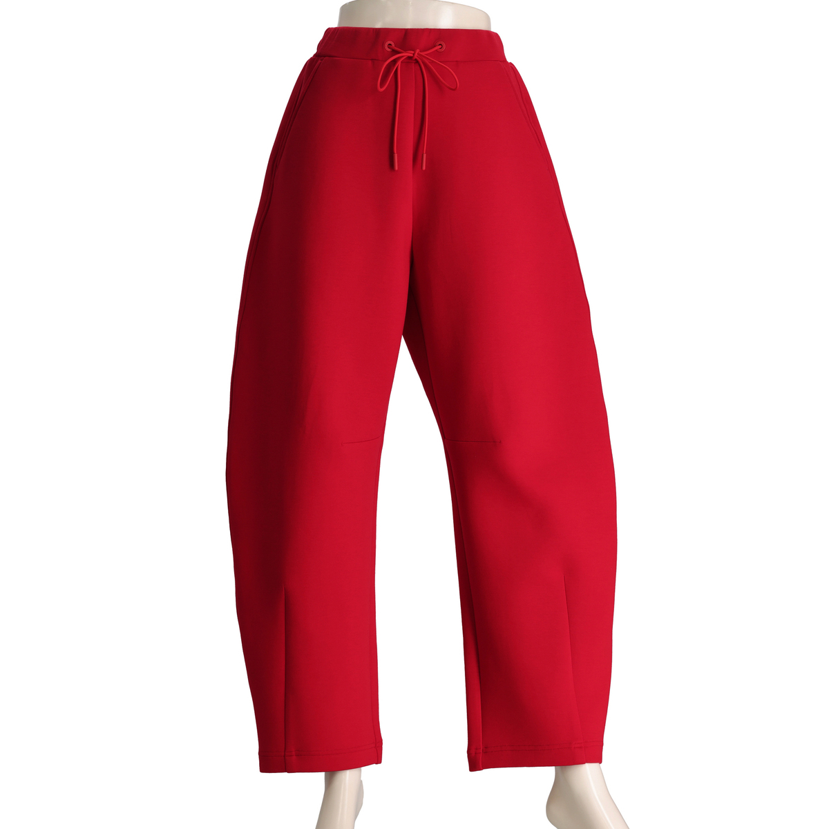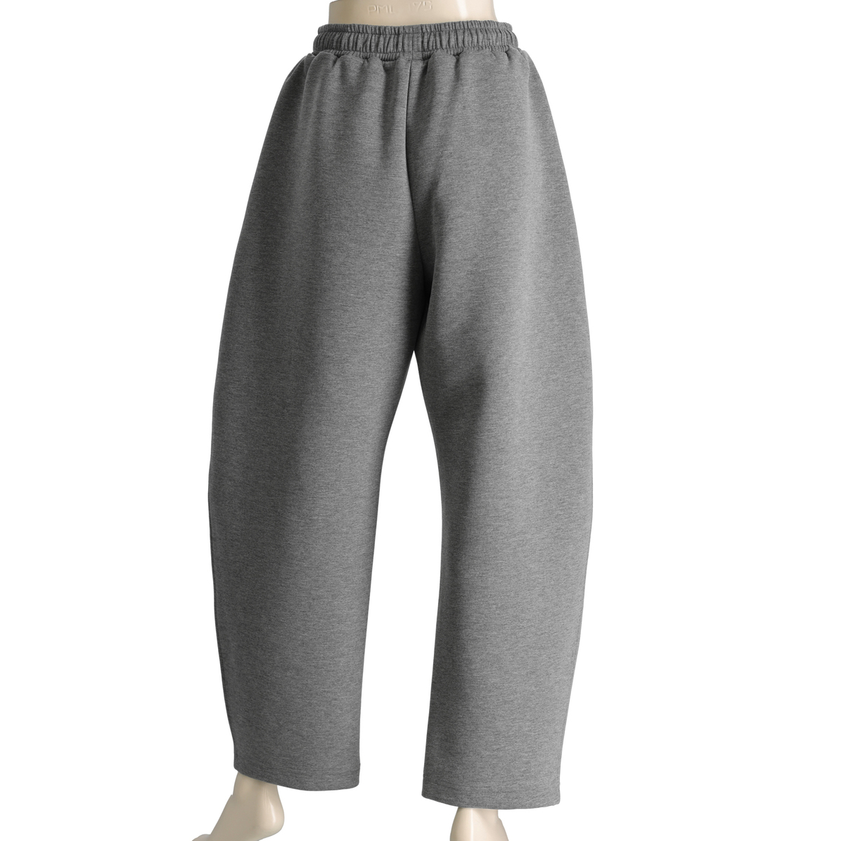 伸びの良いダンボールニットを使ったバレルパンツ。総ゴムウエストに同色スピンドルを通し、ロゴ入りハトメやチップ型ループエンドで細部までこだわりました。快適な穿き心地と丸みのあるシルエットで、スタイルに新鮮さをプラスします