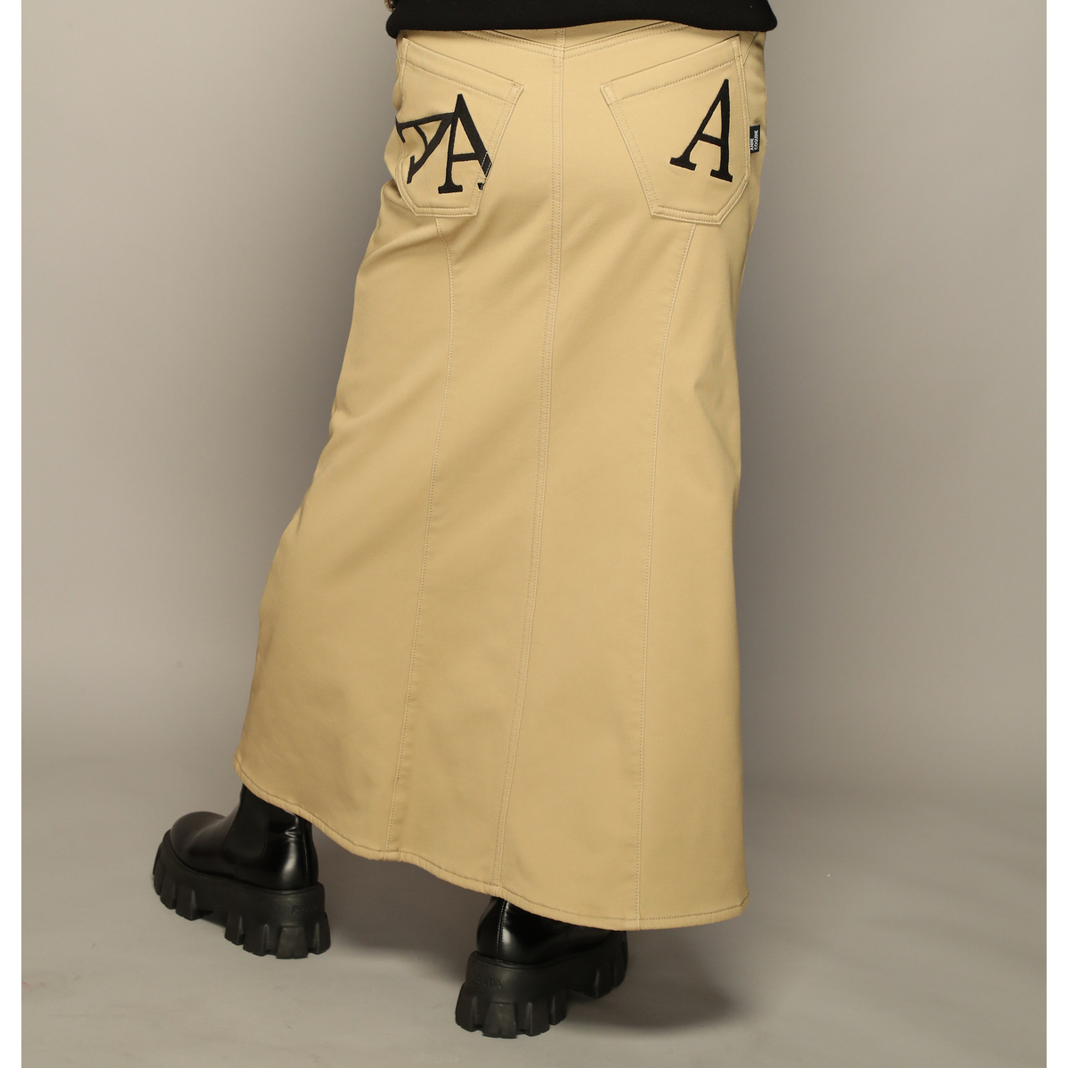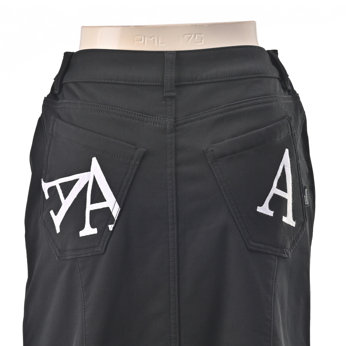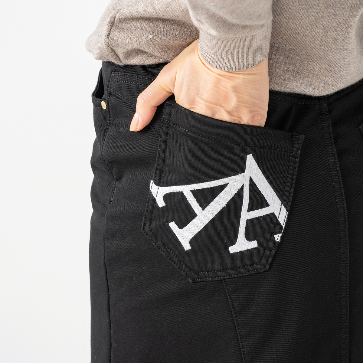 伸びの良いストレッチツイルボンディング素材を使った、こだわりのマーメイドスカート。しなやかな生地が美しいシルエットを描き、動きやすさも魅力です。左右の後ろポケットには配色刺繍のAロゴ、金色タックボタンやリベットにもAロゴを施し、右後ろポケットにはピスネームを添えています