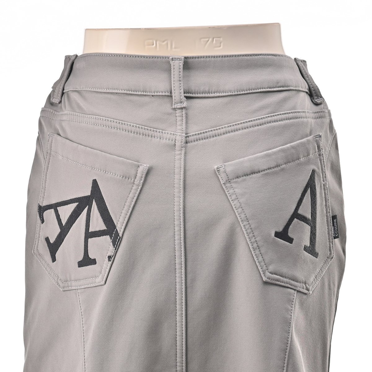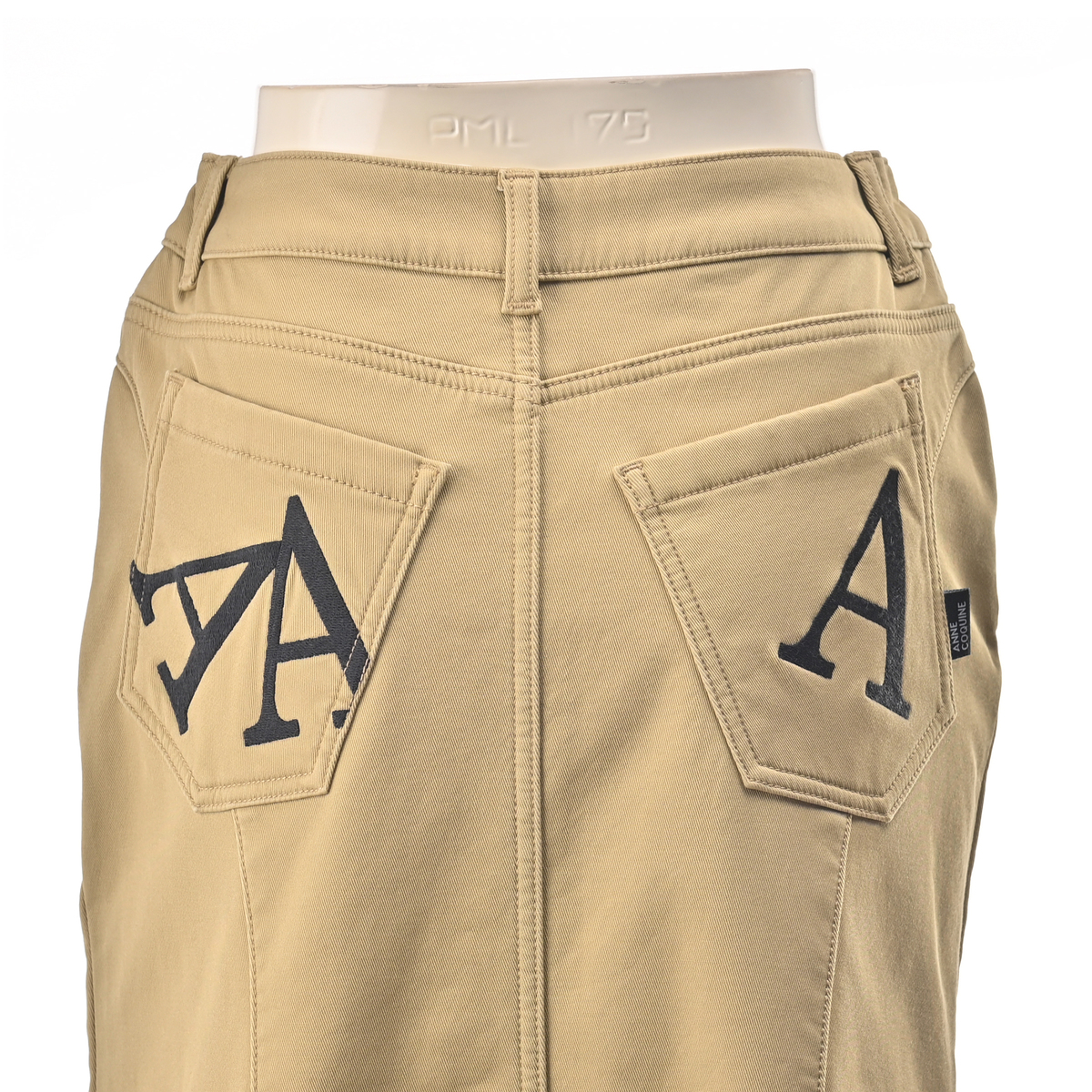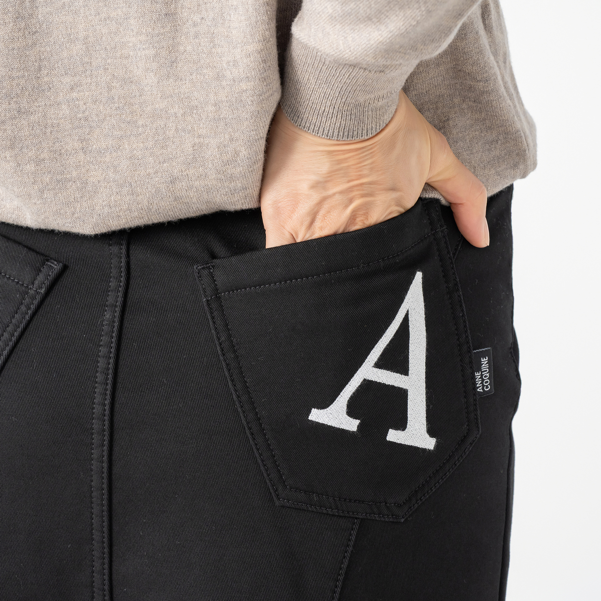 伸びの良いストレッチツイルボンディング素材を使った、こだわりのマーメイドスカート。しなやかな生地が美しいシルエットを描き、動きやすさも魅力です。左右の後ろポケットには配色刺繍のAロゴ、金色タックボタンやリベットにもAロゴを施し、右後ろポケットにはピスネームを添えています