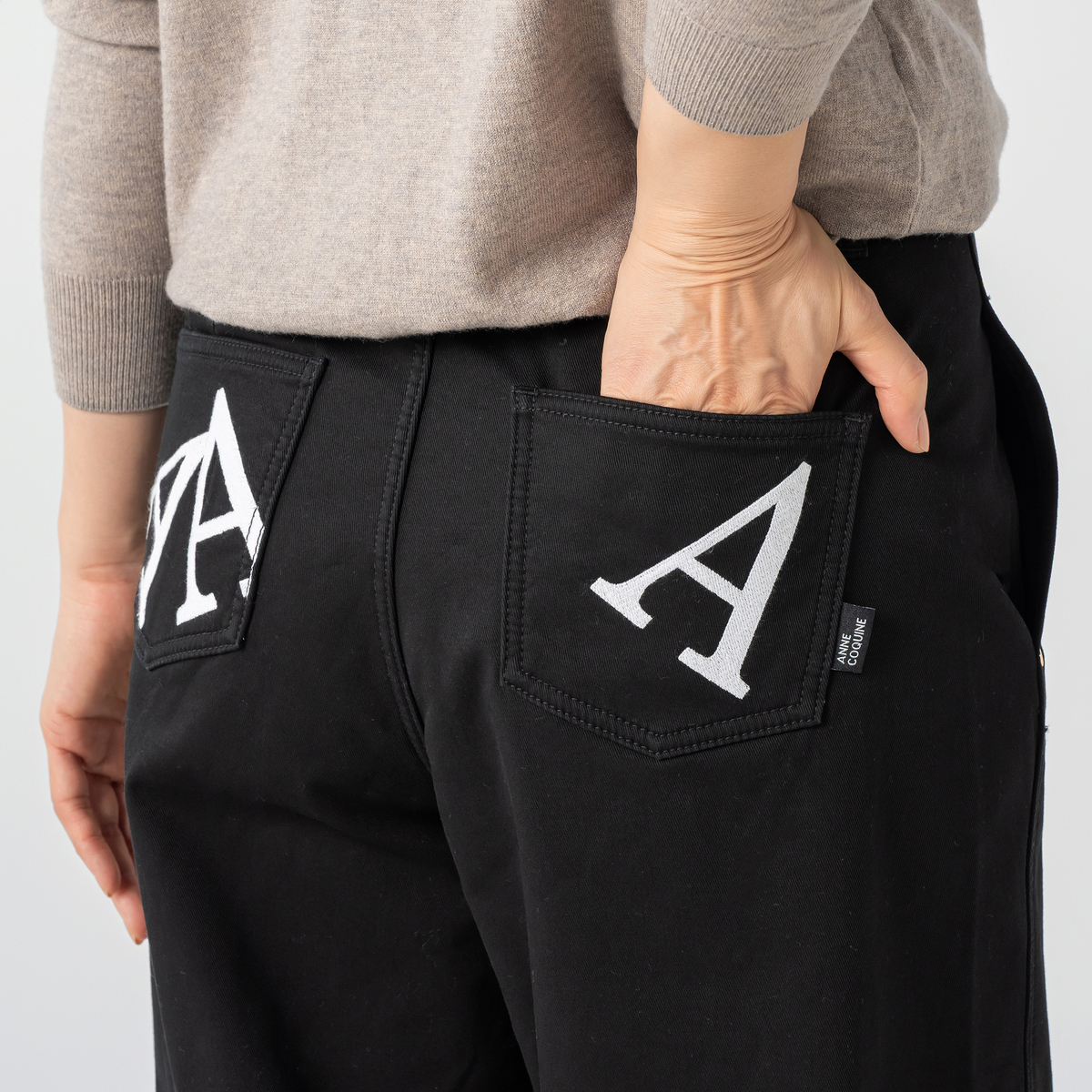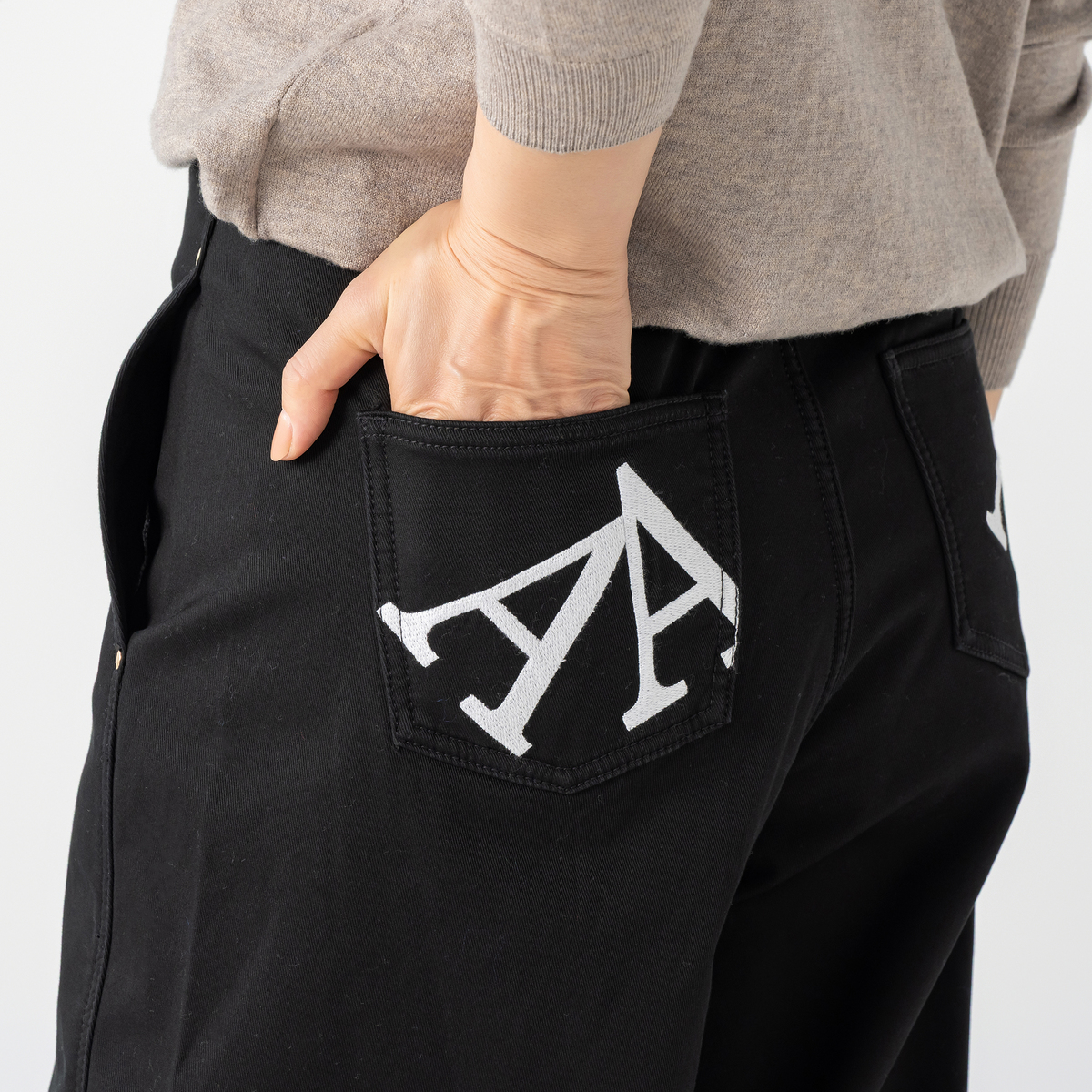柔らかくあたたかみのあるストレッチツイルボンディング素材を使ったカーヴィーパンツ。美しいラインと快適な穿き心地を両立し、左右の後ろポケットには配色刺繍のAロゴを施しました。金色タックボタンやリベットにもAロゴをあしらい、右後ろポケットにはピスネームをプラス。股下は選べる2レングス展開です