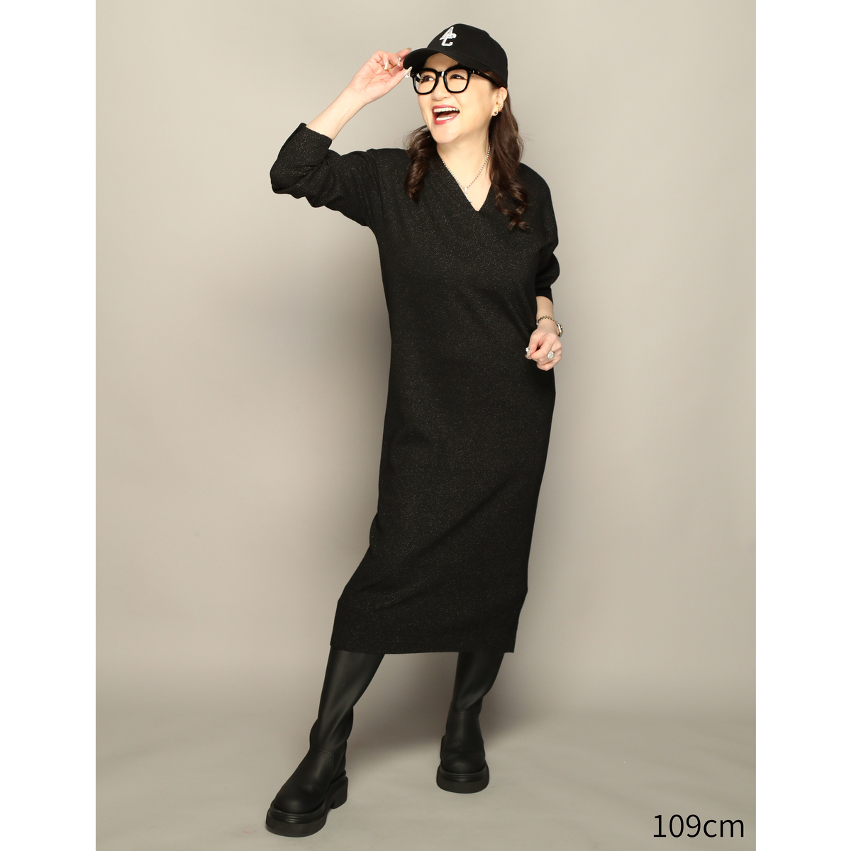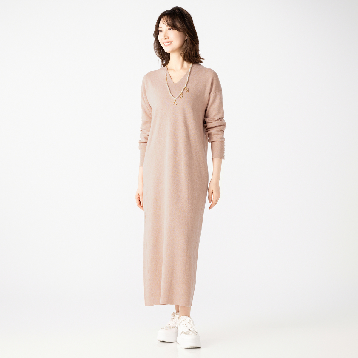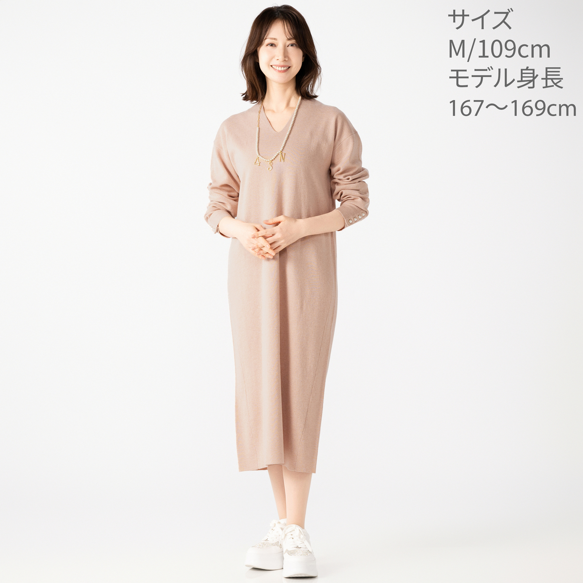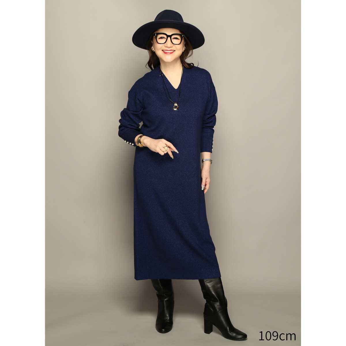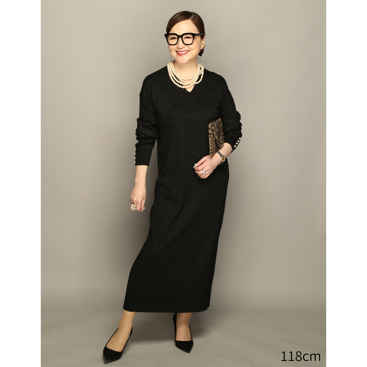 ウールミックスのラメ糸が上品なニットワンピースです。前後Vネックラインがお顔まわりをすっきり見せ、ストレートシルエットが大人らしさを引き立てるデザイン。袖口のパール調ボタンや後ろ衿ぐり下のロゴパーツが個性を添えます