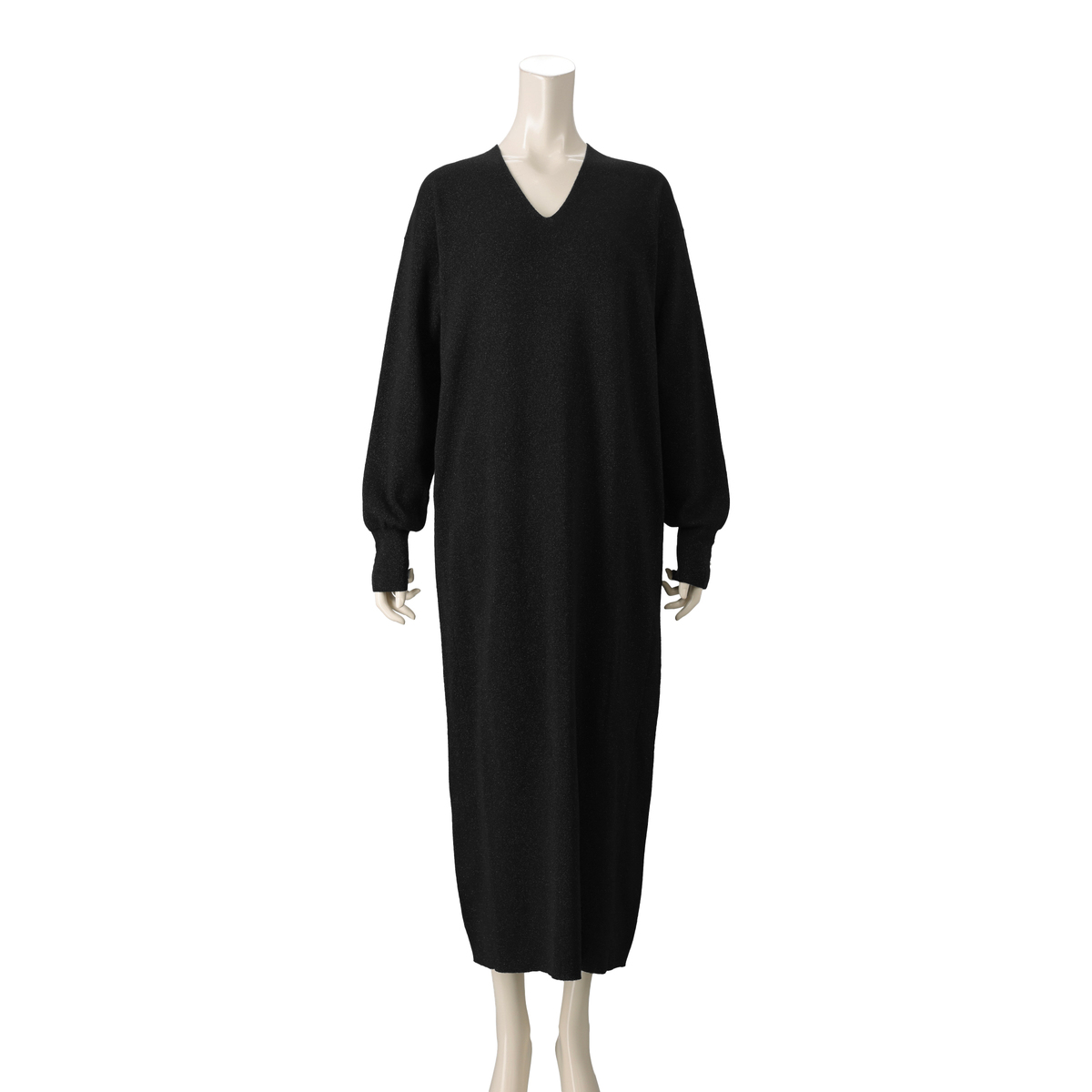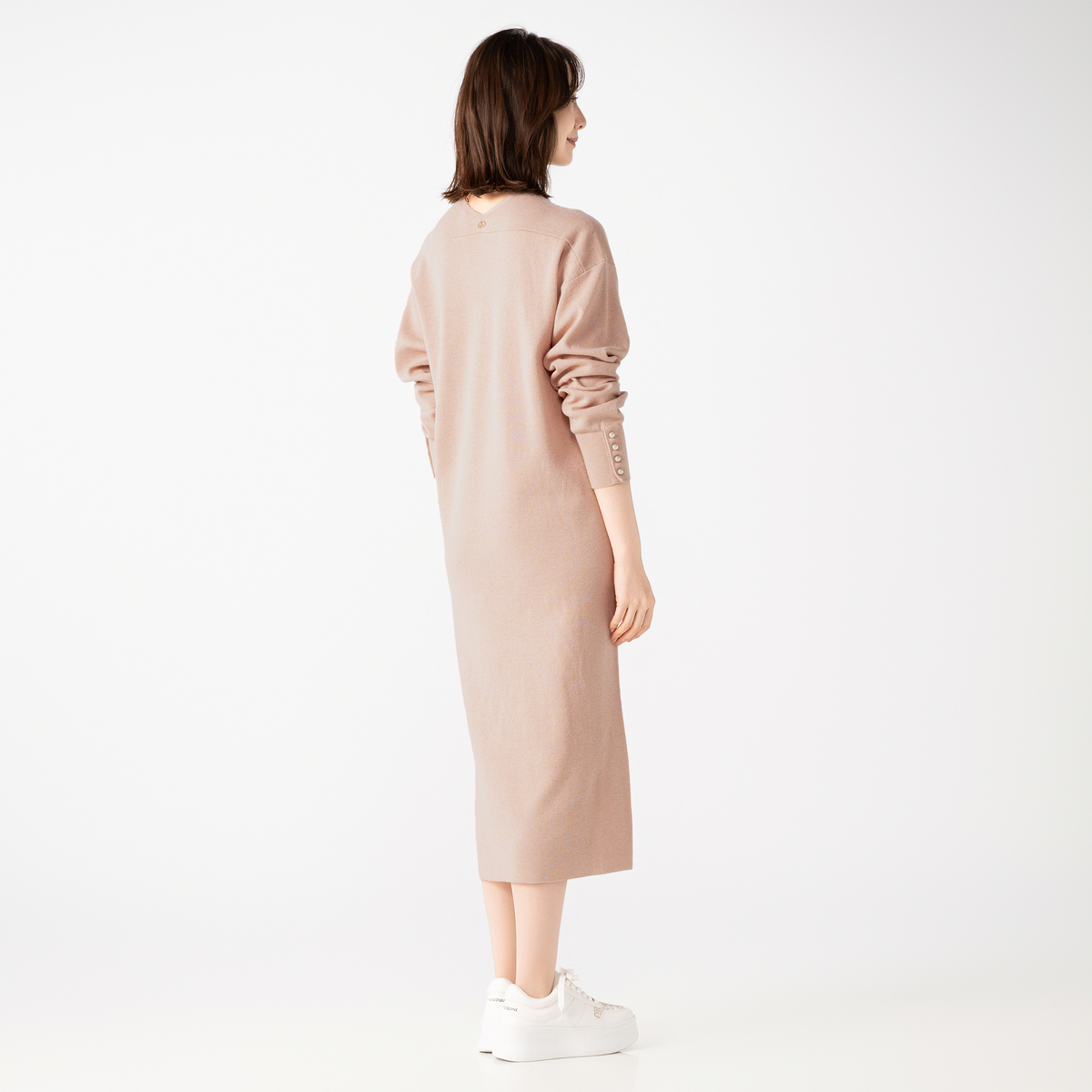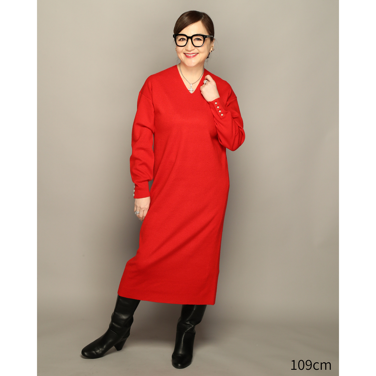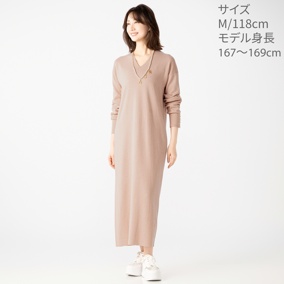 ウールミックスのラメ糸が上品なニットワンピースです。前後Vネックラインがお顔まわりをすっきり見せ、ストレートシルエットが大人らしさを引き立てるデザイン。袖口のパール調ボタンや後ろ衿ぐり下のロゴパーツが個性を添えます