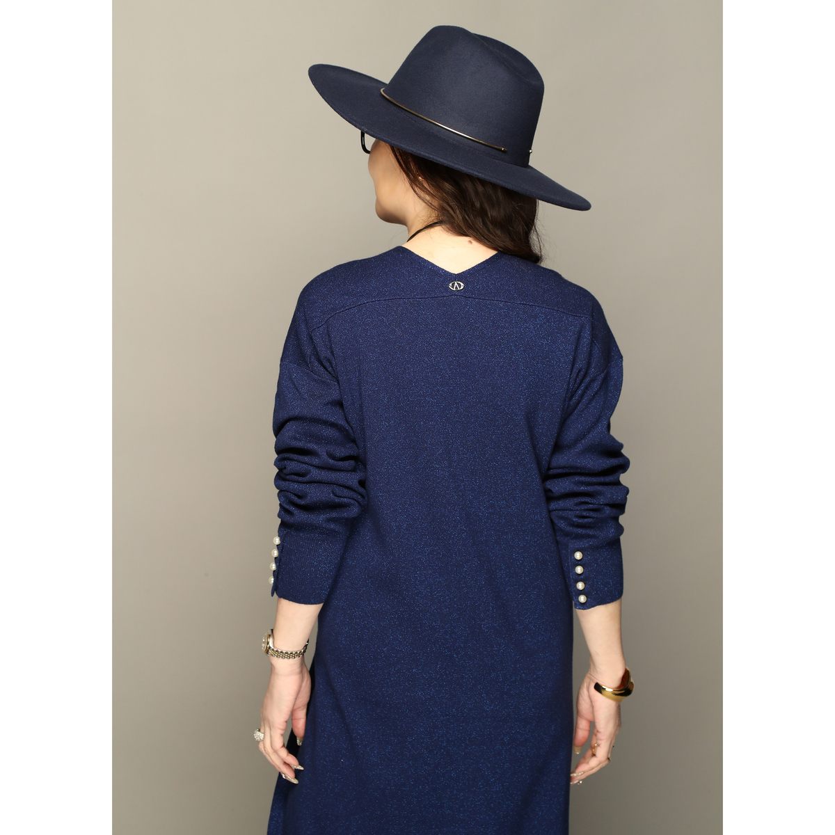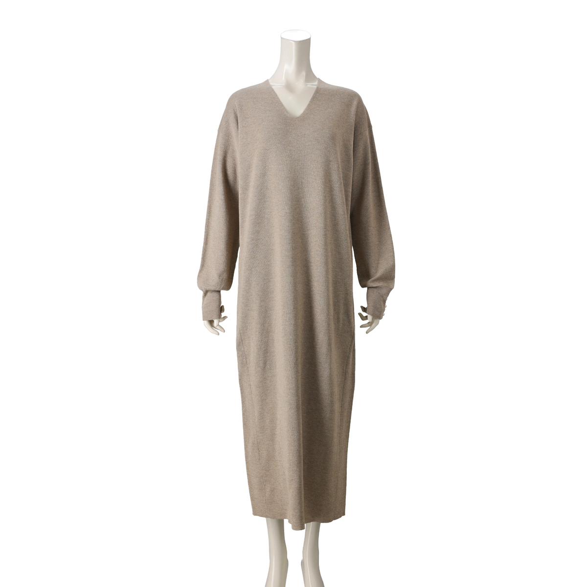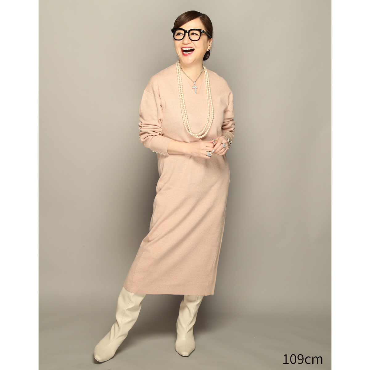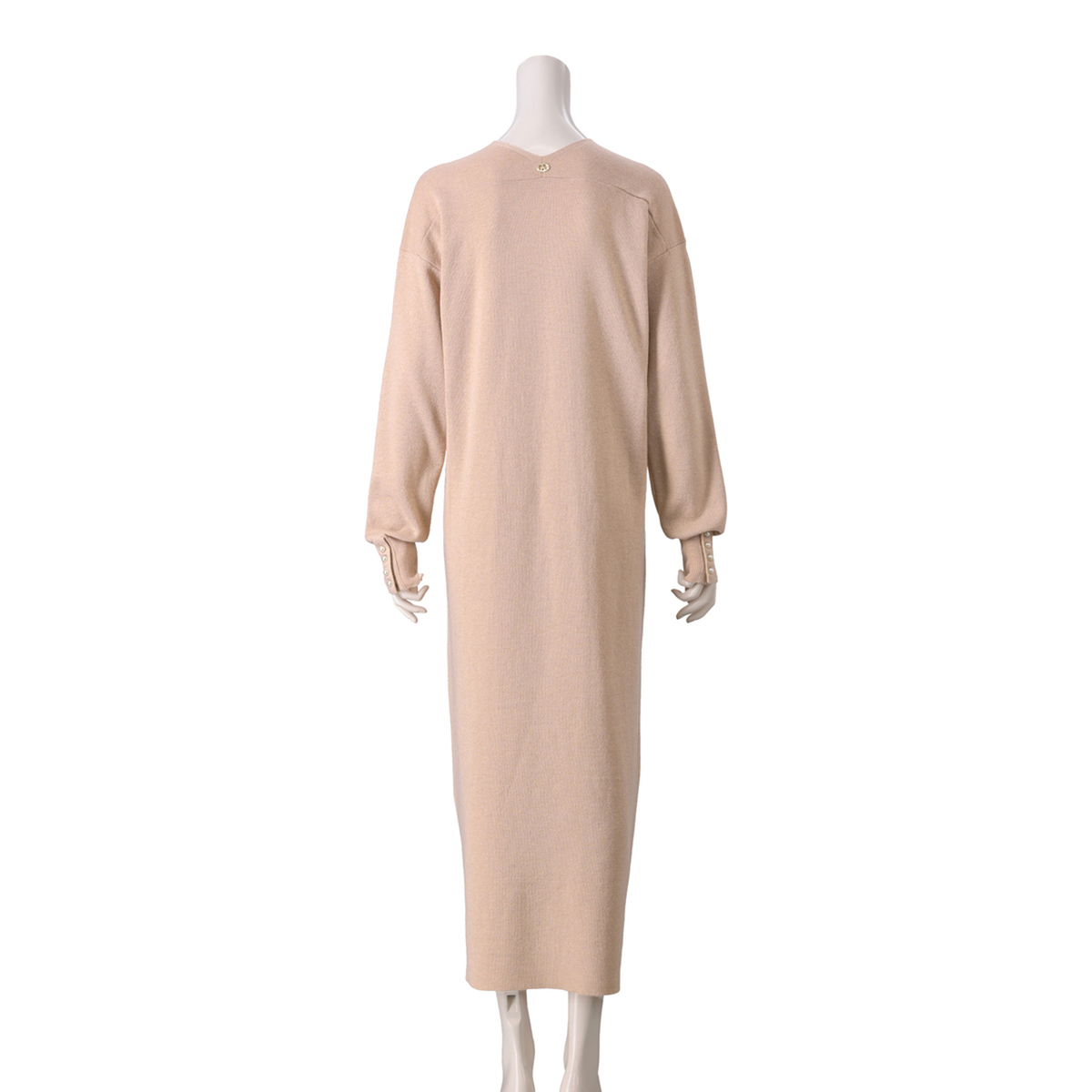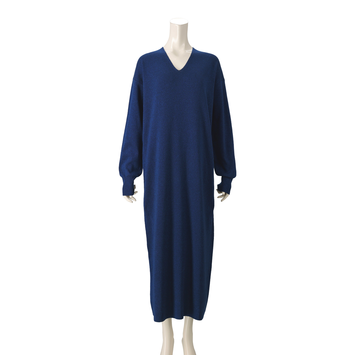 ウールミックスのラメ糸が上品なニットワンピースです。前後Vネックラインがお顔まわりをすっきり見せ、ストレートシルエットが大人らしさを引き立てるデザイン。袖口のパール調ボタンや後ろ衿ぐり下のロゴパーツが個性を添えます
