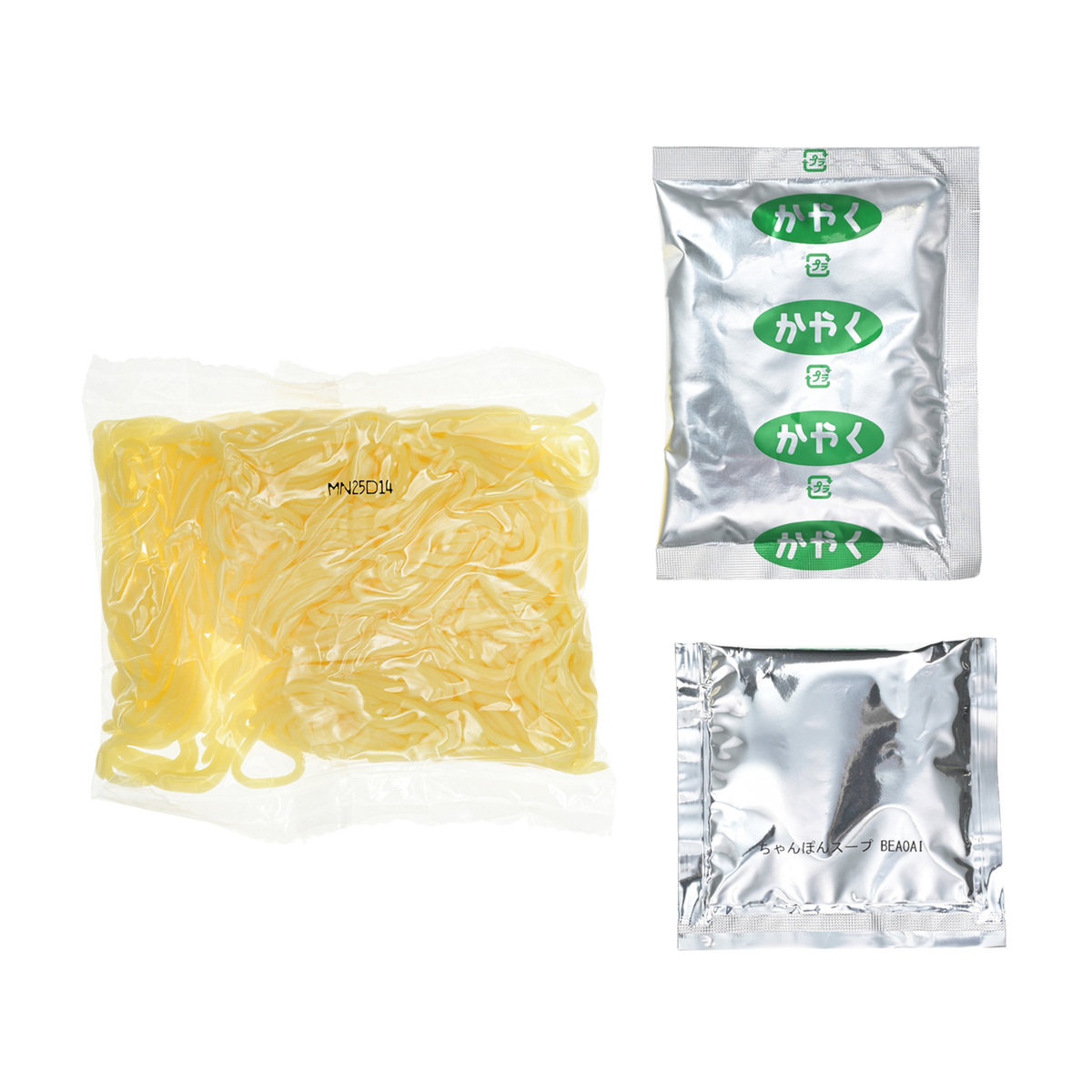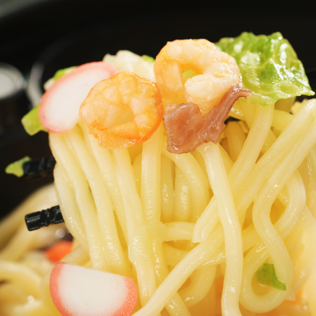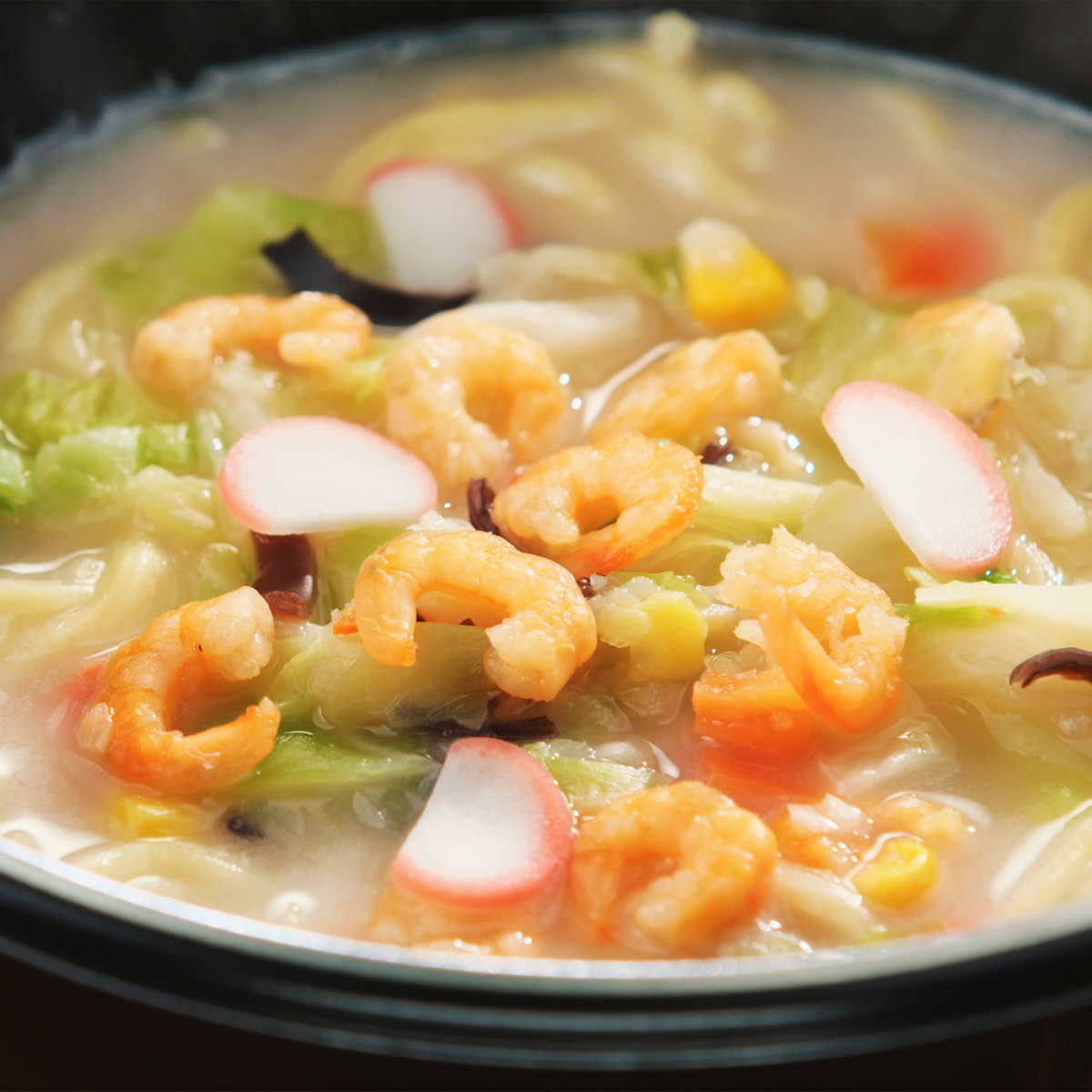長崎ちゃんぽんの要である"唐あく"を使用した、本場長崎ちゃんぽん麺を使用。長崎県で製造した、もちもちとしながらしっかりとした食感です。ゆで上げて加熱殺菌をすることで、乾燥させることなく常温保管を可能にしました