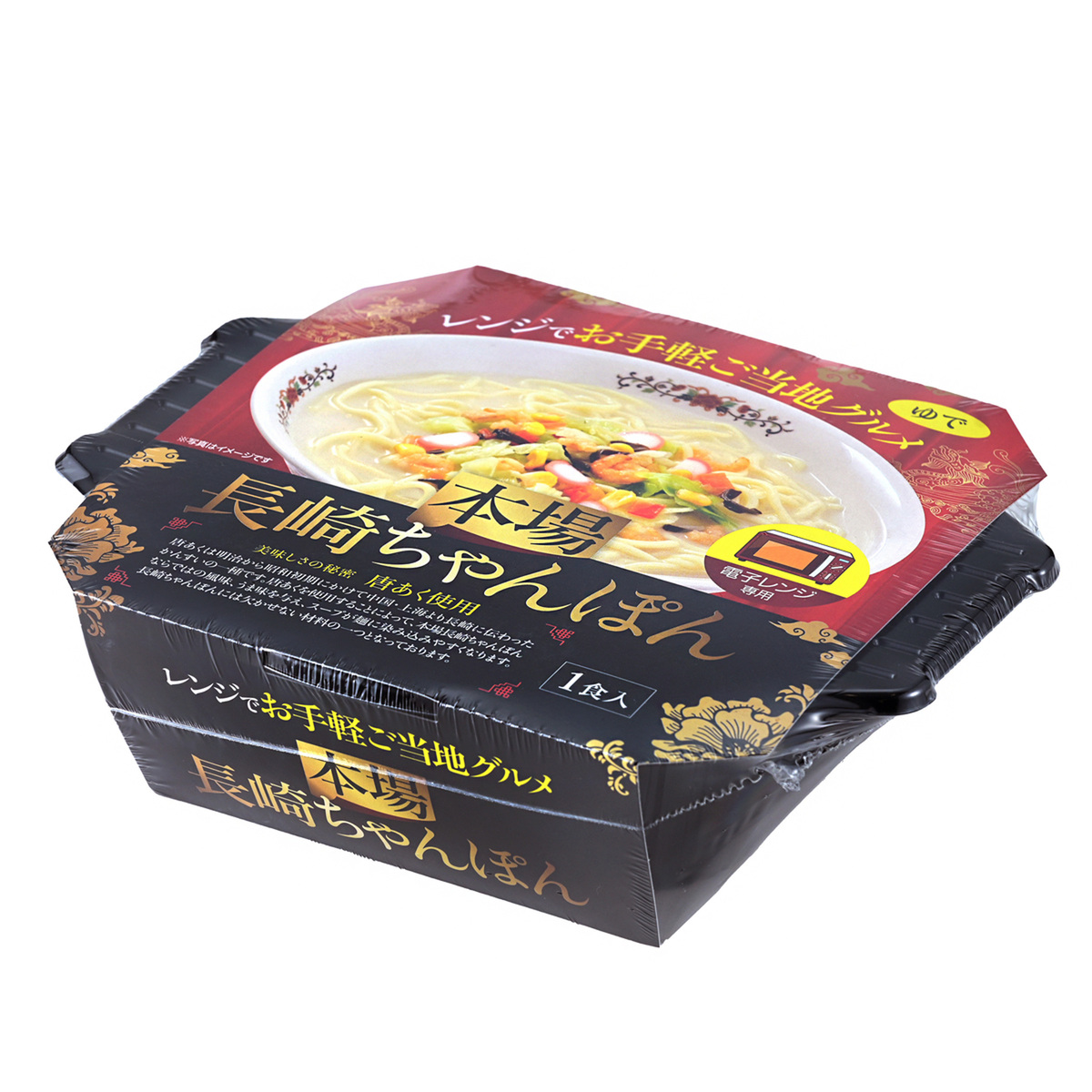 長崎のご当地グルメ「長崎ちゃんぽん」を、電子レンジで手軽にお召し上がりいただけるカップ入り麺。キャベツ、にんじん、コーン、きくらげ、えび、かまぼこの乾燥具材(かやく)を使用。スープはポークエキスをベースに、野菜の旨味を加えた麺によく合うスープを使用しています