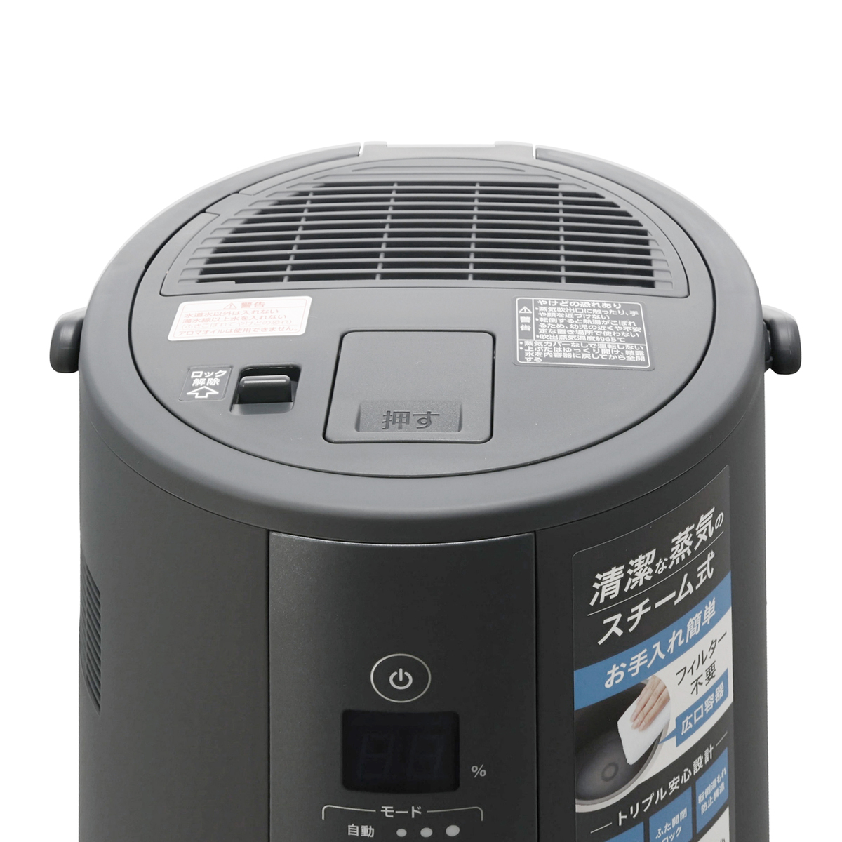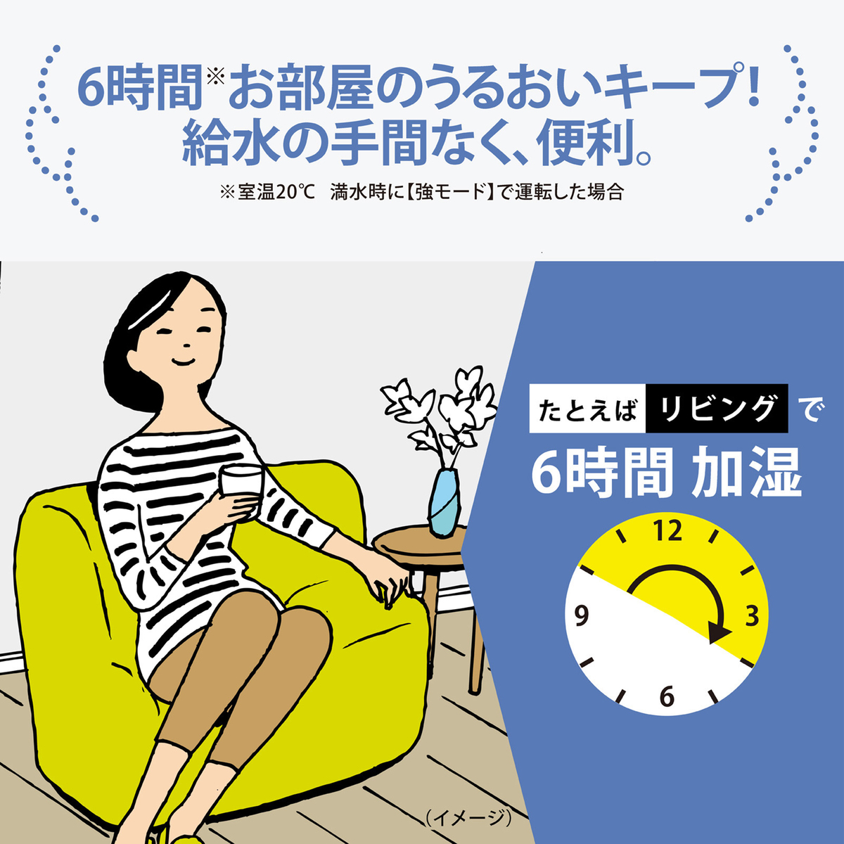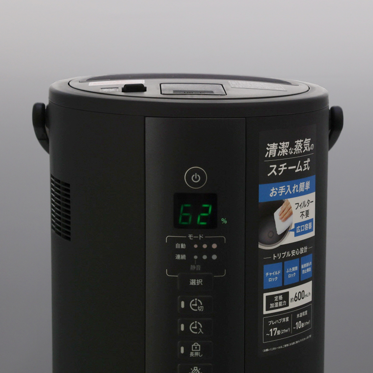 本体周辺の湿度やタイマー設定の状況をデジタルで表示。内容器の湯が少なくなった時となくなった時の2段階で給水をお知らせ。使用中に本体を傾けたり、転倒させたときは転倒時自動オフ機能が作動し、自動的にヒーターへの通電を停止、運転ランプがすべて点灯してブザーでお知らせします(*4)