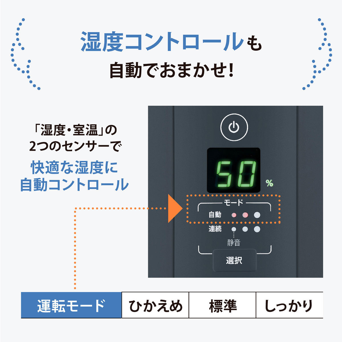 運転モード選択で快適な湿度を自動コントロール。3段階から選べ、空気が乾燥する冬はしっかり運転、おだやかに加湿したいときはひかえめ運転がおすすめです