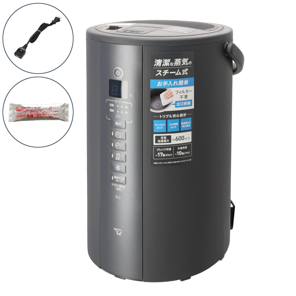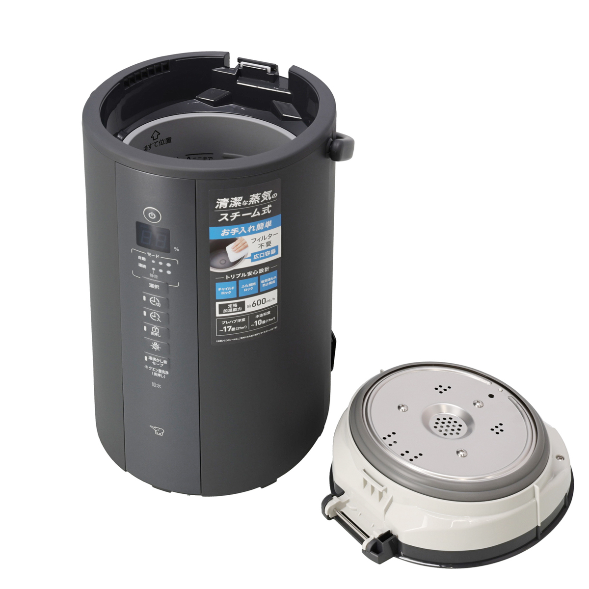 容器自体が水タンクになった、一体型のスチーム式加湿器。沸騰させたきれいな蒸気で加湿します(*1)。広口で本体に直接給水ができ、容器の底まで手が届くためお手入れが簡単。また、お手入れが面倒なフィルターのない構造です(*2)。今回は、ポット内容器洗浄用クエン酸をセットにしてお届けします