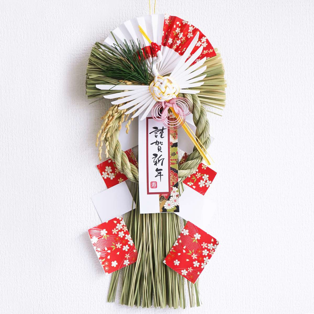 紅白の扇が映える、国内製造の正月飾りです。新しい年の始まりに。玄関飾りは12月26・27・28日、あるいは30日に飾るのが一般的です