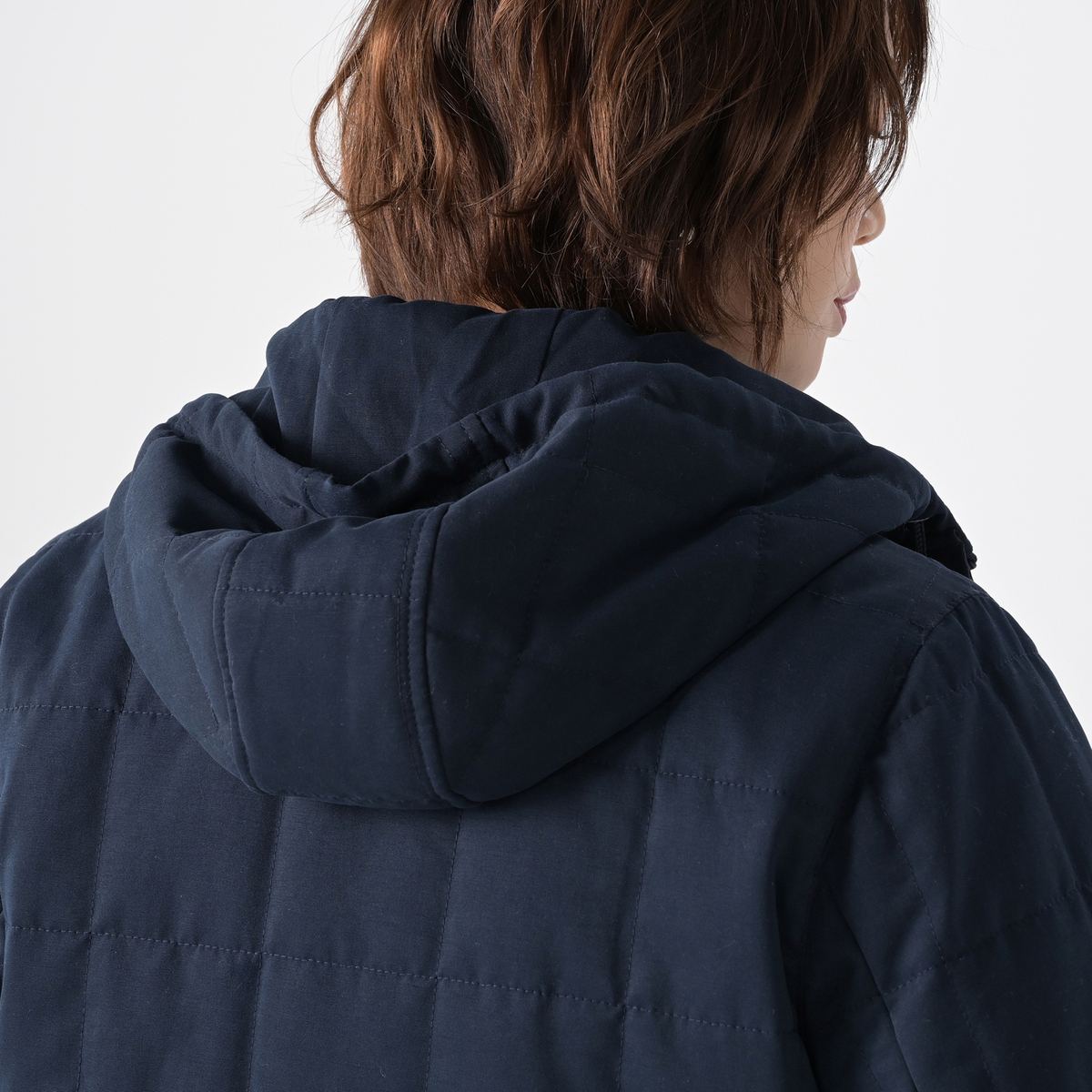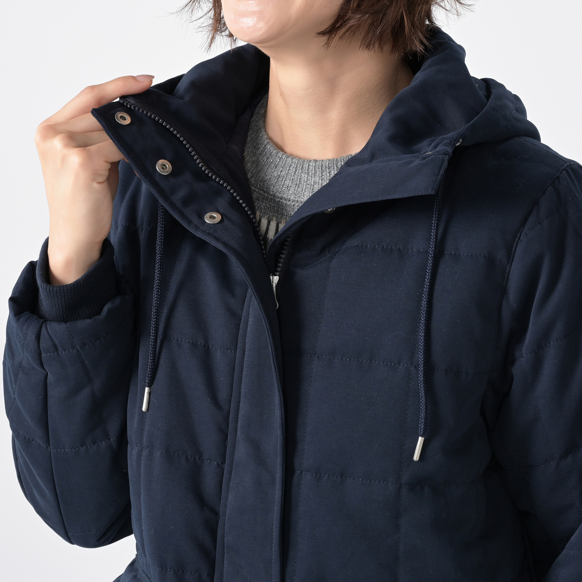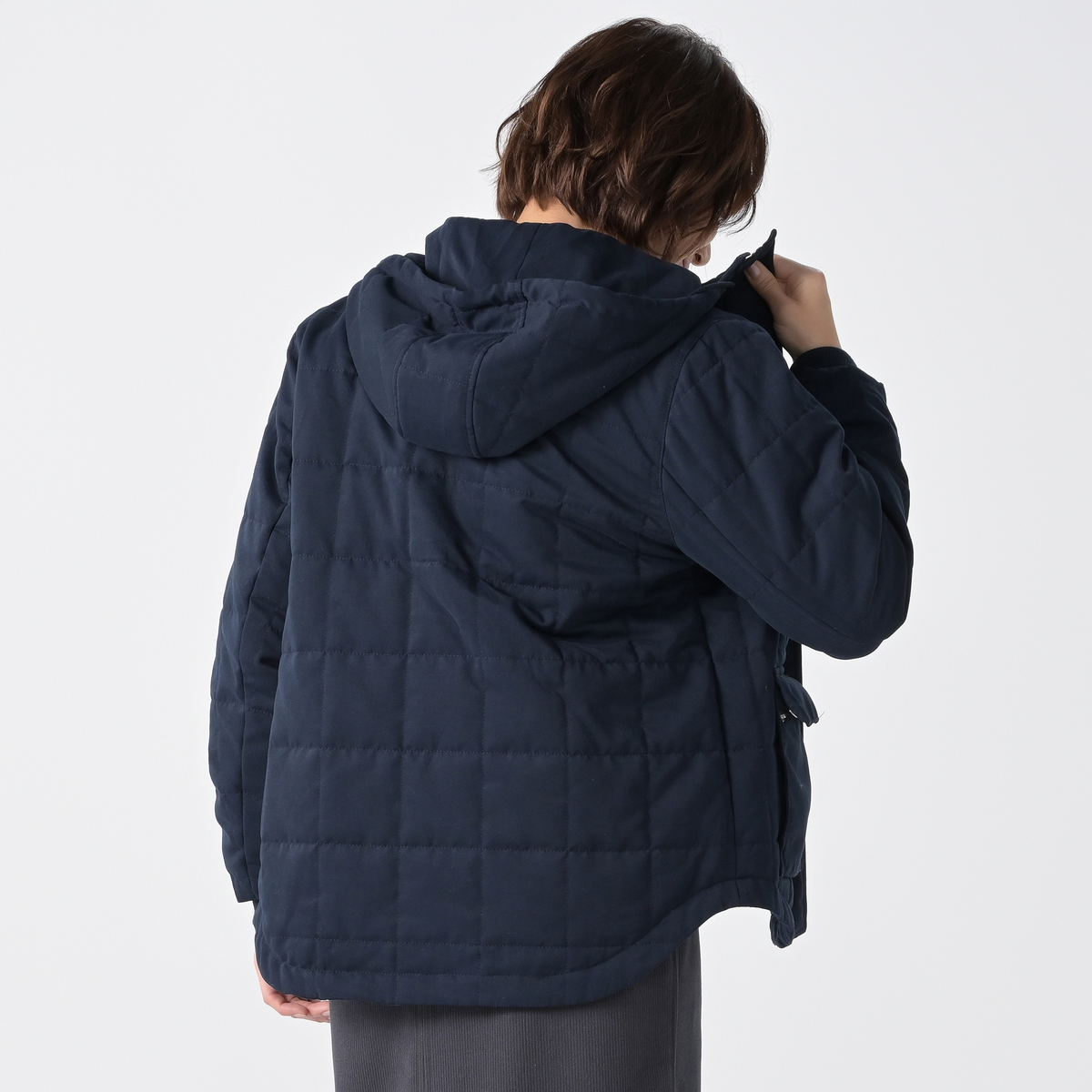 機能性のある中綿を使ったフーディーブルゾン。フード付きの仕様が首周りを包み込み、日々の防寒アイテムとして活躍します