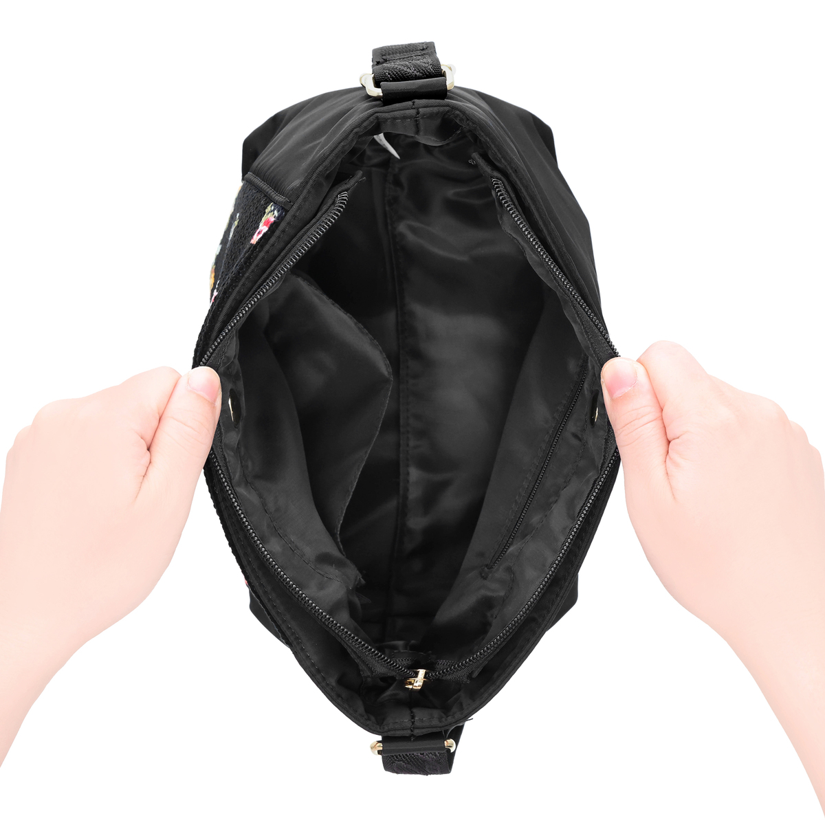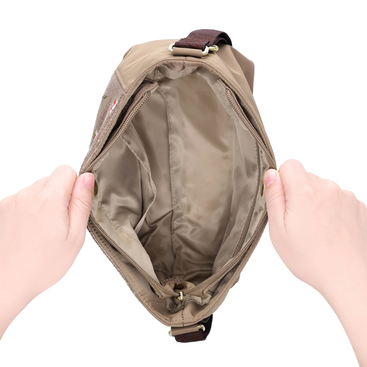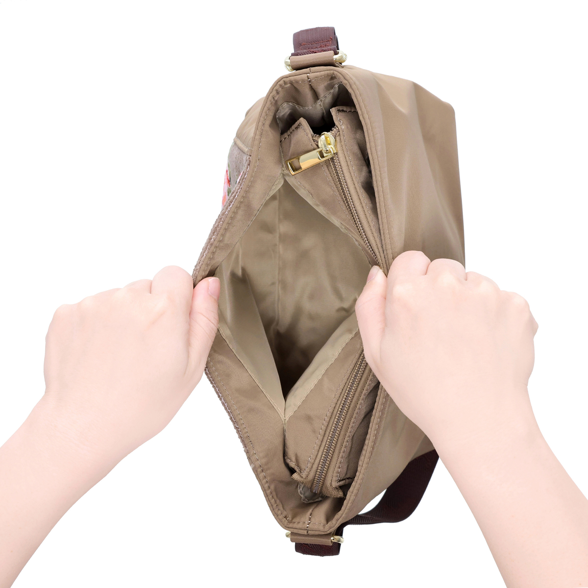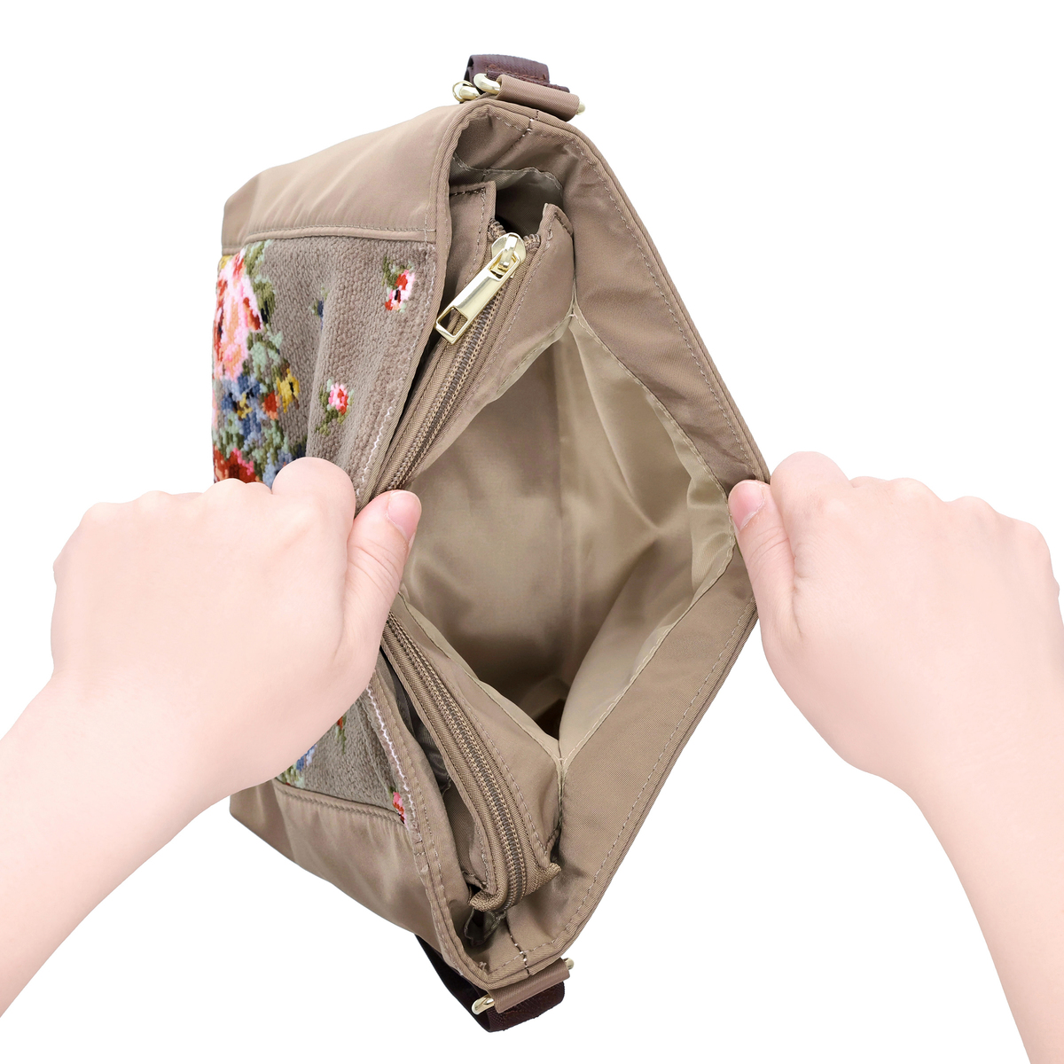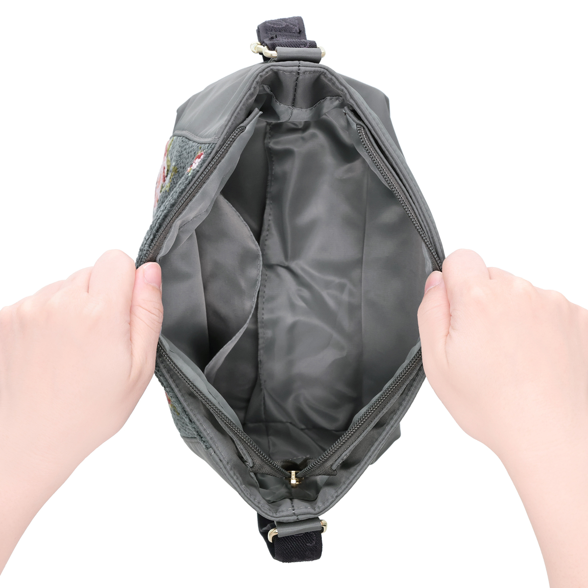 [サイズ(約)] 縦18×横29×マチ13cm ハンドル立上り:30〜63cm [重量]約255g [素材] 本体柄部分:綿(シェニール織) 本体無地部分:ナイロン ショルダー紐:ポリエステル100% ※裏地有 [仕様] 開閉:ファスナー式 底ビョウ:無 [ポケット] 内側:アオリポケット×2、 オープンポケット×1、 ファスナーポケット×1 外側:無 【中国製】