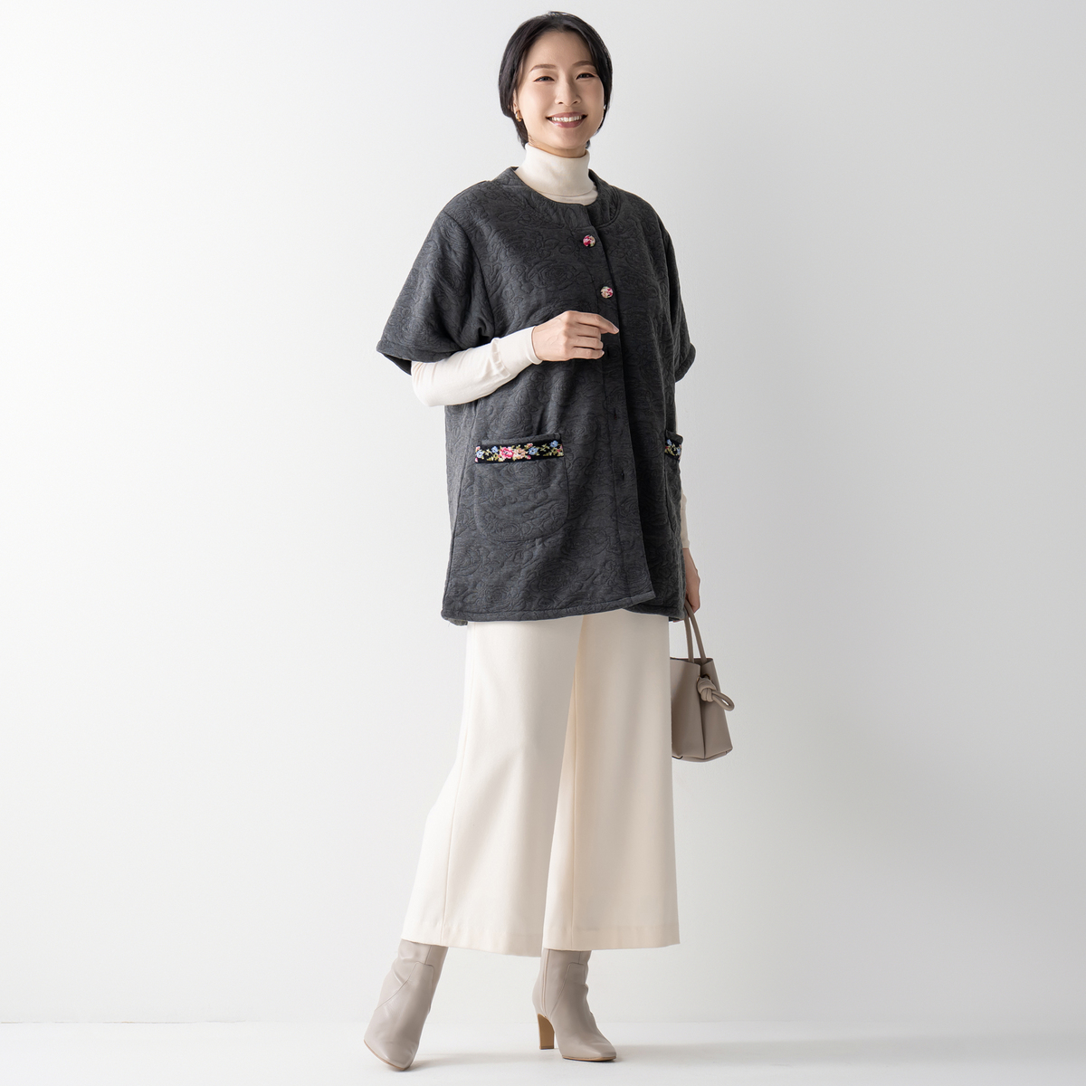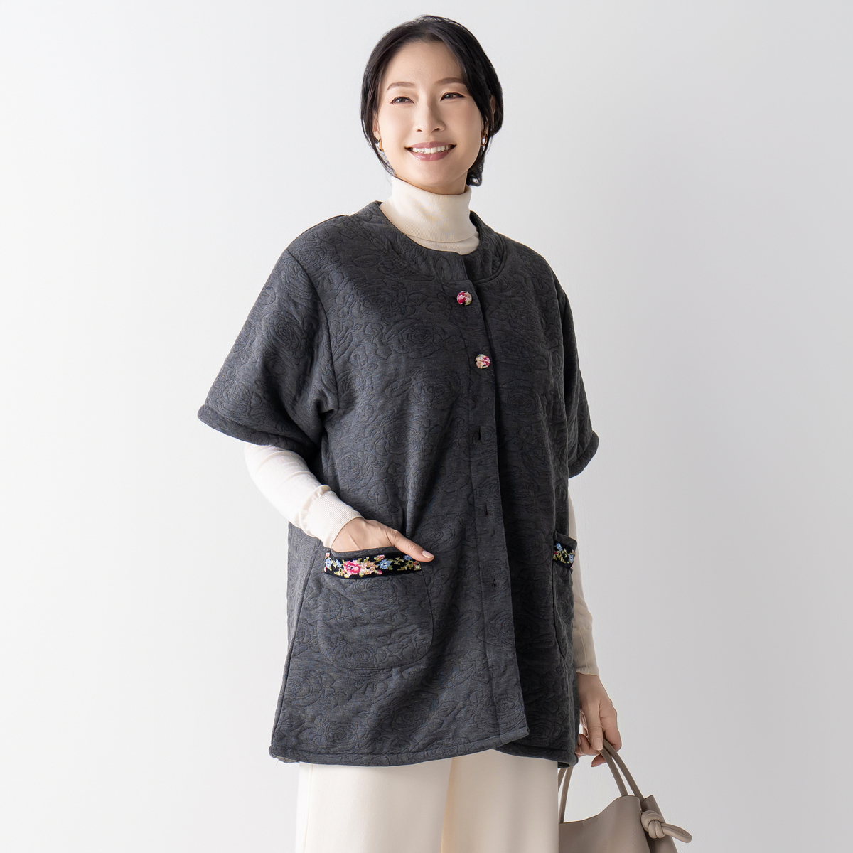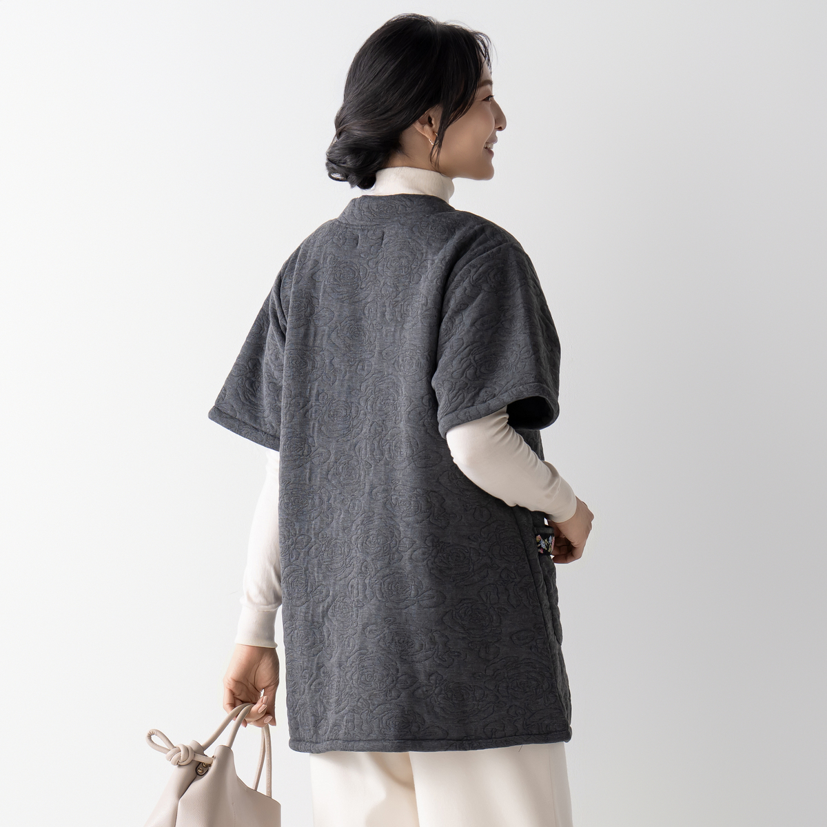 肌寒い時にさっと羽織れる5分袖ベスト。裏地はなめらかな肌触りのフリース素材を使い、暖かな着心地です