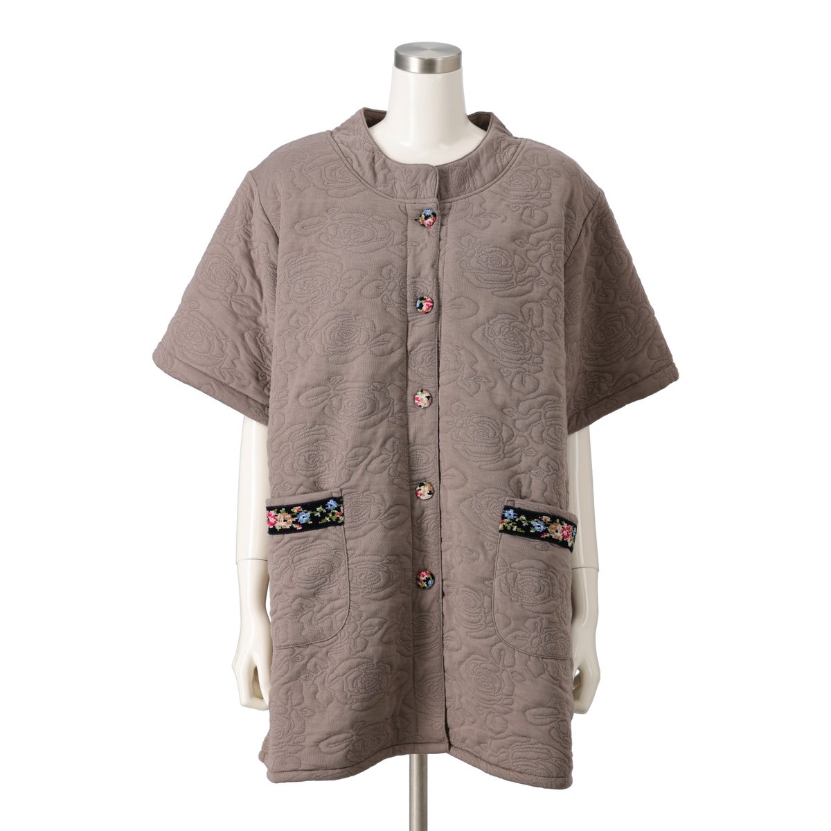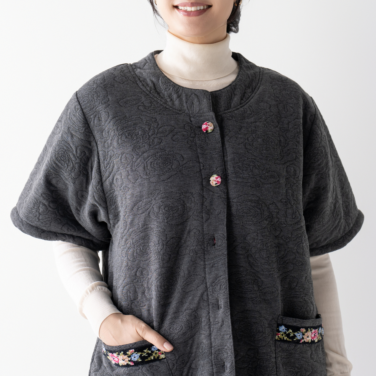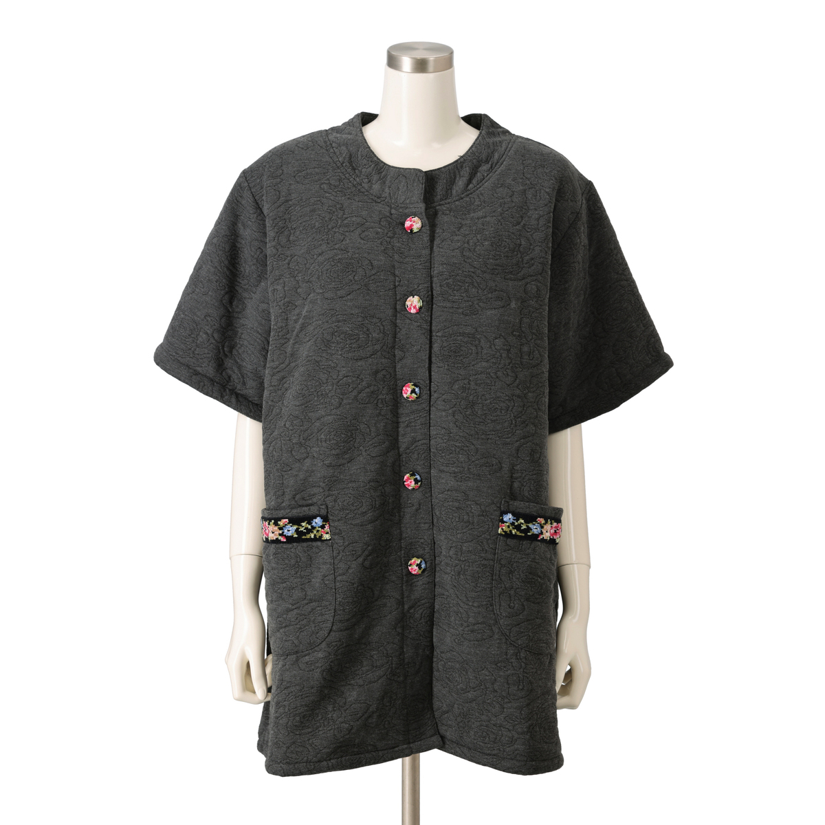 [商品寸法cm] フリーサイズ バスト:116 着丈 :77 肩幅 :45 袖丈 :25 [素材] 本体:ポリエステル95%、ポリウレタン5% 中綿:ポリエステル100% シェニール織部分:綿100% 裏地:ポリエステル100% [お手入れ] 洗濯機洗い可 [注意事項] ※蛍光増白剤のご使用はお避け下さい。濃色の製品については多少色落ちすることがありますので、洗濯の際は他のものと別にお取り扱いください ※長時間濡れたままにしておきますと色が移る恐れがありますのでご注意ください ※濃色の製品は淡色のものと重ねて着用した場合に、ごく稀に色が移染することがあります。色が移った時には、色が定着する前に直ちに洗濯を行ってください ※タンブラー乾燥はお避けください ※素材の特性上、多少縮みます。洗濯の際は伸ばしながら形を整え、陰干しをしてください ※洗濯後は直射日光を避け風通しの良い日陰に干してください 【中国製】