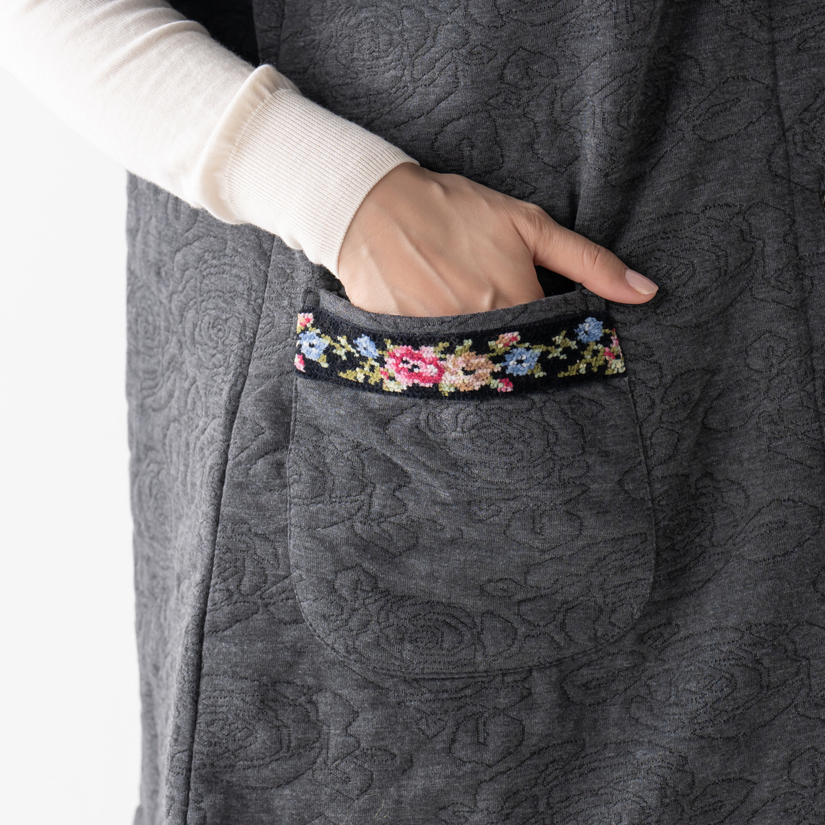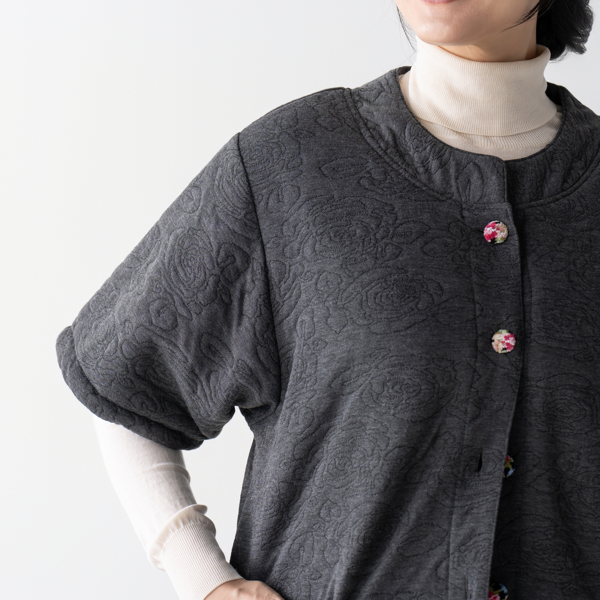 表地は花柄のフクレジャカード。さらにポケットと前ボタンにはシェニール織の生地をあしらい、華やかなアクセントになっています