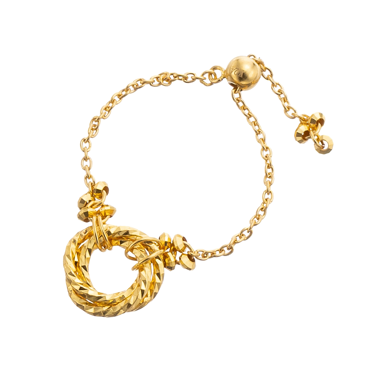 カットを施したサークルを組合せた、純金製のチェーンリング。モチーフの左右にソロバン型ミラーパーツを加え、華やかさをプラスしました。ミラーパーツが細やかな輝きを放ちます