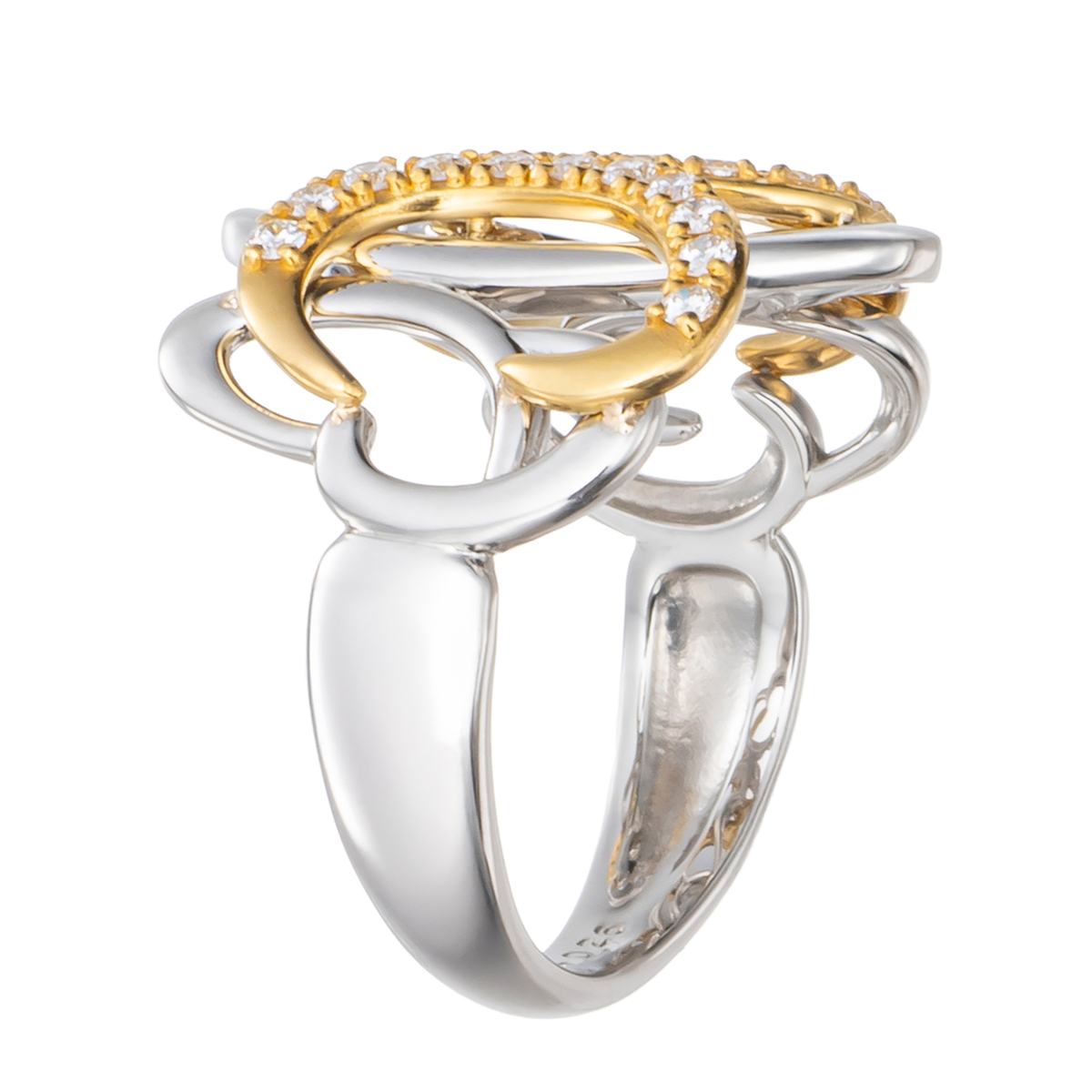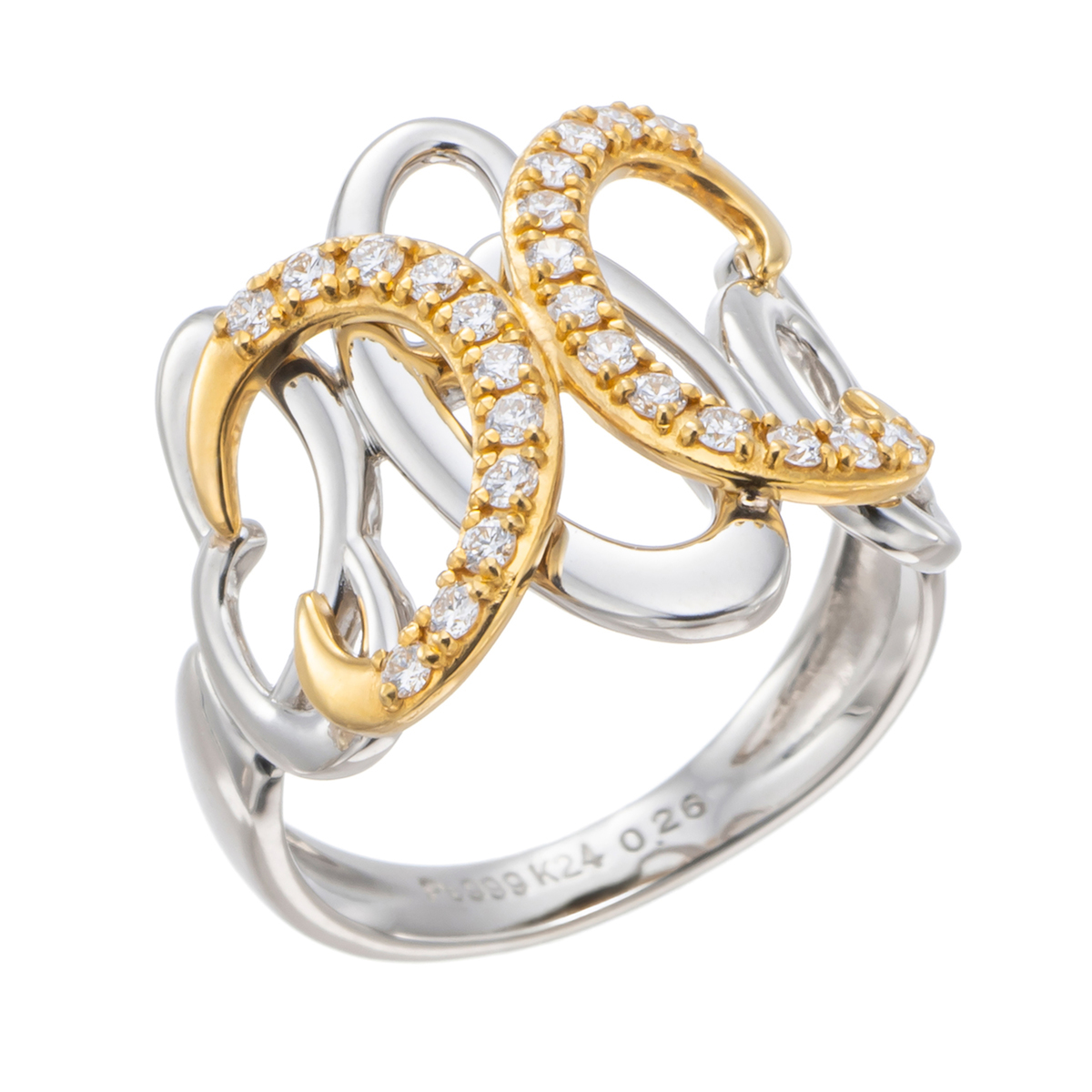 純プラチナに純金を重ねた、存在感のあるリング。ダイヤモンドの繊細な輝きが華やかさを引き立て、指元を上品に彩ります