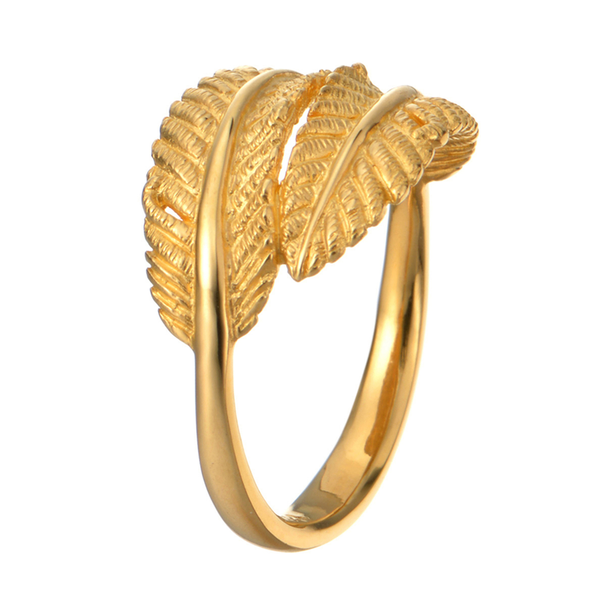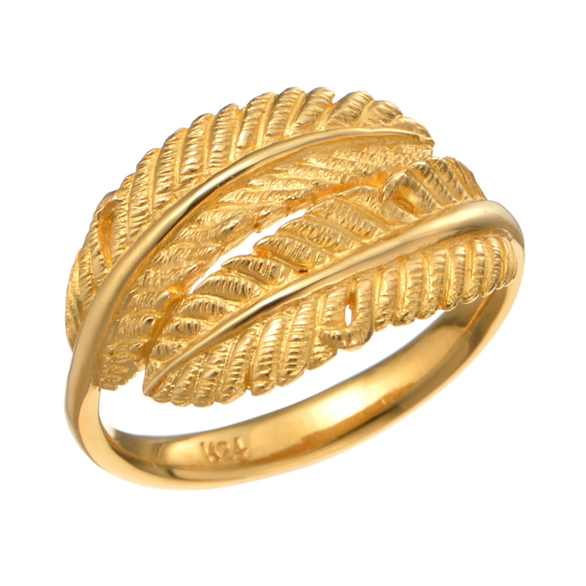 純金で仕立てた、フェザーデザインのエレガントなリング。重なり合う2枚の羽根を精巧にデザインしました。指元を華やかに演出してくれます
