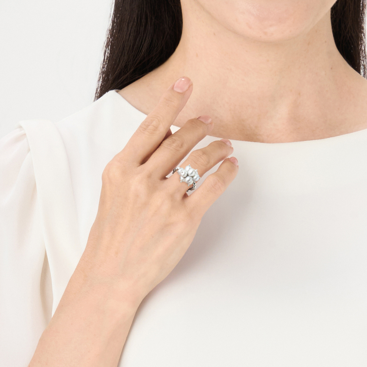 ナチュラルブルーグレーカラーのアコヤ真珠をあしらったリング。指元で存在感を放つ華やかなデザインです