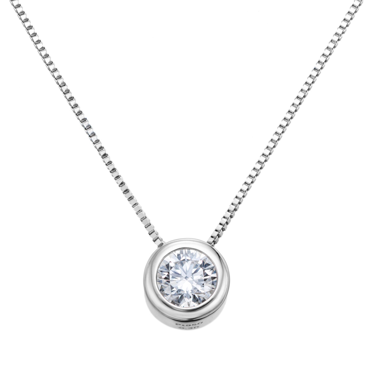 Dカラーのダイヤモンドをベゼルの枠で包み込んだペンダントです。シンプルなデザインがダイヤモンドの存在感を際立たせ、胸元をエレガントに彩ります