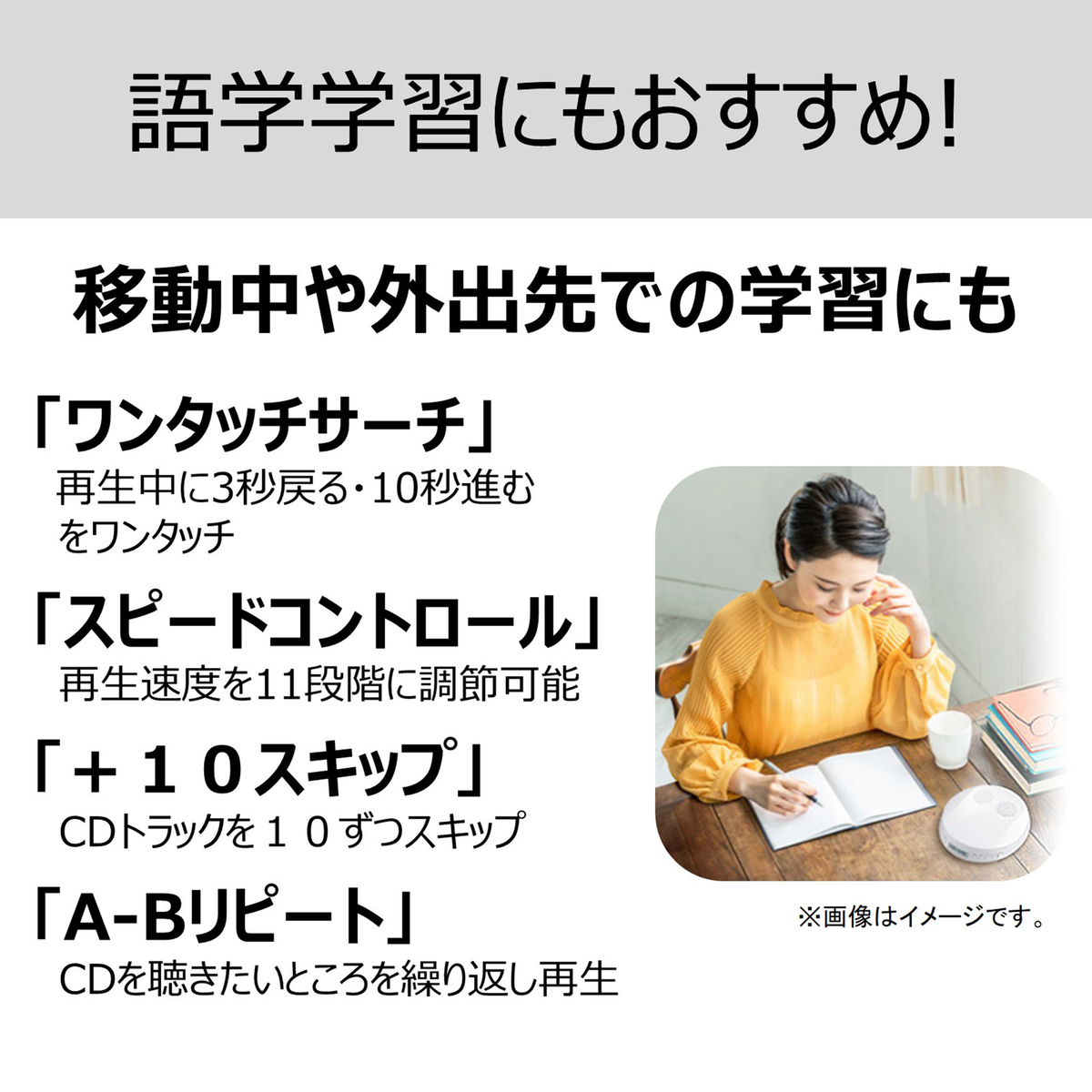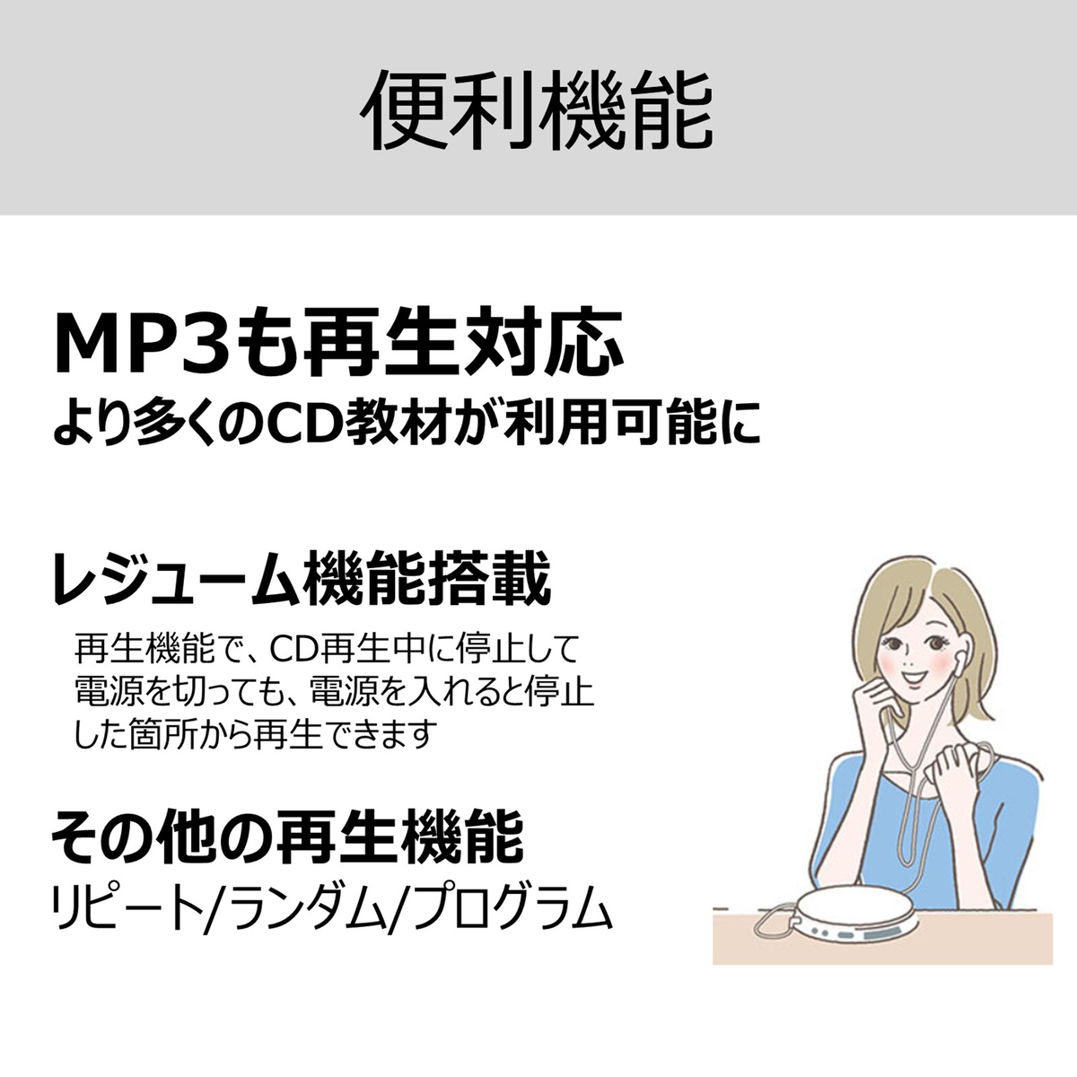 "ゆっくり"から"早く"まで11段階で速度調整が可能な"スピードコントロール"、聴き直したいフレーズを繰り返し再生する"A-Bリピート"など、語学の習得に役立つ機能を搭載したポータブルCDプレイヤー。MP3再生にも対応し、より多くのCD教材がご利用可能です