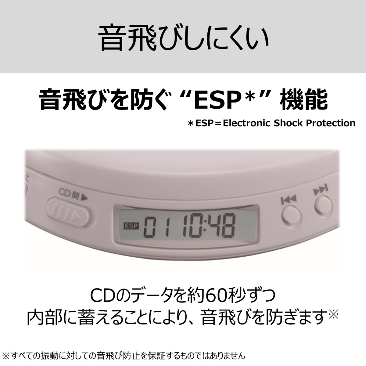 CDのデータを約60秒ずつ内部に蓄えることで音飛びを防ぐESP(Electronic Shock Protection*1)機能、プログラムした曲順(*2)で再生するプログラム再生、CDの再生中に停止して電源を切っても、電源を入れると停止した箇所から再生できるレジューム機能なども搭載しています