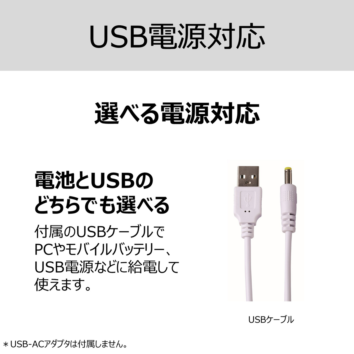 付属のUSBケーブルでお手持ちのPCやモバイルバッテリー、USB電源などに給電して手軽に使えます(*3)