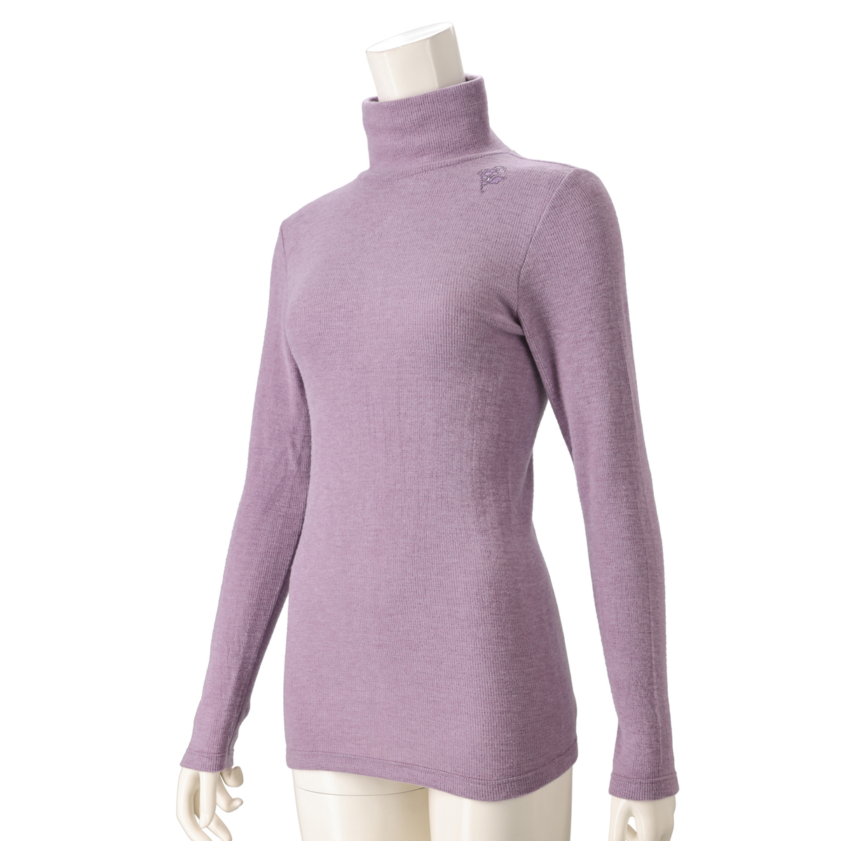 旭化成の吸湿発熱素材サーモギアを使用したハイネックインナー。袋編み2重組織の起毛素材でボリューム感があり、起毛の毛足が空気をふんわりと抱き込んで暖かです