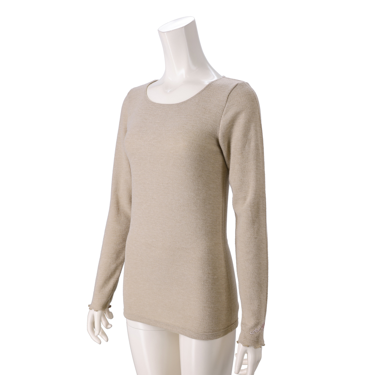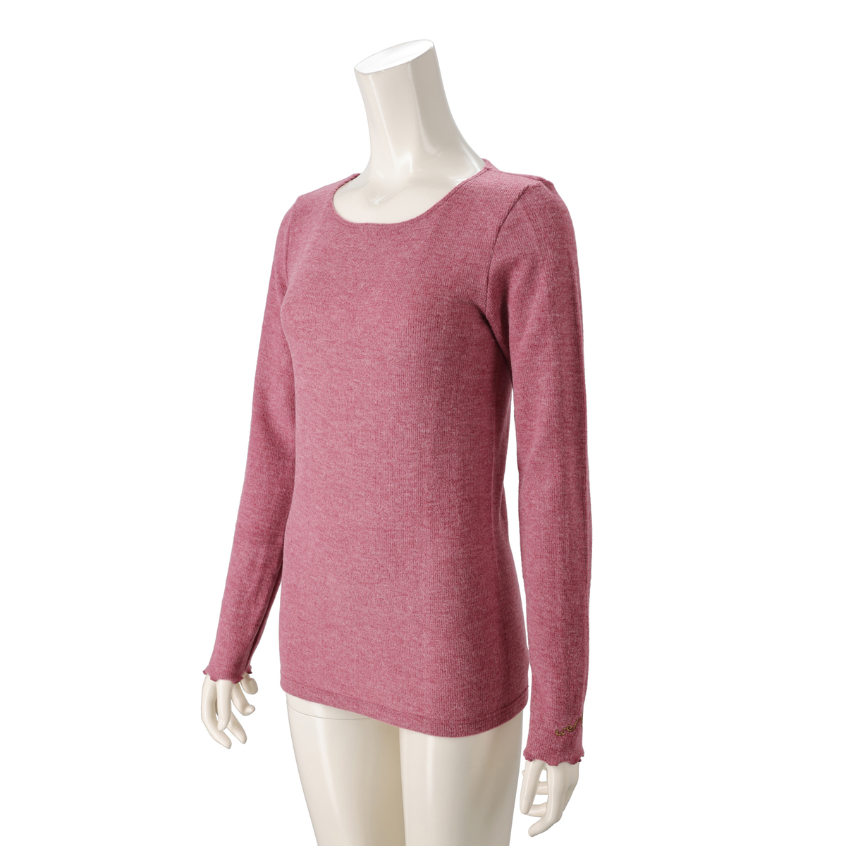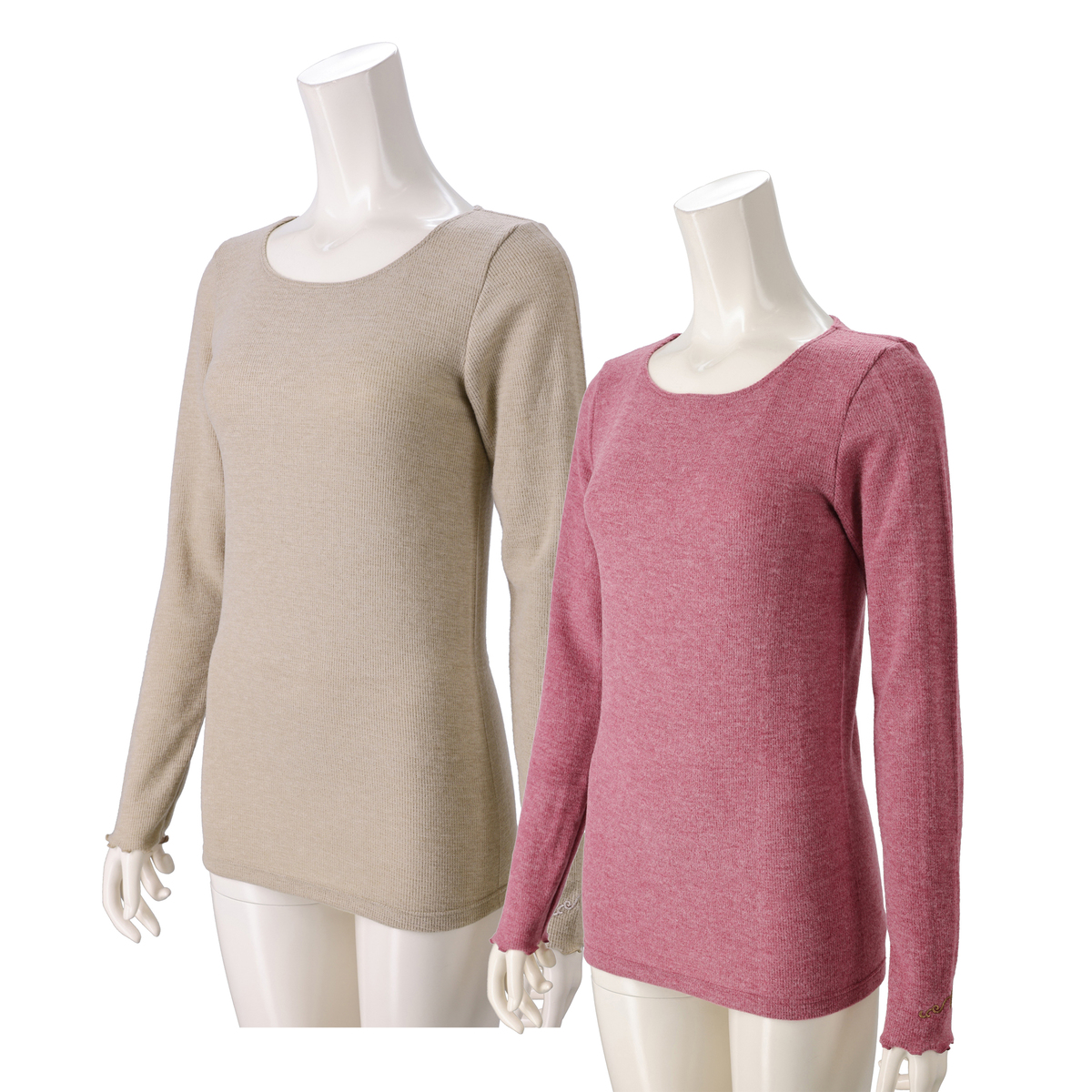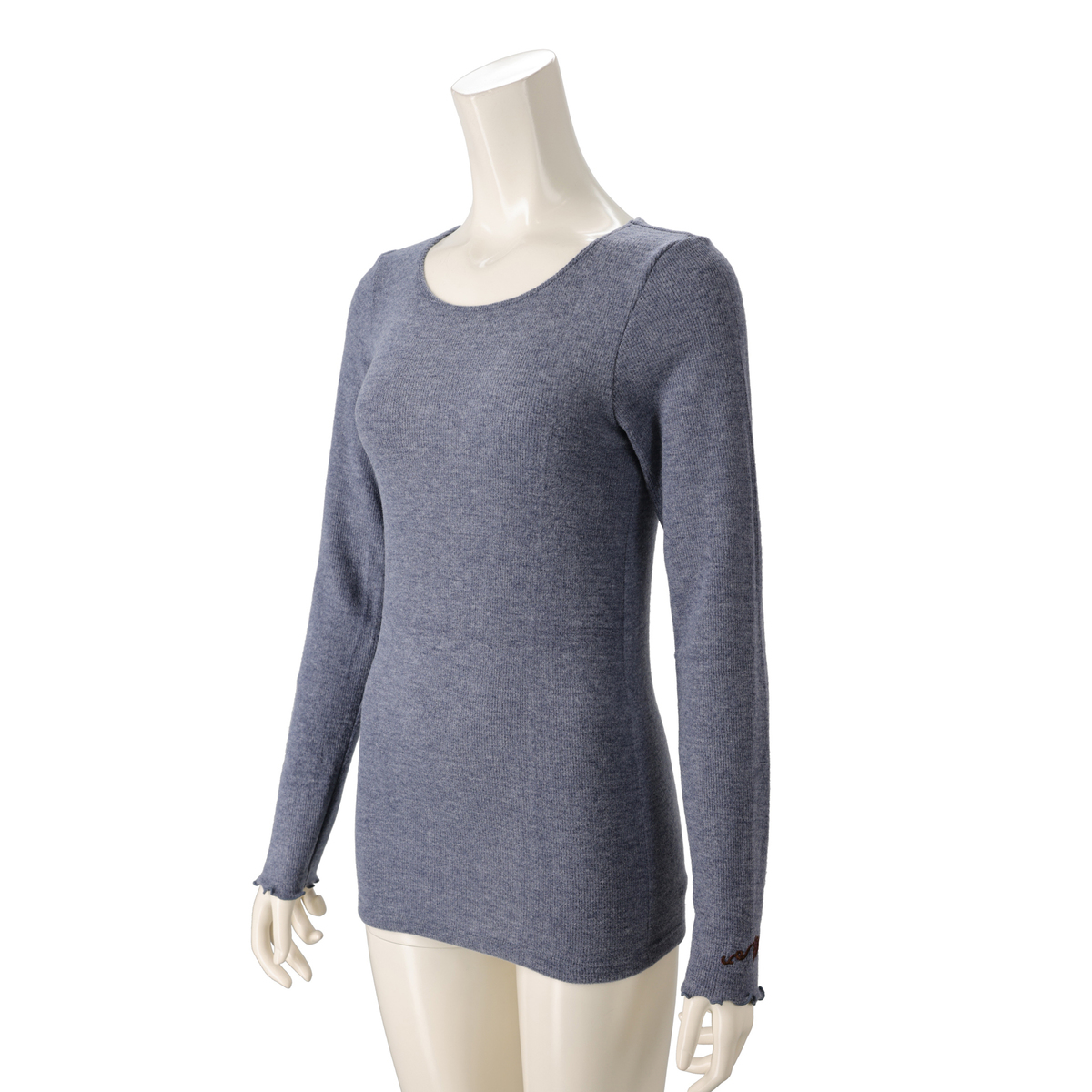 旭化成の吸湿発熱素材サーモギアを使用した丸首インナー。袋編み2重組織の起毛素材でボリューム感があり、起毛の毛足が空気をふんわりと抱き込んで暖かです