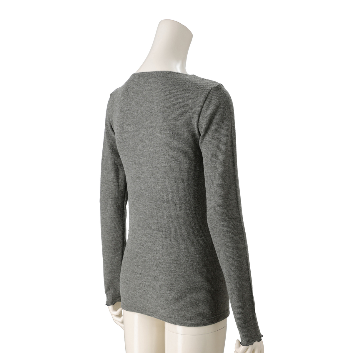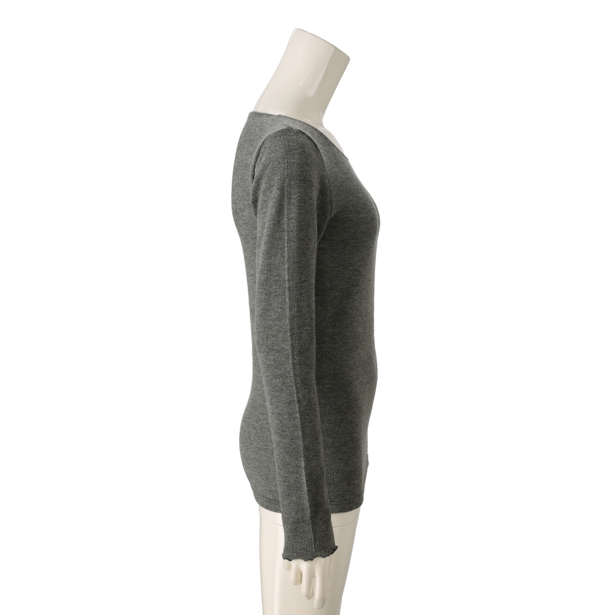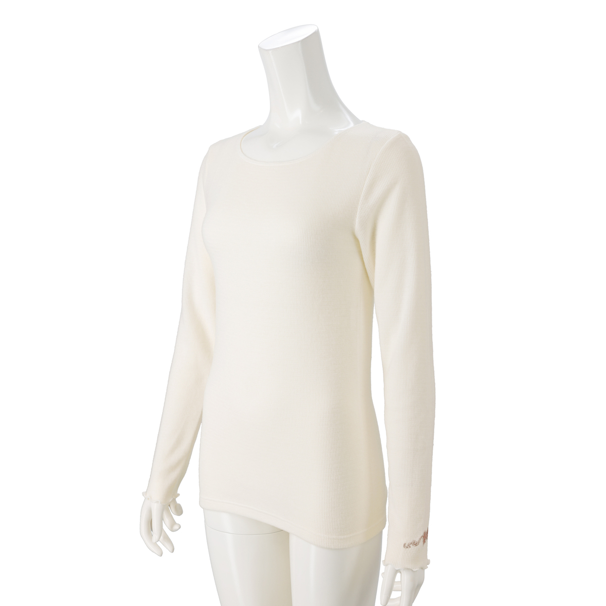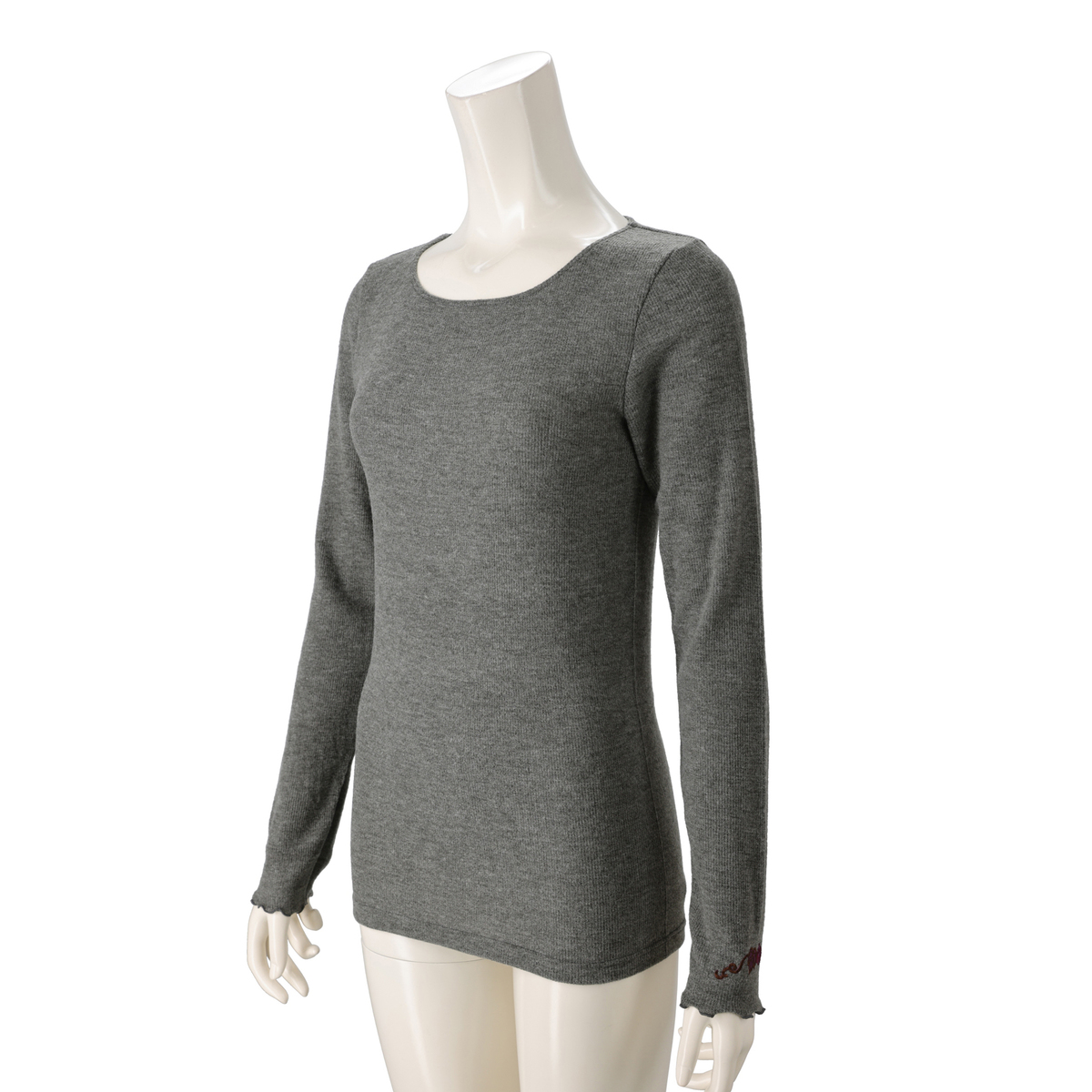 旭化成の吸湿発熱素材サーモギアを使用した丸首インナー。袋編み2重組織の起毛素材でボリューム感があり、起毛の毛足が空気をふんわりと抱き込んで暖かです