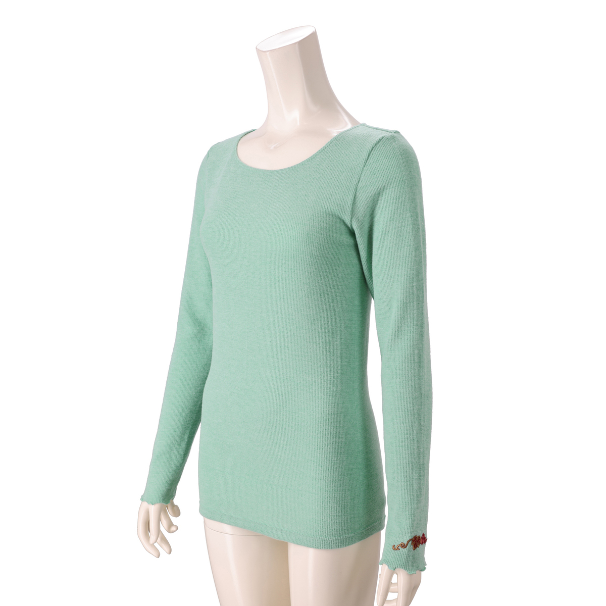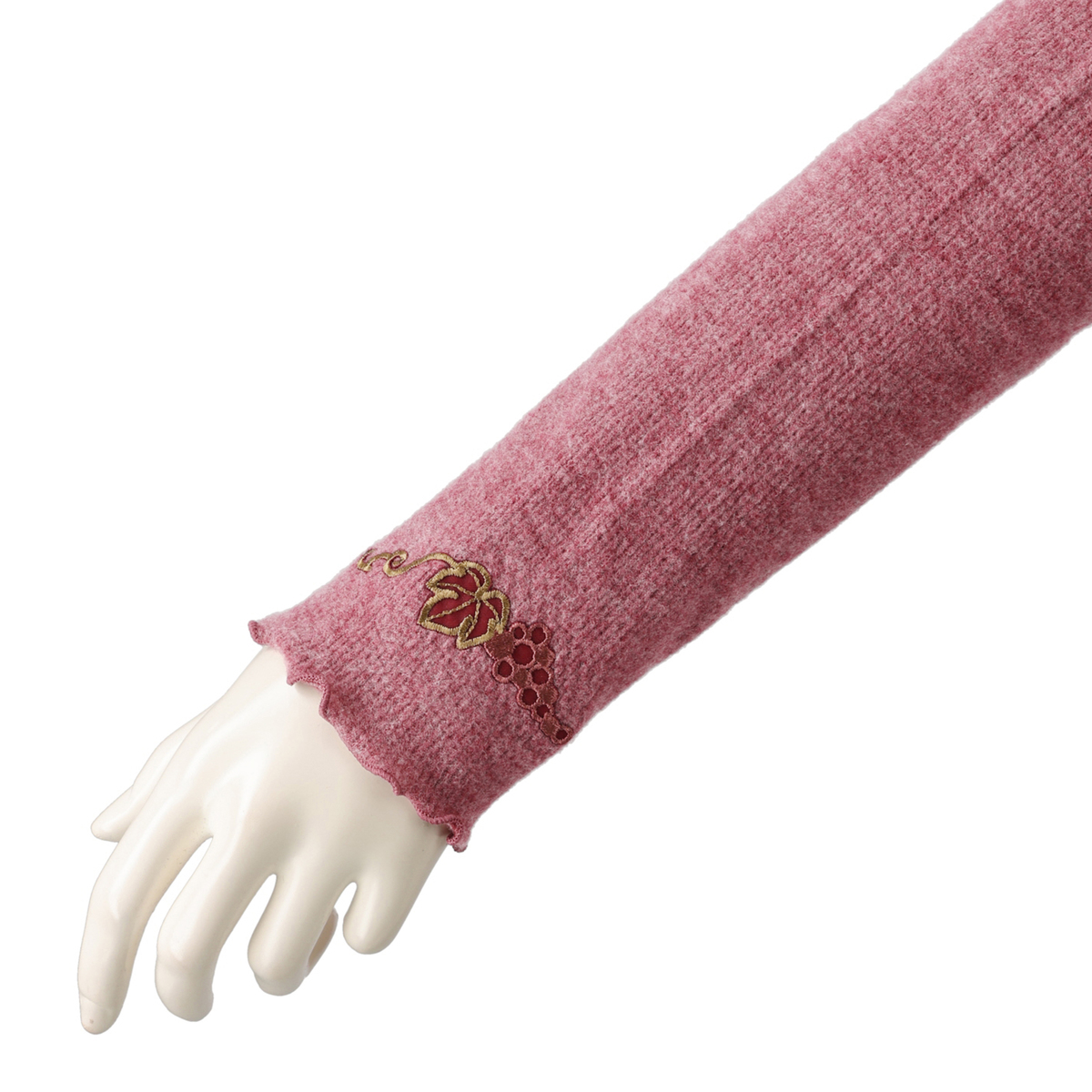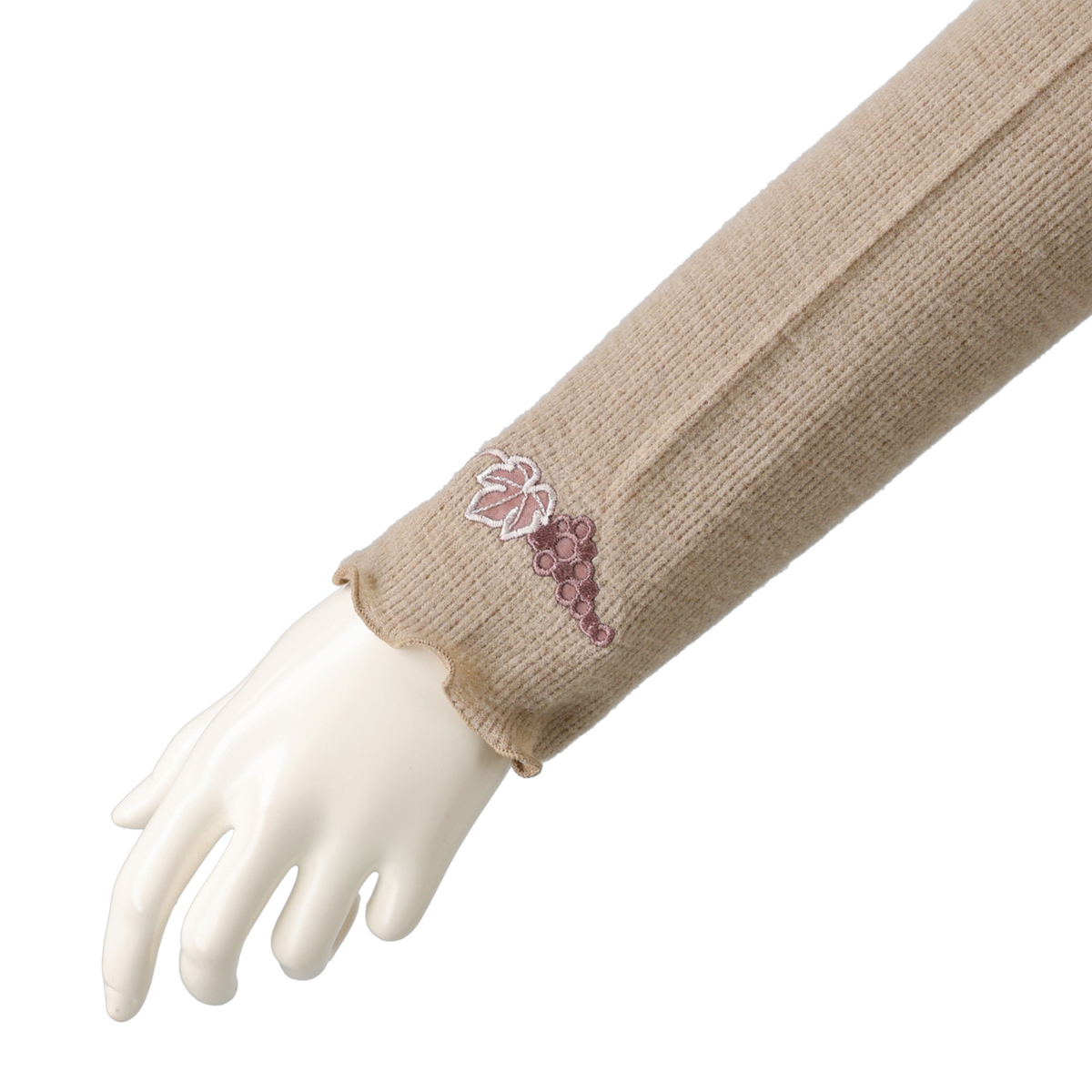 着丈はヒップを包む長めの丈感。重ね着してももたつきにくい程良い厚みで、暖かな着心地です。袖の左手首部分にブレスレット風のアップリケをあしらい、さりげなくおしゃれなポイントになっています
