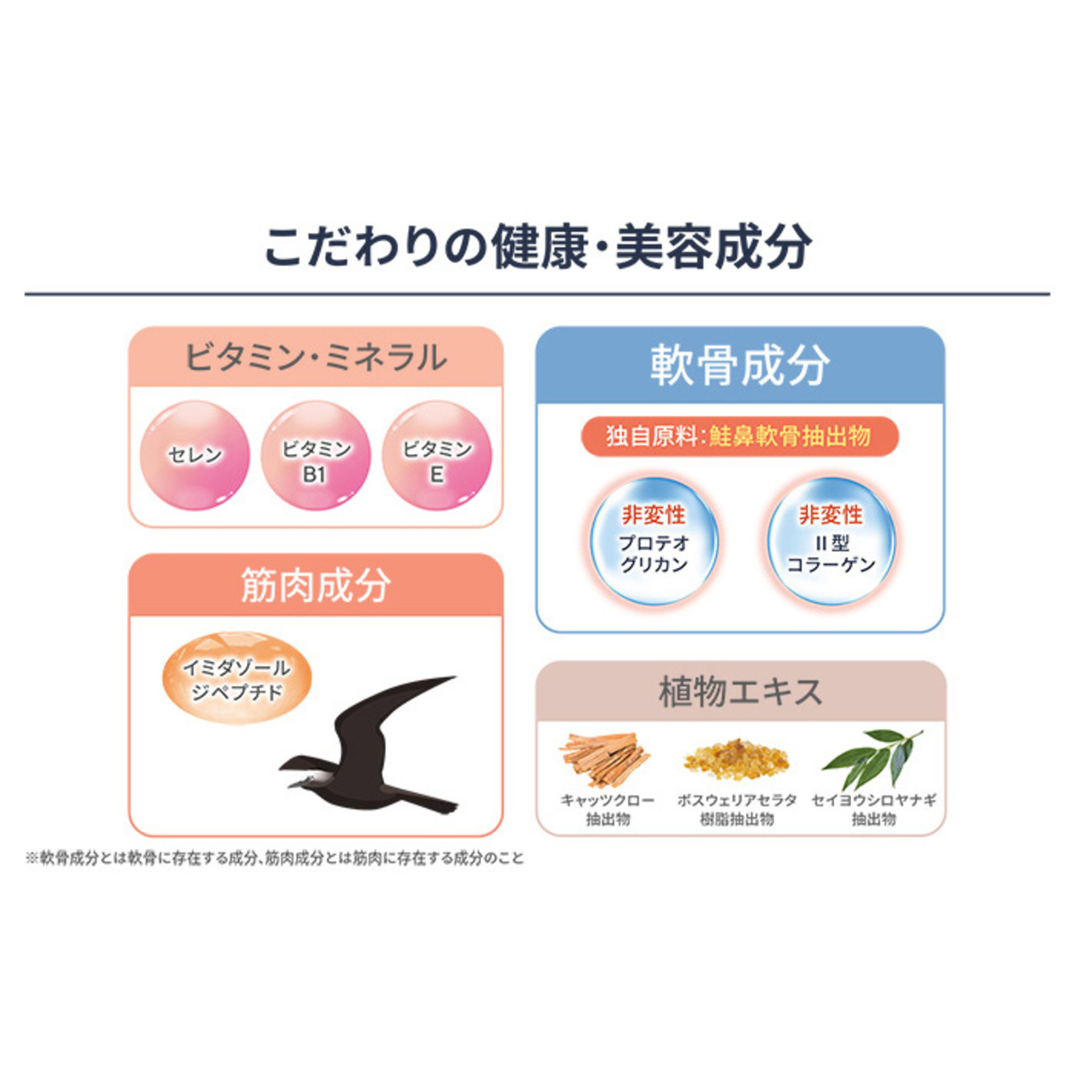 [アレルギー物質特定原材料8品目] なし [内容量] 186粒 [目安量] 1日当たり3粒 [保存方法] 直射日光、高温多湿を避け冷暗所に保存してください [栄養成分表示] 3粒(0.9g)当たりの栄養成分表示 エネルギー 3.97kcal たんぱく質 0.04g 脂質 0.11g 炭水化物 0.71g 食塩相当量 0.0031g [お召し上がり方] 1日当たり3粒を目安に水またはぬるま湯などでお召し上がりください [注意事項] ※開封後は封をしっかり締め、直射日光、高温多湿を避けて保管してください [原料原産地] 元麦芽糖水飴(国内製造) [原産国] 日本 [原材料] 還元麦芽糖水飴(国内製造)、デキストリン、ボスウェリアセラタ樹脂抽出物、キャッツクロー抽出物、鮭鼻軟骨抽出物(非変性プロテオグリカン、非変性2型コラーゲン含有)、チキンエキス(イミダゾールジペプチド含有)、ビール酵母(セレン含有)、セイヨウシロヤナギ抽出物/セルソース、ステアリン酸Ca、微粒酸化ケイ素、抽出ビタミンE、ヒアルロン酸、ビタミンB1、ビタミンB6、ビタミンD、ビタミンB12