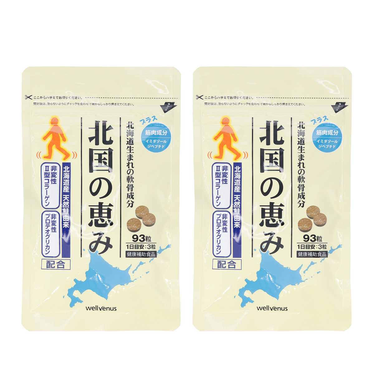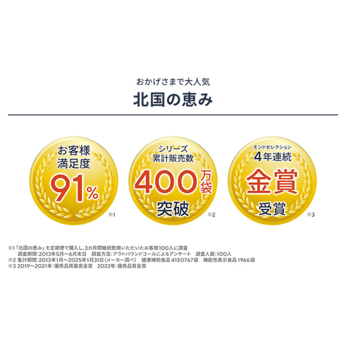 2019年から2022年まで4年連続モンドセレクション受賞*の健康補助食品「北国の恵み」です。鮭鼻軟骨抽出物の原料として使用している鮭は、北海道産の天然の白鮭100%です。1日当たり3粒を目安に水またはぬるま湯などでお召し上がりください