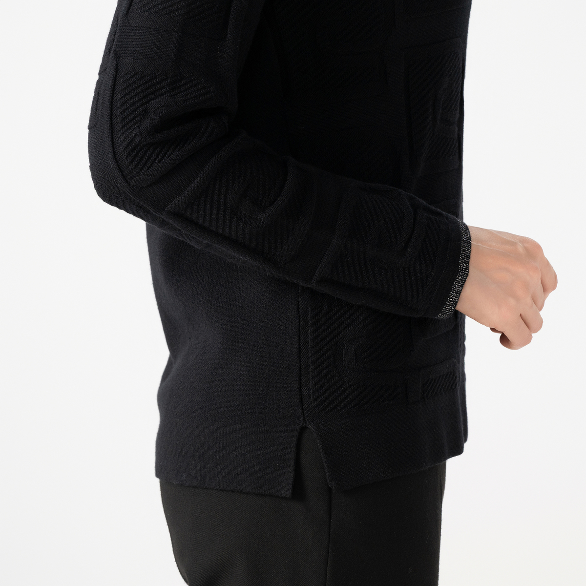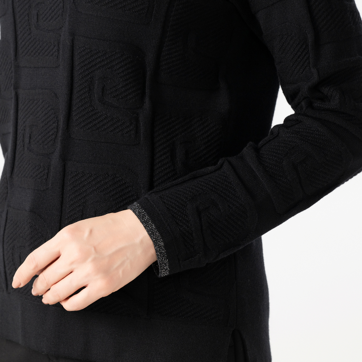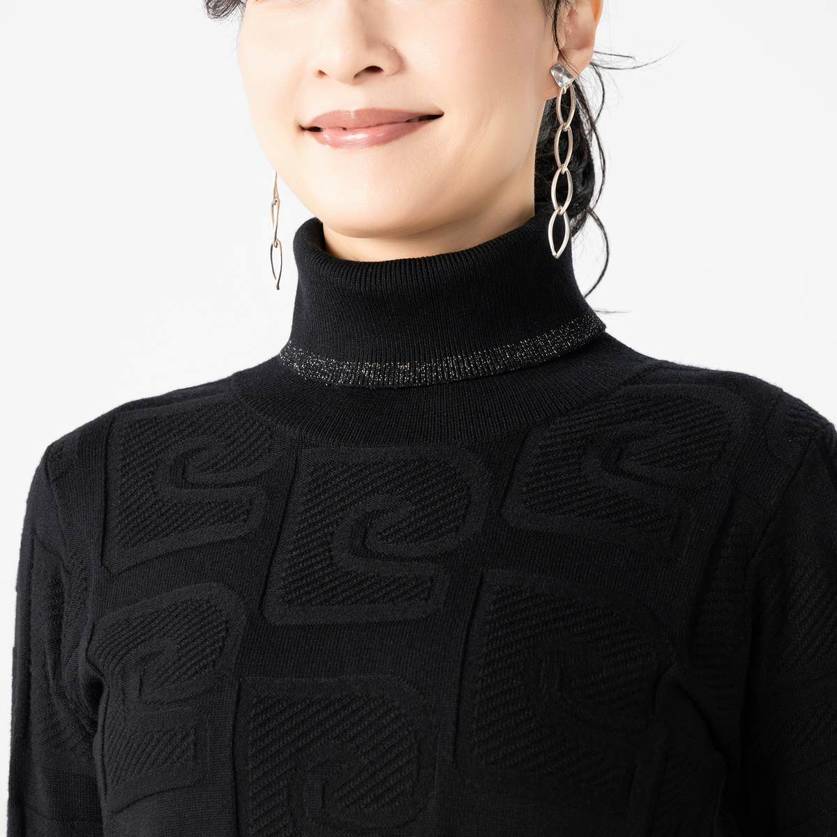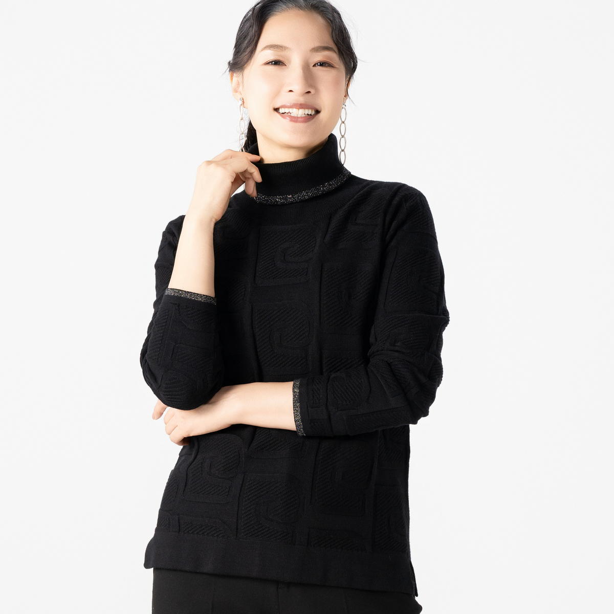 ブランドロゴを贅沢にあしらったジャカード編みで、立体感のあるロゴが高級感を演出。首元はタートルネックで、衿と袖口のラメラインが控えめな華やぎを添えます。サイドスリット入りで軽やか、縦方向に配置したロゴが視線を流し、細見え効果も期待できます