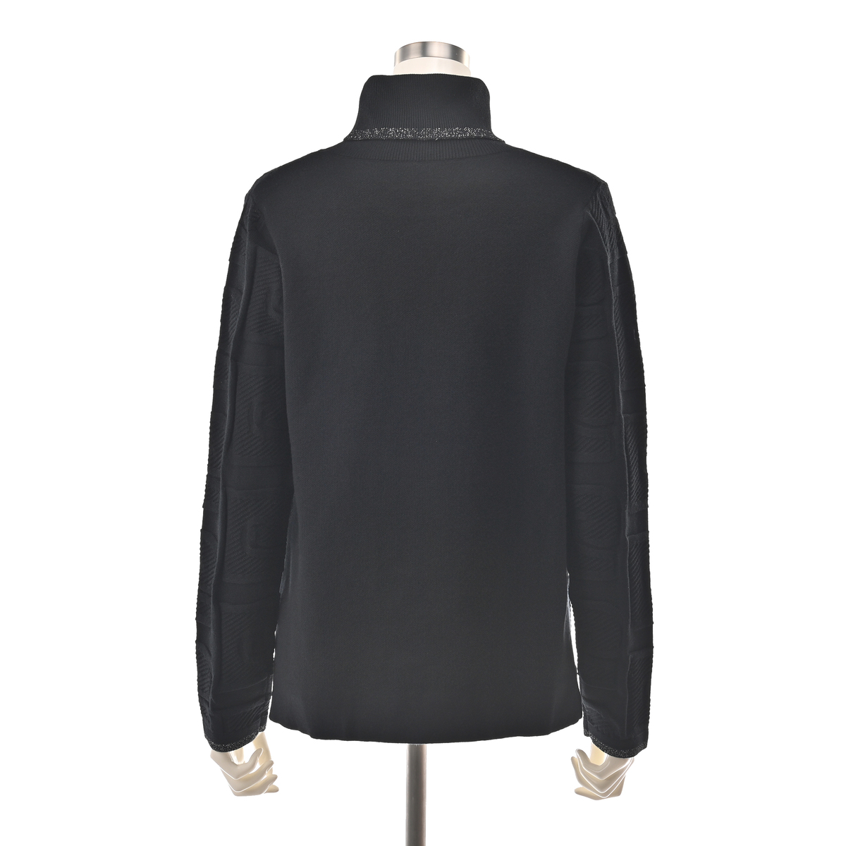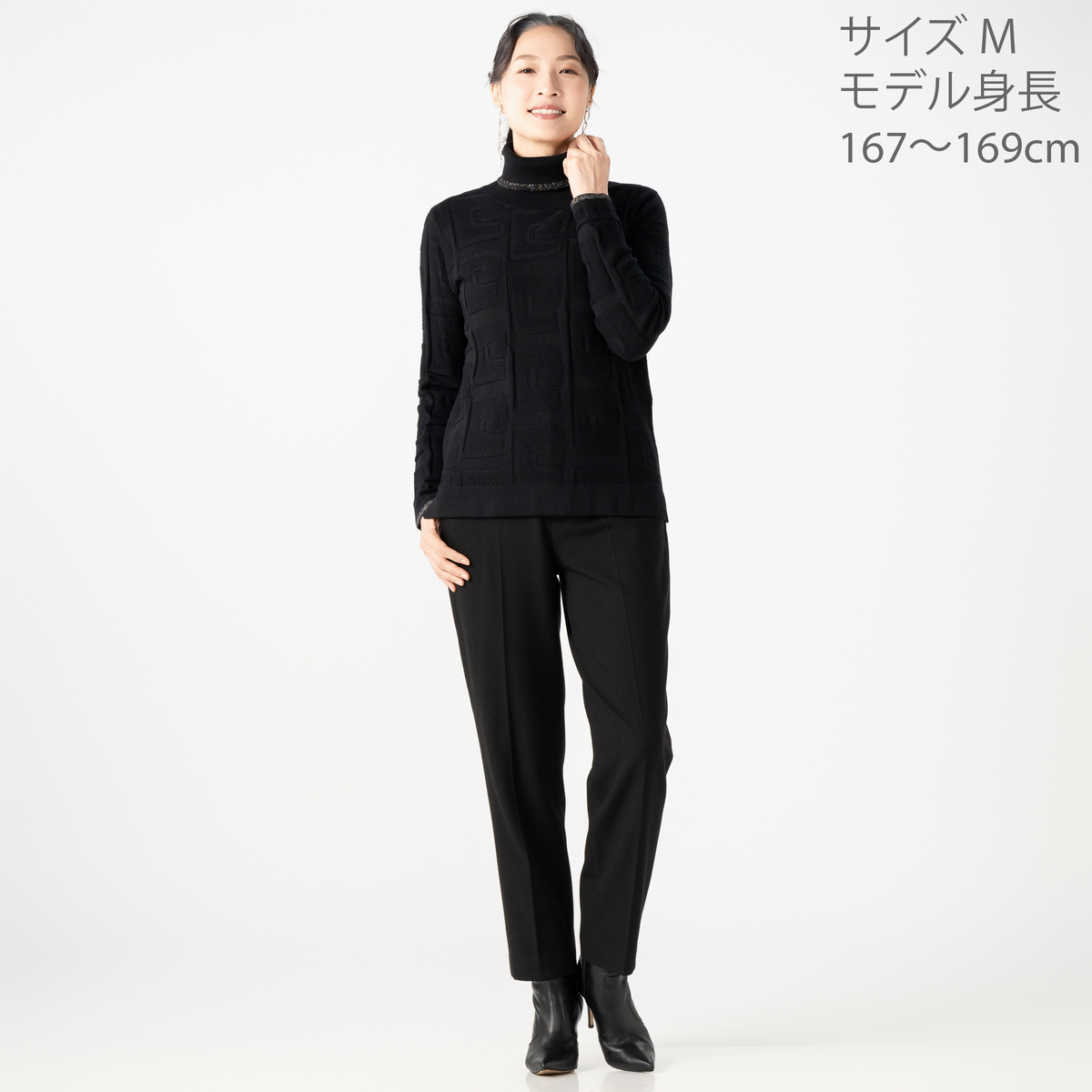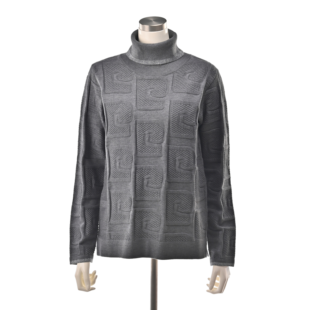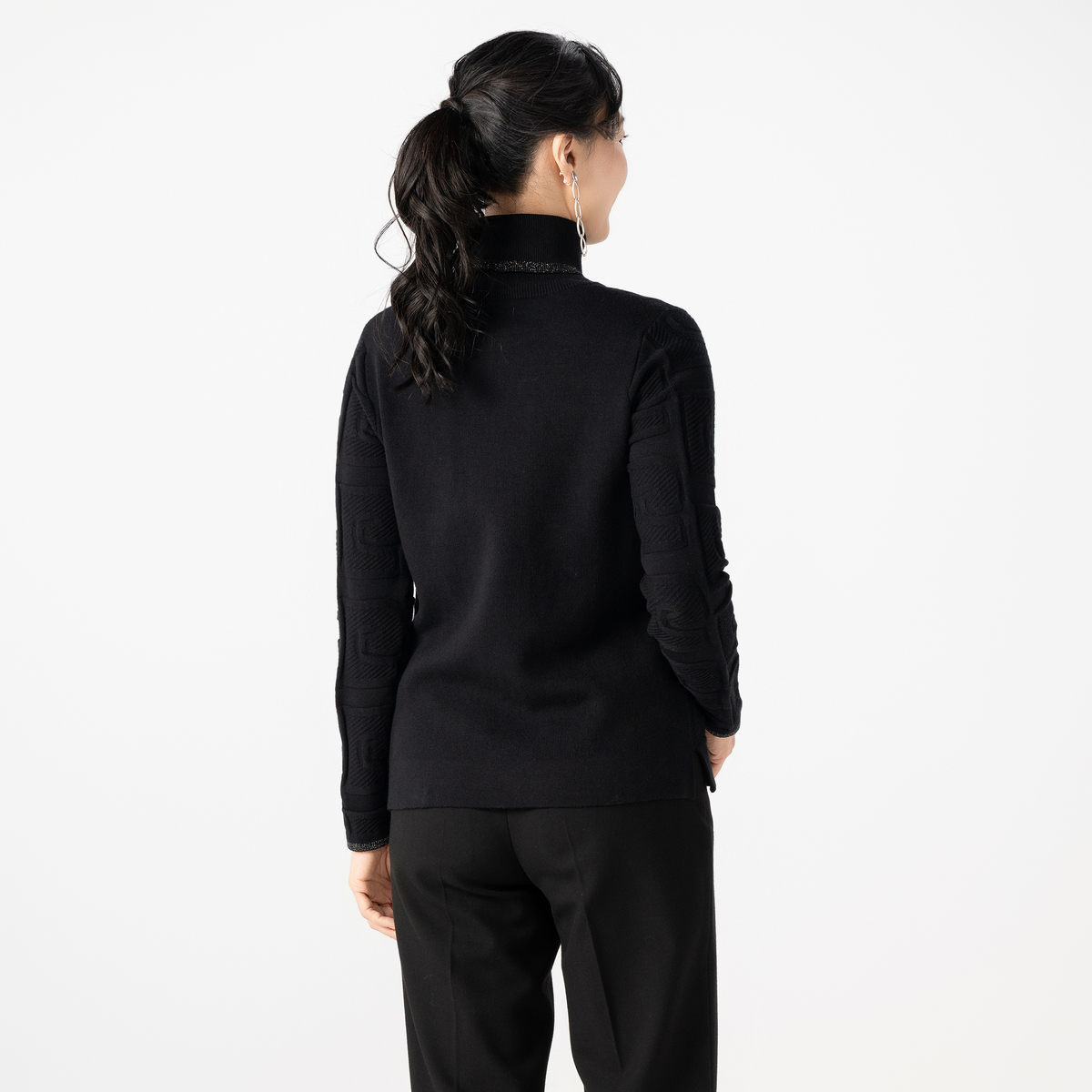 ブランドロゴを贅沢にあしらったジャカード編みで、立体感のあるロゴが高級感を演出。首元はタートルネックで、衿と袖口のラメラインが控えめな華やぎを添えます。サイドスリット入りで軽やか、縦方向に配置したロゴが視線を流し、細見え効果も期待できます