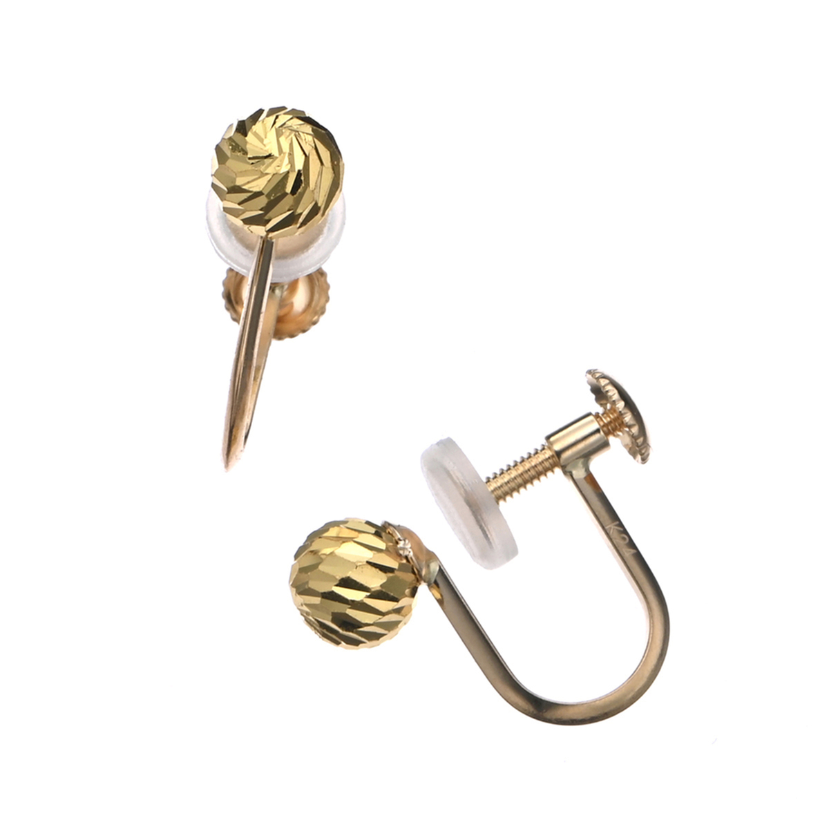 純金のカットボールパーツが存在感たっぷりに輝くイヤリングまたはピアス。シンプルなデザインながらも華やかなきらめきで、耳元にインパクトを与えます。ボールの中心に向かってカット面が細かくなるため、繊細で上品な輝きが特徴です