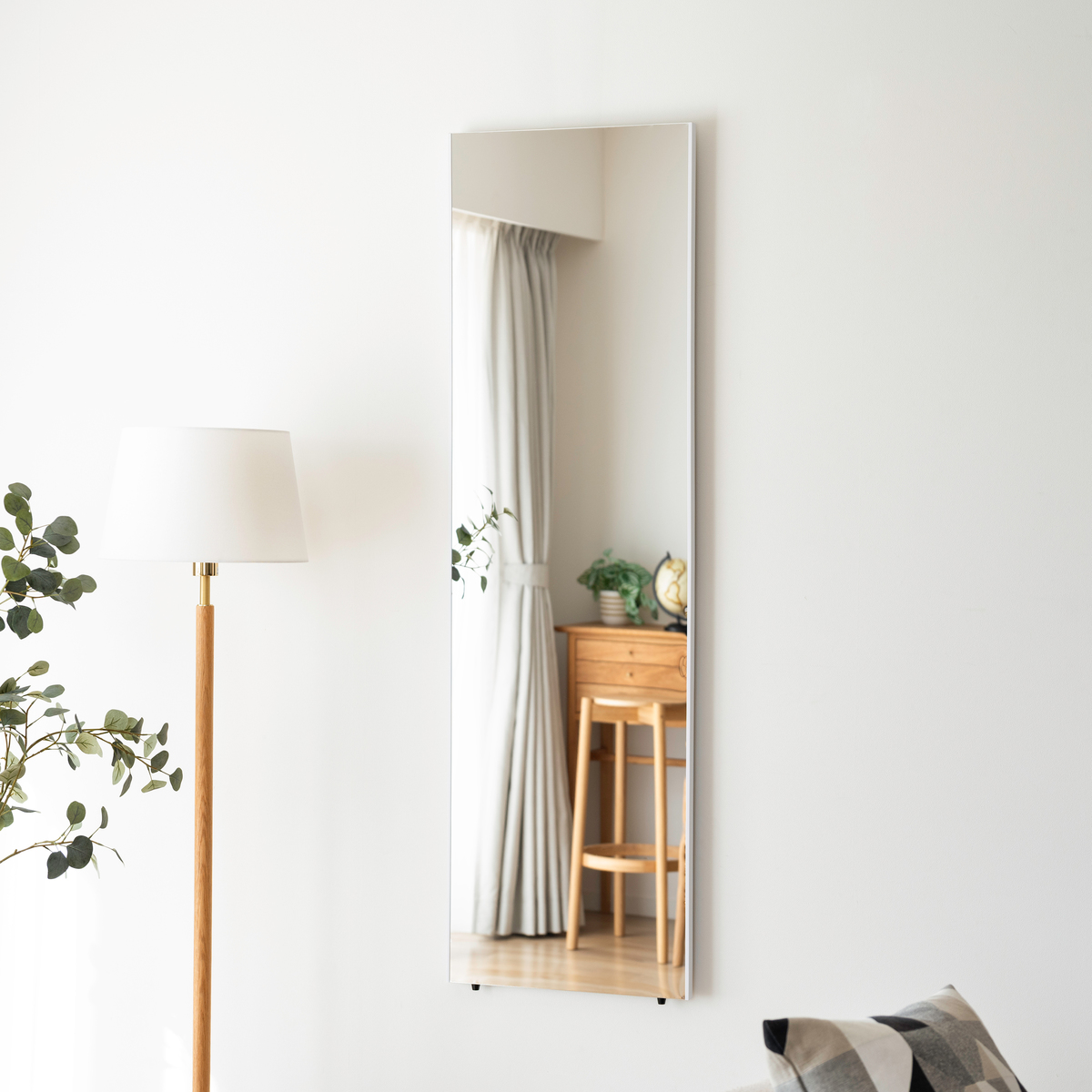 持ち運びやすいスタンドミラー。約1.4kgの軽量設計で移動もラクにでき、鏡ではなくフィルム仕様のミラーなので倒れても割れないのが特長です。45×150cmのワイドサイズで全身をしっかり確認でき、スタンドと壁掛けの2WAY仕様で使う場所も選びません。専用のクリーナークロス付きで、ゴム足によって床にも置きやすい工夫が施されています