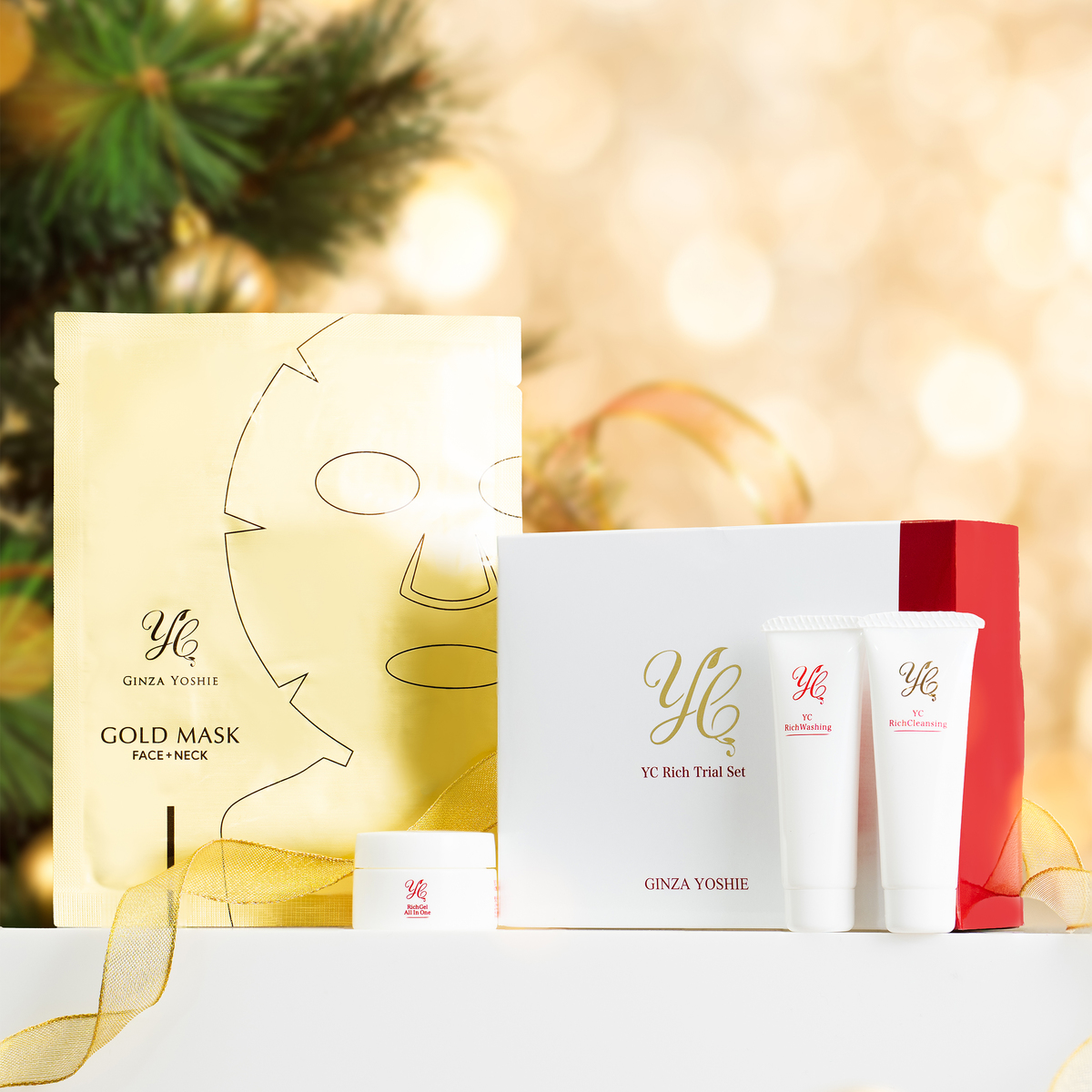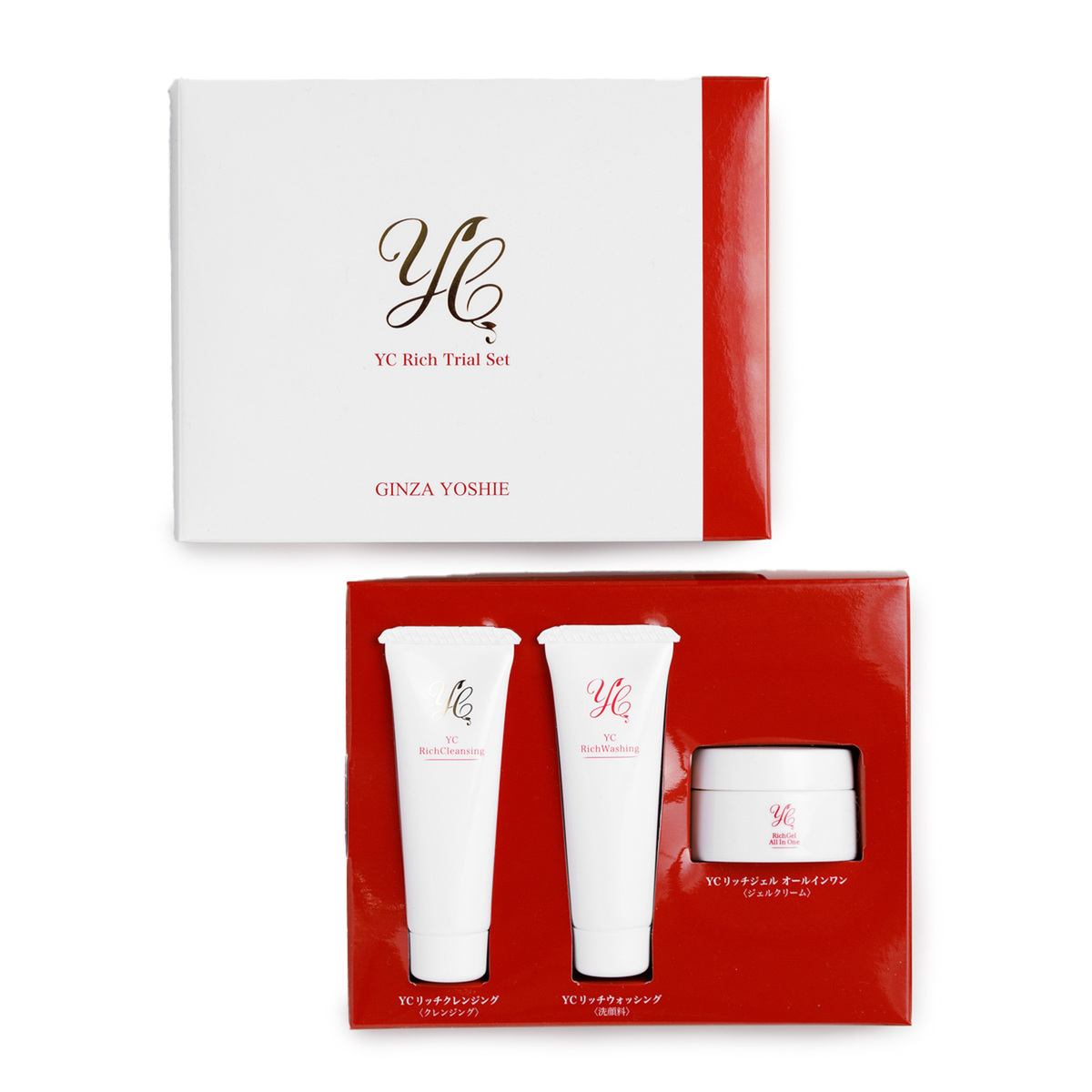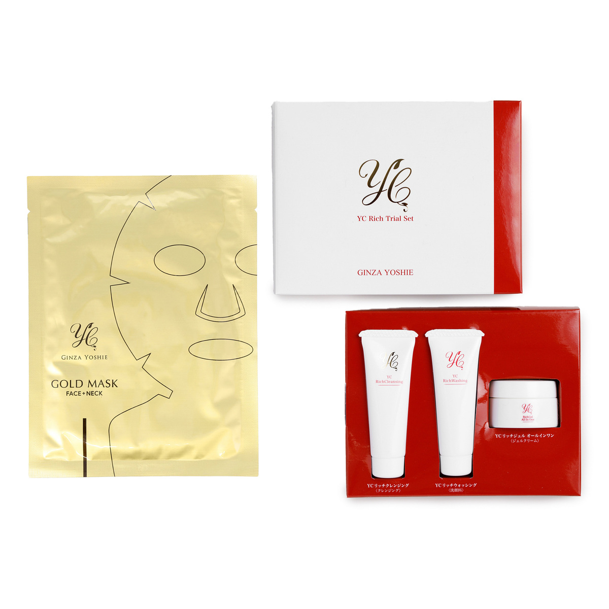 [セット内容] ・YCリッチウォッシング 10g ・YCリッチオールインワンジェル 10ml ・YCリッチクレンジング 10g ・YCゴールドマスク 1枚入り(美容液35mL) [使用方法] <YCリッチウォッシング> 軽くお顔をぬらした後、適量(2cmくらい)を手にとり、水またはぬるま湯を加えてよく泡立てます。泡でお顔全体を包みこむようにやさしく洗い、その後、水またはぬるま湯で充分に洗い流してください <YCリッチオールインワンジェル> 洗顔後、手のひらに適量(さくらんぼ1〜2粒)をとり、お顔全体になじませてください。乾燥等が気になる部分には、重ねてお使いください <YCリッチクレンジング> 乾いた手のひらに適量(さくらんぼ1〜2粒)をとり、お顔全体をリラックスさせるように軽くマッサージしながらのばし、メイクとなじませます。クリームがオイル状に変わったら、水またはぬるま湯で洗い流してください <YCゴールドマスク> 洗顔した後、十分に水気をふき取り、化粧水などで軽くお肌を整えます。袋を開封してマスクを広げ、目・鼻・口の位置に合わせ顔全体と首に密着させます。10分から15分間後マスクをゆっくりはがして下さい。肌に残った美容液は手のひらでなじませてください 【日本製】 [注意事項] <YCリッチウォッシング、YCリッチオールインワンジェル、YCリッチクレンジング> ※お肌に異常が生じていないかよく注意して使用してください ※化粧品がお肌に合わないとき、すなわち次のような場合には、使用を中止してください。そのまま化粧品類の使用を統けますと、症状を悪化させることがありますので、皮ふ科専門医等にご相談されることをおすすめします 1.使用中、赤み、はれ、かゆみ、しげき、色抜け(白斑等)や黒ずみ等の異常があらわれた場合 2.使用したお肌に、直射日光があたって上記のような異常があらわれた場合 ※傷やはれもの、しっしん等、異常のある部位にはお使いにならないでください ※目に入ったときは、直ちに洗い流してください ※使用後は必ずしつかりふたをしめてください ※乳幼児の手の届かないところに保管してください ※極端に高温又は低温の場所、直射日光のあたる場所には保管しないでください [注意事項] <YCゴールドマスク> ※お肌に合わない場合はご使用をおやめください ※ご使用中や使用後または直射日光が当たって、赤み・はれ・かゆみ・刺激・色抜け(白斑等)や黒ずみ等の異常が現れたときは、ご使用を中止し医師に診断をお受けください ※目に入った場合、直ちにきれいな水で洗ってください ※絆創膏による剌激の弱い方は、使用をお避けください。衛生上、一度ご使用になったマスクは繰り返しご使用しないでください ※乳幼児へのご使用、手の届く場所への保管はしないでください ※直射日光を避けて、冷暗所で保管してください ※開封後は直ちにお使いください [成分] YC リッチウォッシング: BG、水、ミリストイルグルタミン酸Na、ソルビトール、ラウロイルグルタミン酸Na、ココイルメチルタウリンNa、コカミドDEA、ミリスチン酸、PCAイソステアリン酸PEG-40水添ヒマシ油、ラウリン酸、PCA-Na、ステアリン酸PEG-60グリセリル、ステアリン酸グリセリル、ペンチレングリコール、デシルグルコシド、グリチルリチン酸2K、ヒアルロン酸Na、他 YC リッチオールインワンジェル: 水、BG、グリセリン、スクワラン、DPG、トリエチルヘキサノイン、ペンチレングリコール、合成ヒト遺伝子組換オリゴペプチド-1、コロイド性白金、アセチルテトラペプチド-59アミドエトキシエトキシアセチルジペプチド-67、フラーレン、グリチルリチン酸2K、ヒアルロン酸Na、アラニン、グリシン、セリン、水添レシチン、パルミチン酸レチノール、他 YC リッチクレンジング: ミネラルオイル、水、ジフェニルシロキシフェニルトリメチコン、トリエチルヘキサノイン、パルミチン酸イソプロピル、BG、ポリソルベート65、イソステアレス-20、ステアリン酸、ジステアリン酸スクロース、ステアロイルメチルタウリンNa、グリチルリチン酸2K、ヒアルロン酸Na、ヒアルロン酸ヒドロキシプロピルトリモニウム、ジヒドロキシプロピルアルギニンHCl、他 YCゴールドマスク: 水、グリセリン、ブロバンジオール、l・2ーヘキサンジオール、ヒト脂肪細胞順化培養液エキス、ナイアシンアミド、加水分解コラーゲン、ヒアルロン酸、アスコルビン酸、ティーツリー葉エキス、ティーツリー葉油、ボスウェリアセラタ樹脂エキス、キサンタンガム、パンテノール、トレハロース、ベタイン、ゼオライト、カルボマー、アルギニン、加水分解ムコ多糖、他