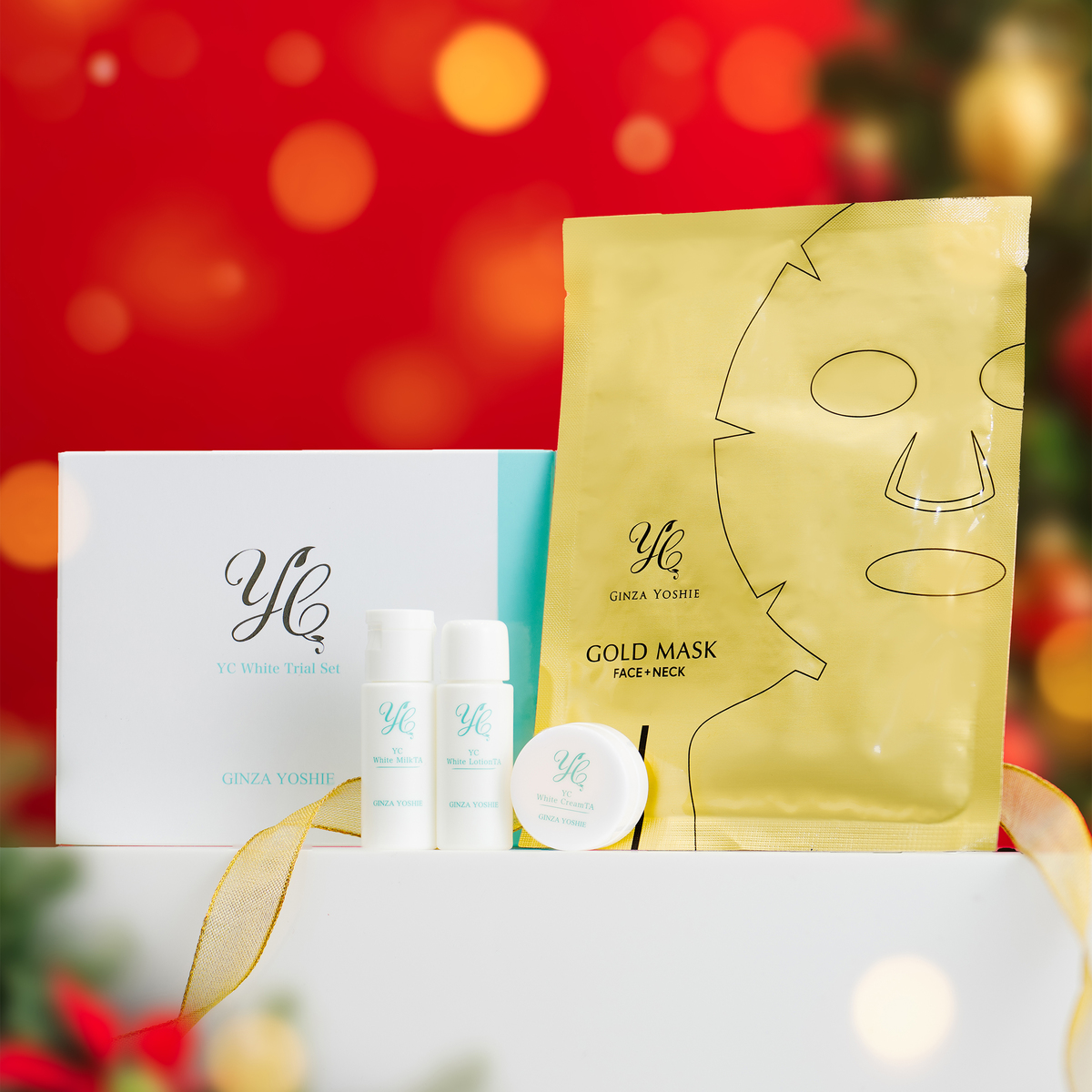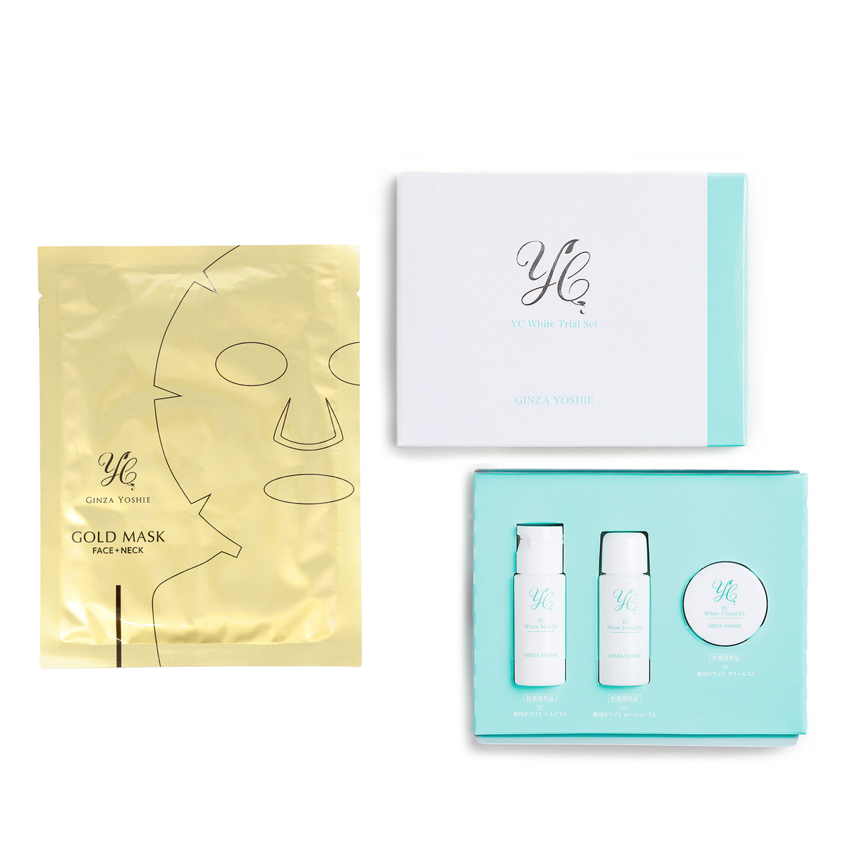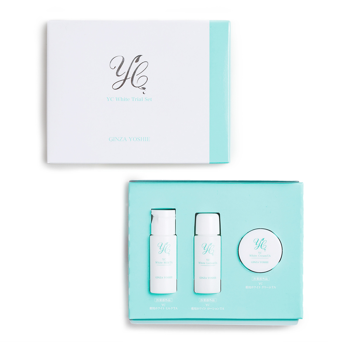 [セット内容] ・薬用ホワイトミルクTA(医薬部外品)10ml ・薬用ホワイトローションTA(医薬部外品)10ml ・薬用ホワイトクリームTA(医薬部外品)3g ・YCゴールドマスク 1枚入(美容液35mL) 【日本製】 [注意事項] ※お肌に合わない場合はご使用をおやめください ※ご使用中や使用後または直射日光が当たって、赤み・はれ・かゆみ・刺激・色抜け(白斑等)や黒ずみ等の異常が現れたときは、ご使用を中止し医師に診断をお受けください ※目に入った場合、直ちにきれいな水で洗ってください ※絆創膏による剌激の弱い方は、使用をお避けください。衛生上、、一度こ使用になったマスクは繰り返しご使用しないでください ※乳幼児へのご使用、手の届く場所への保管はしないでください ※直射日光を避けて、冷暗所で保管してください ※開封後は直ちにお使いください ■医薬部外品 <薬用ホワイトミルクTA> 肌あれ・あれ性。あせも・しもやけ・ひび・あかぎれ・にきびを防ぐ。油性肌。かみそりまけを防ぐ。メラニンの生成を抑え、しみ、そばかすを防ぐ。日やけ・雪やけ後のほてりを防ぐ。肌をひきしめる。肌を清浄にする。肌を整える。皮膚をすこやかに保つ。皮膚にうるおいを与える <薬用ホワイトローションTA> 肌あれ・あれ性。あせも・しもやけ・ひび・あかぎれ・にきびを防ぐ。油性肌。かみそりまけを防ぐ。メラニンの生成を抑え、しみ、そばかすを防ぐ。日やけ・雪やけ後のほてりを防ぐ。肌をひきしめる。肌を清浄にする。肌を整える。皮膚をすこやかに保つ。皮膚にうるおいを与える <薬用ホワイトクリームTA> 肌あれ・あれ性。あせも・しもやけ・ひび・あかぎれ・にきびを防ぐ。油性肌。かみそりまけを防ぐ。メラニンの生成を抑え、しみ、そばかすを防ぐ。日やけ・雪やけ後のほてりを防ぐ。肌をひきしめる。肌を清浄にする。肌を整える。皮膚をすこやかに保つ。皮膚にうるおいを与える [成分] 薬用ホワイトローションTA:有効成分:トラネキサム酸、グリチルリチン酸ジカリウム その他成分:精製水、酵母エキス(1)、ヒアルロン酸ナトリウム(2)、ヒナギク花エキス、ビフィズス菌エキス、ビルベリー葉エキス、プルーン酵素分解物、油溶性甘草エキス(2)、1,3ーブチレングリコール、濃グリセリン、1,2ーペンタンジオール、スクワラン、パルミチン酸レチノール、ラッカセイ油他 [成分] 薬用ホワイトミルクTA:有効成分:トラネキサム酸、グリチルリチン酸ジカリウム その他成分:精製水、オレンジ果汁、グレープフルーツエキス、酵母エキス(1)、サンザシエキス、 タイソウエキス、ヒナギク花エキス、ビフィズス菌エキス、プルーン酵素分解物、ポリアクリル酸アミド、マカデミアナッツ油、ライム果汁、ラッカセイ油、リンゴエキス、レモン果汁、油溶性甘草エキス(2)、 1,3ーブチレングリコール、シクロヘキサンジカルボン酸ビスエトキシジグリコール、ジプロピレングリコール、グリセリンモノ2ーエチルヘキシルエーテル、濃グリセリン、軽質流動イソパラフィン、 スクワラン、2ーエチルヘキサン酸セチル、トリ2ーエチルヘキサン酸グリセリル、パルミチン酸レチノール、水素添加大豆リン脂質、ベへニルアルコール、ポリオキシエチレンセチルエーテル、ポリオキシエチレンラウリルエーテル(7E.O.)、親油型モノステアリン酸グリセリル、 モノステアリン酸ポリエチレングリコール、モノラウリン酸ポリグリセリル、メチルポリシロキサン、アクリル酸メタクリル酸アルキル共重合体、キサンタンガム、水酸化ナトリウム、酢酸DLーαートコフェロール、テトラ2ーヘキシルデカン酸アスコルビル、パラオキシ安息香酸エステル 薬用ホワイトクリームTA:有効成分:トラネキサム酸、グリチルリチン酸ジカリウム その他成分:精製水、アーティチョークエキス、ヒナギク花エキス、ビフィズス菌エキス、プルーン酵素分解物、マルチトール、酵母エキス(1)、油溶性甘草エキス(2)、1,3ーブチレングリコール、 濃グリセリン、1,2ーペンタンジオール、スクワラン、トリ2ーエチルへキサン酸グリセリル、パルミチン酸レチノール、パルミチン酸イソプロピル、フィトステロール、ヘキサオキシステアリン酸ジペンタエリトリット、シクロヘキサンシ゛カルホ゛ン酸ヒ゛スエトキシシ゛ク゛リコール、ラッカセイ油、ステアリルアルコール、自己乳化型モノステアリン酸グリセリル、親油型モノステアリン酸グリセリル、 モノラウリン酸ポリグリセリル、水添大豆リン脂質、グリセリンモノ2?エチルヘキシルエーテル、メチルポリシロキサン、キサンタンガム、クエン酸、テトラ2ーヘキシルデカン酸アスコルビル、酢酸DLーαートコフェロール、天然ビタミンE、パラオキシ安息香酸エステル