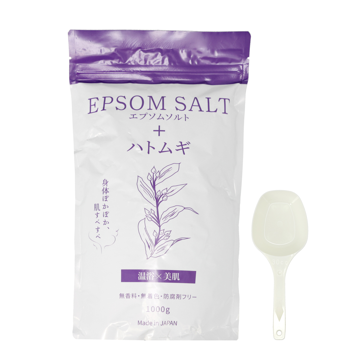 [商品内容] エプソムソルトH 1000g [使用方法] 150Lのお風呂に150cc以上。付属の計量スプーン5杯〜7杯入れてください。数秒でお湯が白く濁りまた透明にもどり水道水の塩素は中和されます。入浴時間20分をお勧めします [注意事項] お肌に合わないとき、即ち次のような場合には、使用しないでください。そのまま使い続けますと、症状を悪化させることがありますので、皮膚科医等にご相談されることをお勧めいたします 1.使用中、赤身、はれ、かゆみ、刺激等の異常が現れた場合 2.使用した肌に、直射日光が当たって上記のような異常があらわれた場合 ※目に入ったときは直ちに洗い流してください ※24時間風呂など、機械によっては使用できない風呂釜があります。お使いの機種の説明書をご確認ください ※ご使用後は、チャックをしっかり閉めてください ※常温にて暗所に保管してください ※幼少時の手の届かない所に保管してください ※本品は食べられません 【日本製】 [成分] 硫酸Mg、ハトムギ種子、ヒアルロン酸Na、コメエキス