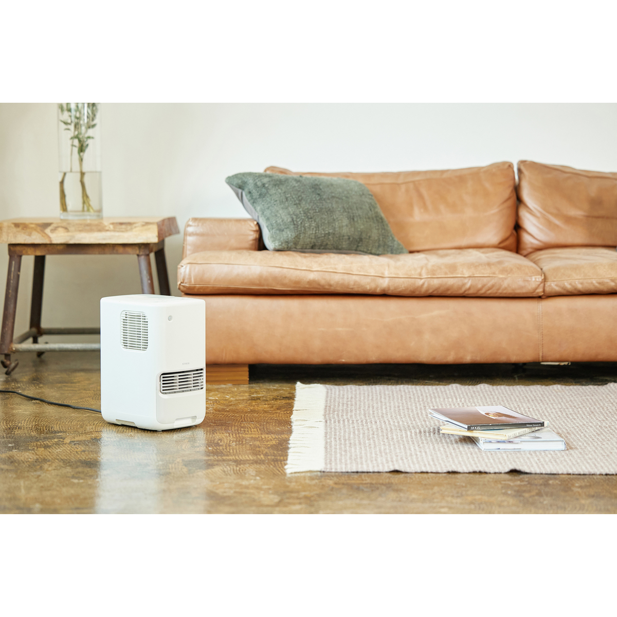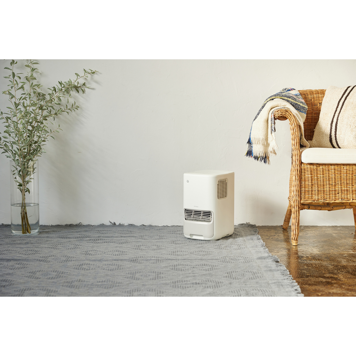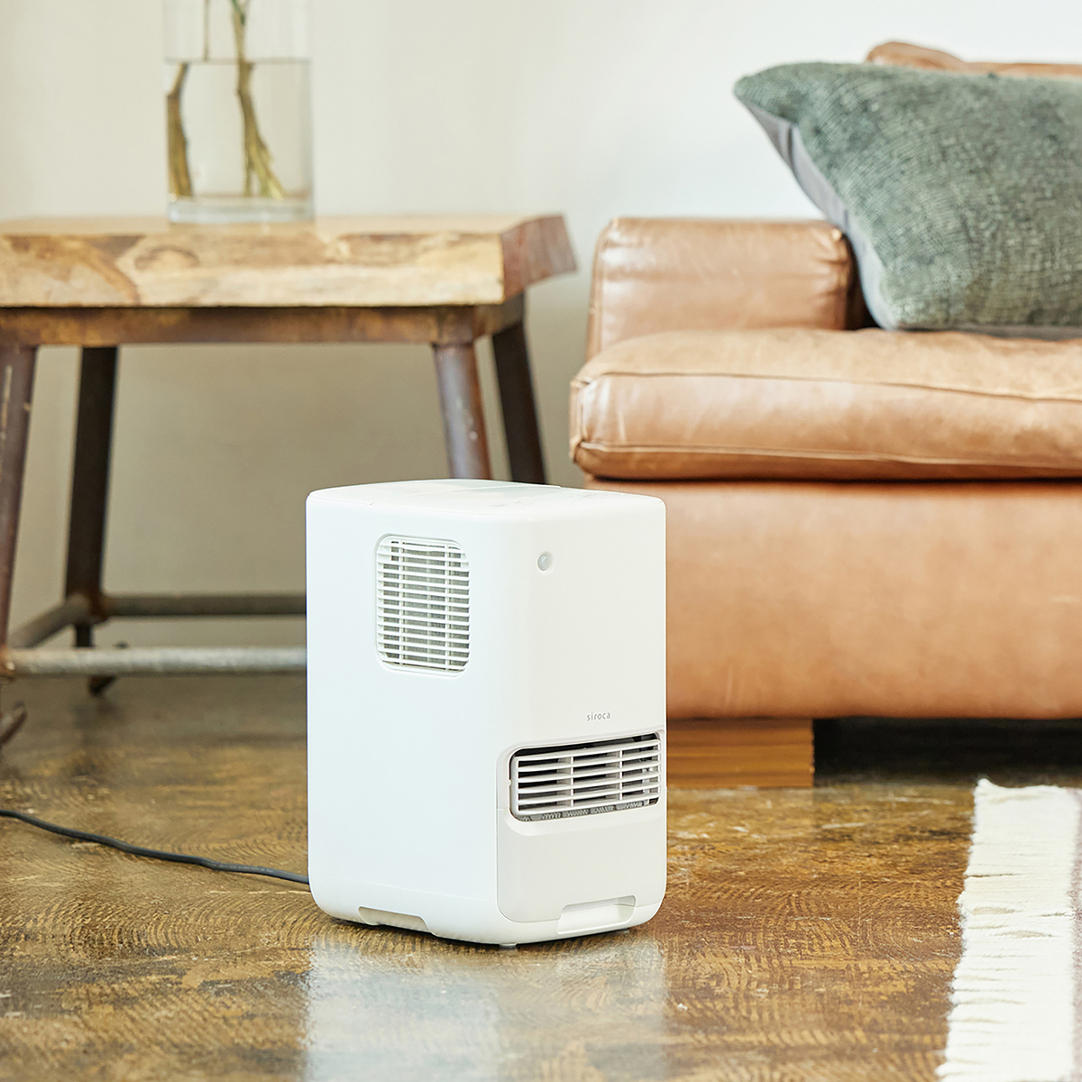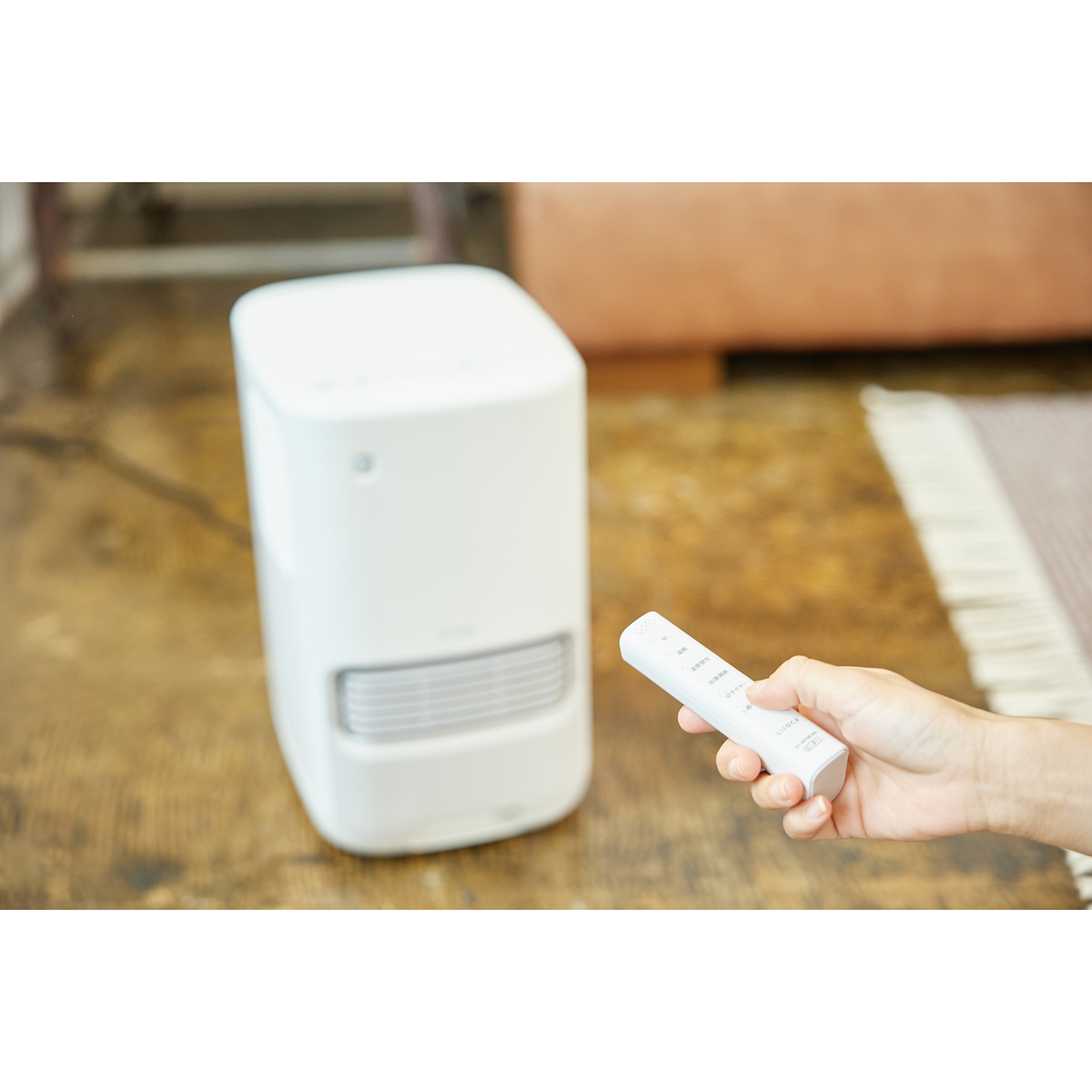 セラミックファンヒーターに加湿機能を備え、3段階の温風と3段階の加湿設定が可能です。リモコンに湿度センサーを搭載し、自分の近くに置くことで適度な湿度を調整可能(*1)。最大1時間で500mlの加湿量(*2)で、しっかりサポートします