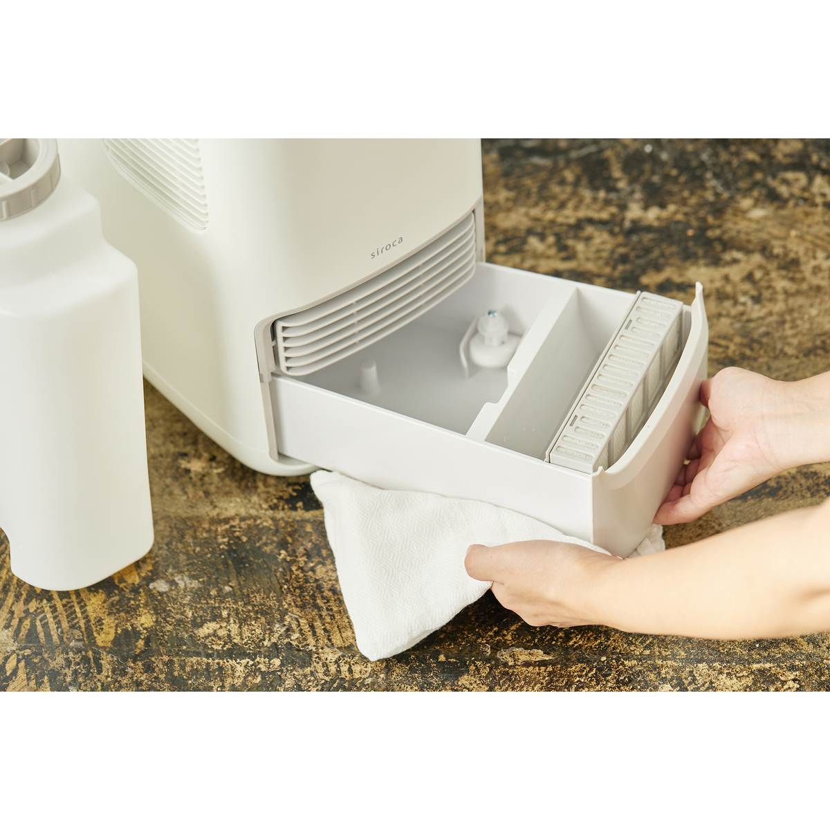 [商品内容] ・本体 ・リモコン(単4形乾電池/モニター用) [サイズ] 幅21×奥行27×高さ35cm [重量] 4.1kg [水タンク容量] 約3L [コード長さ] 1.8m [材質] ABS、PET、PE、合成ゴム [消費電力] 1000W(温風強) [安全装置] 転倒自動停止装置、過熱防止装置 [適用面積] 木造和室:約8.5畳 プレハブ洋室:約14畳 [加湿量] 1時間当たり最大約500mL [使用方法] 1、水タンクふたを開けて、水タンクを取り出す 2、水タンクに水道水を入れる 3、水タンクを本体にゆっくり入れる 4、電源プラグをコンセントに差し込む 5、風向きを調整する 6、入/切ボタンを押して、運転を開始する ■取り扱い説明を充分にご確認の上、ご使用下さい 【中国製】 [お手入れ] 本体は乾いた布で拭き、汚れがひどい場合は薄めた中性洗剤を使用します。水タンクは給水のたびに少量の水で振り洗いし、洗剤を使う場合はしっかりすすぎます <フィルター> ・フィルターをつまみを引いて取り外す ・ほこりを掃除機で除去し、汚れがひどい場合は水洗い後に乾燥させる ・フィルターのツメを本体に差し込み、マグネットで固定する <加湿トレー・加湿フィルター> 1、お手入れの準備 まず、安全のため電源プラグを抜き、水タンクを取り外します。次に、加湿トレーをゆっくりと引き出し、中の水を捨てて下さい。勢いよく引き出すと水がこぼれる原因になるので注意が必要です 2、加湿フィルターのつけ置き洗い 加湿フィルターは、型崩れを防ぐために加湿フィルターケースにセットしたまま、水またはぬるま湯(約40℃以下)につけ置き洗いをします。ひどい汚れがある場合は、水1リットルに対してクエン酸6グラムを溶かした溶液に約2時間つけ置きするのが効果的です。つけ置き後は、フィルターを十分にすすいで下さい 3、加湿トレーのお手入れ 加湿トレーは水洗いし、細かい汚れは歯ブラシや綿棒を使って取り除きます。水位を検知するフロートが汚れている場合は、フロートがスムーズに上下に動くように、綿棒などで軽くこすって汚れを落として下さい 4、組み立てと交換時期 お手入れが終わったら、加湿フィルターを加湿トレーにセットします。この際、フィルターは前後どちらの向きでも取り付け可能です 加湿フィルターは、使用状況やお手入れの頻度にもよりますが、約6か月に1回の交換が目安です。以下のような状態になった場合は、早めの交換をおすすめします 変色や汚れがひどい 傷みや型崩れがひどい [注意事項] ※水道水以外は使わないで下さい ※高温部に触れない(やけど防止) ※外出や長期間使用しない場合は電源プラグを抜く(感電・火災防止) ※他の用途に使用しない(過熱・火災防止) ※吸気口や送風口をふさがない(過熱・火災防止) ※初回使用時は換気を行う(におい対策) ※落下や衝撃を与えない(故障防止) ※ペットが触れないよう保護する(感電・火災・やけど防止) ※長時間同じ箇所を暖めない(低温やけど防止) ※移動時は水タンクと加湿トレーを外し、水平に運ぶ(けが・水漏れ防止) ※排水やお手入れは本体が冷めてから行う(やけど防止) ※加湿の水は毎日交換し、清潔に保つ(カビ・雑菌防止) ※健康に異常を感じた場合は医師に相談する