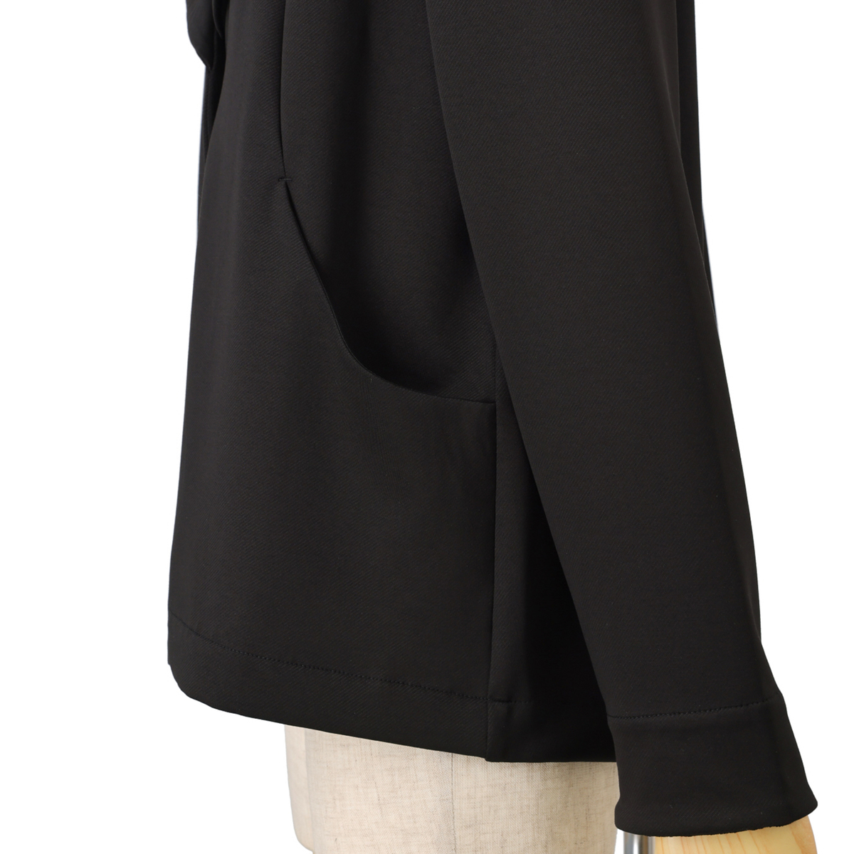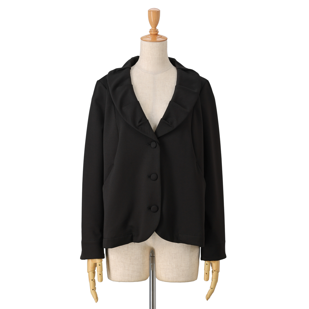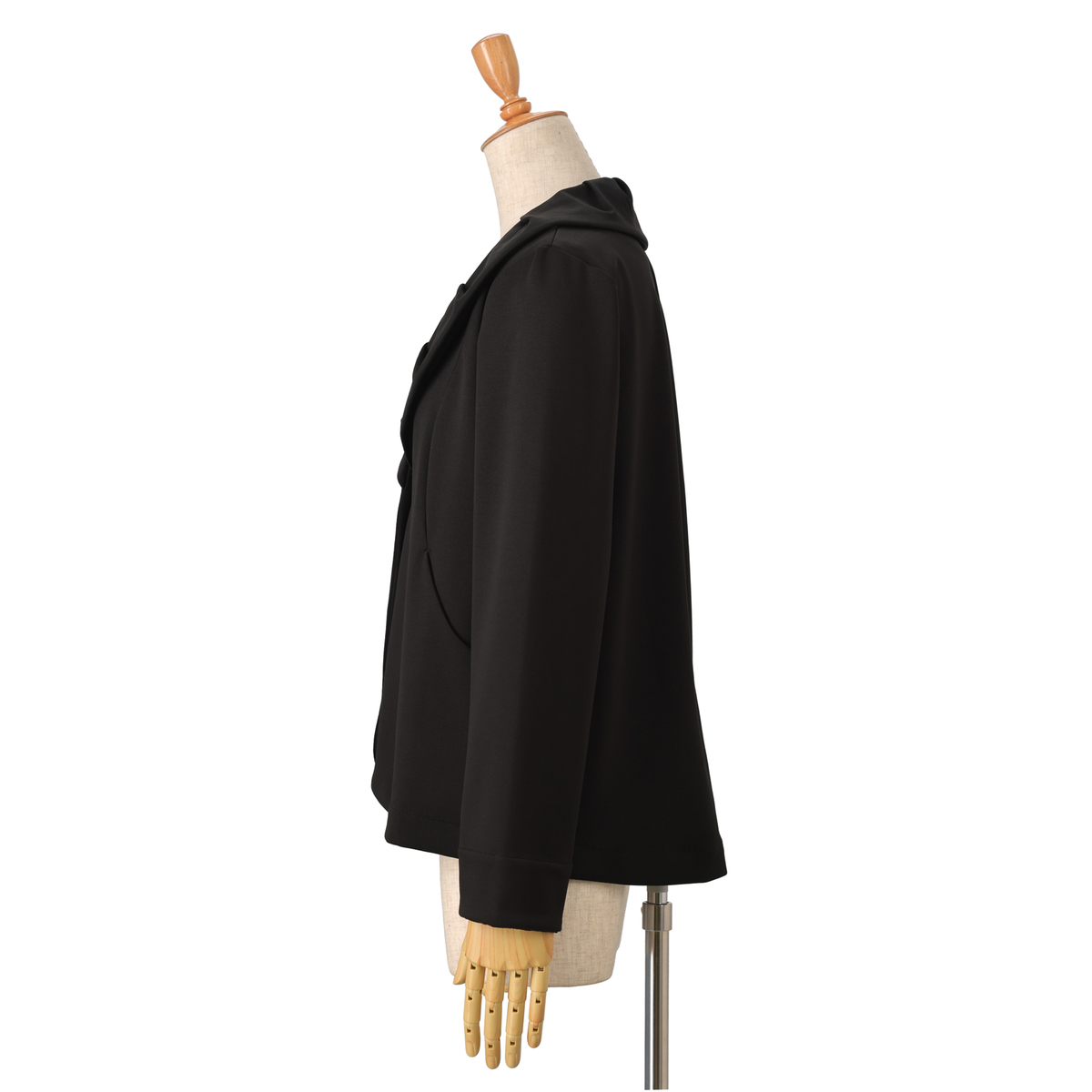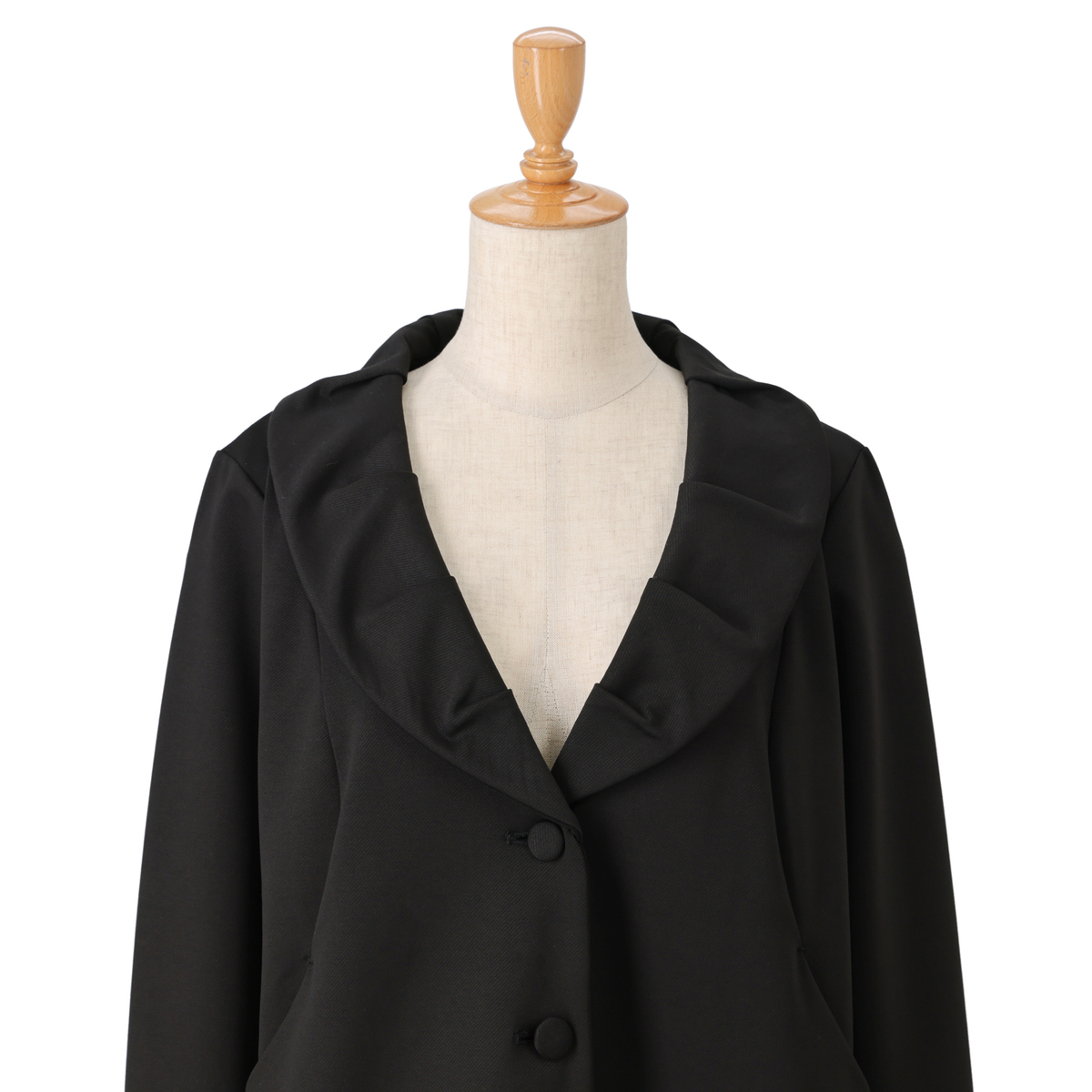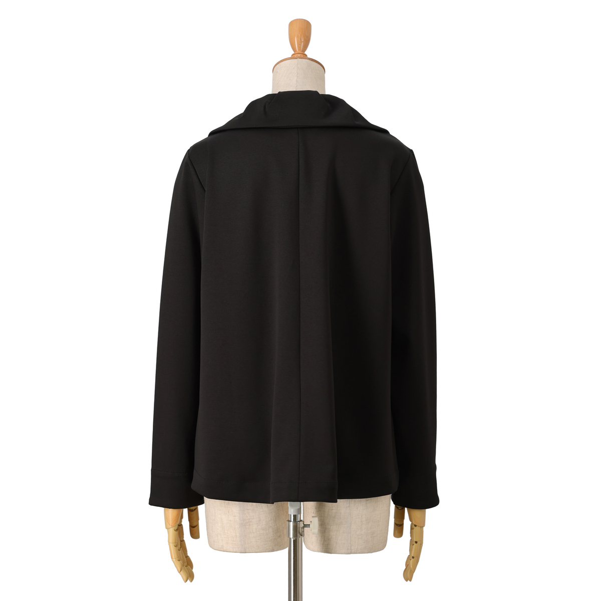前端の裾に丸みを持たせたショート丈のジャケット。タックを入れたショールカラーの襟がポイントです。首周りに沿うよう、タック位置を調整し作られています