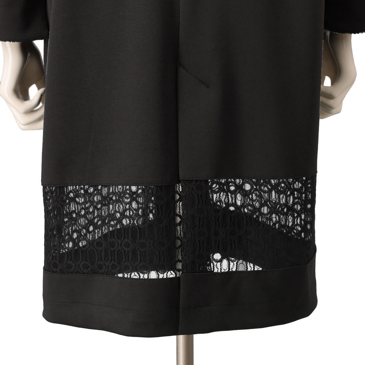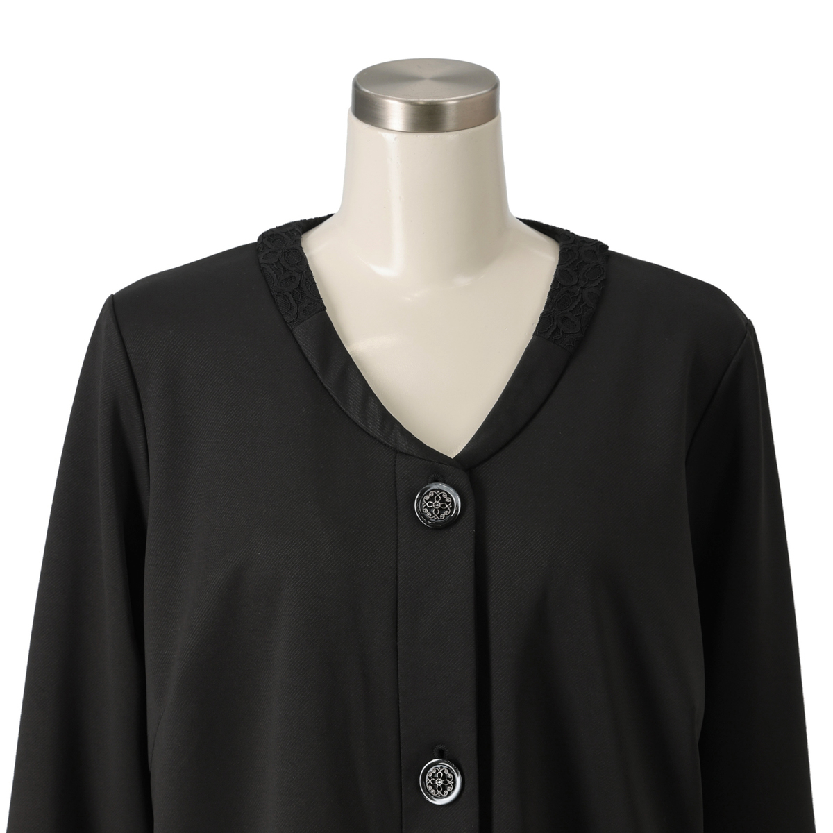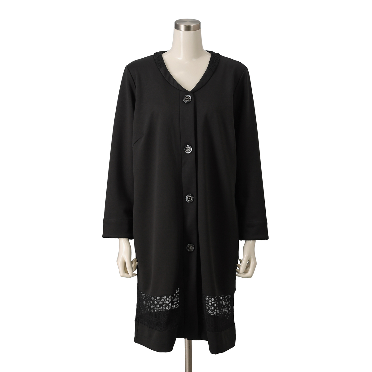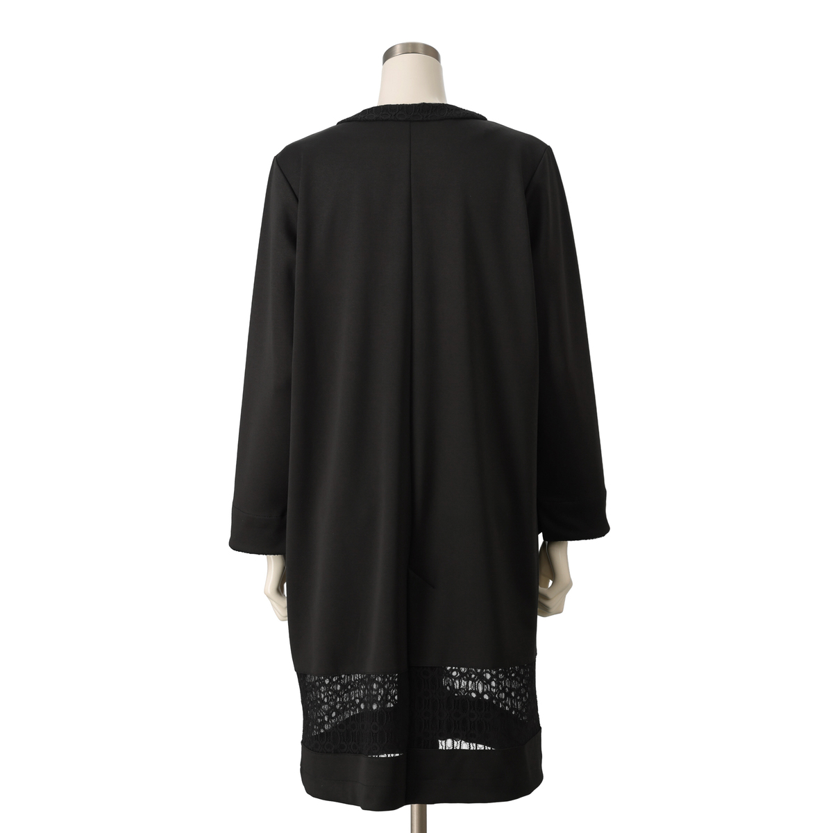 レースが印象的なジャケット。Vネックが首もとをすっきり見せ、組合せやすい上品な仕上がりです。首周りを包むレースがほどよい華やかさを添え、裾に施したレースで軽さを演出。ロング丈でも扱いやすく、カーディガン感覚で気軽に羽織れます